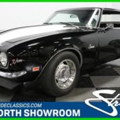 This 1968 Chevrolet Camaro Z/28 Tribute will afford some lucky classic car enthusiast the rare opportunity to get behind the wheel of a sharp looking, strong running first generation specimen of one of the most pivotal models in modern automotive history at a great price. Even better, this Camaro's road readiness offers plenty of fun-filled miles in its already attention getting condition. It's easy to forget that the Camaro was a fairly late entrant into the muscle car wars that had taken center stage among performance-minded car buyers by the mid-'60s, but one quick glance at this '68's first generation form provides plenty of evidence that Chevy got things right the first time around. That winning "long hood, short deck lid" plays out to great effect here and the black paint, ornamented by broad white painted stripes down the cowl hood and deck lid, provides a killer look. There's no doubt that this vintage Chevy will turn plenty of heads in its present condition, but a little wet sanding would definitely take things up a notch. All its badging, including the Z/28 emblems positioned on the front bumpers as a nod to this car's upper crust Chevy inspiration, are securely in place and the cabin is surrounded by clear glass that features rubber seals in good condition. The interior was nicely restored a while back, and definitely has a lot to offer. The black vinyl covers on both the front buckets and rear bench seat show very little wear, with plenty of padding left to indicate they haven't seen a lot of use over the years. Resting between the buckets, the center console is in very clean condition, featuring fresh woodgrain inserts that surround its white balled Hurst manual shifter as well as the four AutoMeter gauges positioned just a little farther forward that join the new-looking counterparts residing in the instrument cluster behind a woodgrain steering wheel. A supple-looking, crack-free dash pad - always a welcome sight with UV sensitive black upholstery - runs the width of the cabin just above. The trunk area looks to be in good order, with clean vinyl lining its floor and a fresh rubber gasket sitting just below its deck lid to keep the elements from intruding. Anxious to get out on the road and enjoy yourself? You'll have no problems here. The 350 cubic inch V8 under the hood starts very easily and runs smooth, sounding out a strong, even exhaust note in the process. It sits in an orderly engine compartment, surrounded by fresh hoses and orderly wiring wearing a chrome Edelbrock air cleaner over its matching 4-barrel carb and intake manifold, as well as a pair of chrome valve covers on its sides. The powerplant teams with a 4-speed manual transmission that's shifting with precision to provide just the "hands on" vintage driving experience a classic like this deserves while a look below will show a solid undercarriage. Smooth power steering makes this Camaro an easy navigator, while power front disc brakes provide dependable, fade resistant stops as this coveted Chevy cruises on a set of 15" stock wheels wrapped with all season radials. Sound, strong running first generation Camaros aren't very easy to come by, so this 1968 Chevrolet Camaro Z28 Tribute is a welcome find. Call today!