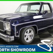 With its exterior modded for a timeless appearance and original big block power holding court in its engine bay, this 1976 Chevrolet Silverado C10 is not only a sturdy vintage truck filled with more than its share of nostalgic appeal, it's also a smooth running ride that's ready to provide miles of dependable service in an attention-getting package for its next lucky owner. Its exterior strikes a nice visual balance, with a look that effectively blends local car show flash with modded vintage charm. Its dark blue metallic shade is a good fit for this classic workhorse, a nice deep color carrying a good shine that's ornamented with pinstriping that provides a custom, aftermarket look without detracting from its rugged identity. Up front, the billet front grille and vented hood are certainly attention-grabbers, with the grille level and blemish free between a pair of LED headlights surrounded by very clean casings. In back, the lift gate is punctuated by more extensive pinstriping that sits above a nice stretch of clean chrome, with the modified dual exhaust emerging just below. This Chevy's stance is lowered to give it more custom cachet, but still provides the ground clearance you'd want while navigating everyday driving situations. Thankfully, a good amount of attention was paid to proper body alignment during this truck's modification, so despite its custom look, you'll find no protruding panels or uneven gapping that can otherwise render opening and shutting doors and hood a chore. Featuring velour-clad upholstery that began life in an '80s era Buick Riviera, the interior is as distinctive as it is welcoming. The bucket seats feature button tuck surfaces and have all the padding needed to provide comfort during the longer treks, and their nostalgia-inducing pattern is matched by the snug fitting headliner above. Sitting just in front of a very nice Grant GT steering wheel, the dash has been thoroughly refurbished, featuring its own button tuck covering and a fresh-looking woodgrain panel insert that surrounds an assortment of clear, easily readable gauges. There is a nice assortment of comfort features included that will really come in handy while on the road, including air conditioning, cruise control, a tilt column, cruise control and power seats - the latter of which is a welcome option not often found in trucks of this era. The bed area in back remains clean and straight, lined with carpeting and featuring a bed cover over the top whose pattern matches that of the interior. The show-stopping engine bay beneath that vented hood features an array of great details. It's a very well-organized and tidy setting, and inside its pinstriped walls you'll find an impressive assortment of chrome components. Sitting at its center is the same 454 cubic inch V8 this venerable truck began life with, and it continues to represent itself well, carrying an Edelbrock 4-barrel carb on top, firing right up and running smoothly. It's paired with a 3-speed automatic transmission that offers secure, slip-free shifting. Power brakes - with discs up front - as well as power steering are two more features that add to the easy-driving streetability of this pickup, which rides on a set of 17" Intro wheels, wrapped with Goodyear Eagle tires. With its inspired refurbishment and strong running drivetrain, this 1976 Chevrolet Silverado C10 is one street-ready conversation piece. Call today!