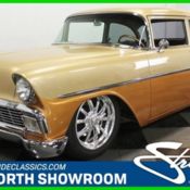 The mark of a true craftsman is how invisible he can make his work, and nowhere is that more evident than on this 1956 Chevy Bel Air. Despite its extensive mods the car remains instantly recognizable, and given the quality of the workmanship, you won't find many other shoebox Chevys that can stand next to it. At first glance, this car still looks like a '56 Chevy, right? Get a little closer, however, and you start to notice a lot of little tweaks, because there's not a single part on this car that hasn't been massaged, tweaked, and customized to make it one of the most spectacular machines we've ever featured. It's just gorgeous from any angle. The changes are seamless and work well with the other details like the shaved hood ornament and smooth deck lid, both of which kept the stylized 'V' emblem to emphasize the V8 power inside. Check out the way the bumpers tuck in ultra-close to the body and the beautifully rendered trim that looks simple but completely defines the car. The gorgeous gold over butterscotch paint job is subtle, sophisticated, and elegant and will never go out of style, making this a car that grabs your attention not by shouting, but rather by whispering to you in the most seductive voice possible. Paint and bodywork are just amazing and while we don't like to mention the word "perfect" around our showrooms, this car gets pretty darned close. Someone spent a ton of cash to make this car look so special. If you thought they'd phone it in on the interior, guess again. Featuring beautiful custom buckets, it's got a few traditional touches but a modern sensibility. Materials are top quality throughout and they were careful to make the door panels look like the originals. A custom center console houses a set of cup holders and auxiliary gauges that match those in the dash, and they're elegantly color-keyed to the rest of the car. The custom steering wheel looks a lot like the stock 1956 Chevy unit but has been painted bronze and gold to match the overall theme. Beautifully bound carpets feel plush and luxurious and it's been filled with all the luxury items from powerful A/C to power windows that glide up and down with a touch of the original handles to a powerful AM/FM/CD stereo system. It's clean, sleek, and very well finished so that you can't see where the stock stuff ends and the custom work begins, which is always the mark of a professional at work. Even the trunk is finished in such a way as to make you wonder if that's how they did it in 1956. Small block Chevy power is a given, with this car packing a modern tech LS2 V8 with fuel injection and all the modern upgrades. Custom engine covers painted to match the body make the LS powerplant look like it was born there, and with custom sheetmetal work throughout, the engine becomes a piece of art on a background rather than just a machine. Hidden plumbing and wiring keep it clean and many of the metal bits were painted to match the car rather than simply chromed. Other upgrades include a 4L60E 4-speed automatic transmission, power rack-and-pinion steering, 4-wheel vented and cross-drilled disc brakes, a custom stainless steel exhaust system with Magnaflow mufflers, and an A-arm suspension that's been lowered enough to give it that aggressive look. The underside is as detailed as the rest of the car, with body-colored frame, suspension, and brake components. The rear axle hangs on a 4-link suspension and the rolling stock is perfect, with 245/50/18s up front and 305/35/20s out back that really fill the fenders. Skillfully blending restoration and custom work isn't easy, but this awesome Bel Air delivers in every regard. We've never seen better and we're betting you haven't either. Call today!
