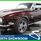 This is a super clean looking machine. Complimenting that iconic front end is nothing but a shiny Red paint job, an aggressive stance, and a bark to the exhaust that says more than a bunch of badges on the fenders or rally stripes could say. Check it out. Let's dwell on the RS front end for a moment. The hideaway headlights on the 68s look like a continuation of the grill. Simple, clean, trimmed out in thin chrome piping and underlined by a simple, pencil thin chrome bumper. It just doesn't get much better than that. The Red paint flows up and over the power bulge of the cowl induction hood and reflects the light off the crisp clean lines down the center of that hood and the tops of the fenders. The aggressive rake to the chassis is obvious from the side and the coke bottle curves of the body look great, especially on the rear fenders that bulge out to cover the back tires mounted on sweet looking REV wheels. Polished stainless discreetly trims out the wheel wells and the windows, and the back of the car ties things together nicely with a rear deck spoiler, an RS gas cap between the taillights, and another pencil thin bumper. Open the door and you will find a Black interior that is simple, yet set up for business. The door panel itself is Black with horizontal pleating and slashes of chrome across the top and bottom. The front bucket seats are comfortable with pleated seating surfaces and smooth side bolsters. Slide into the driver's seat and you will find a beefy steering wheel mounted on a chrome three spoke hub. In the center console is a Hurst dual gate shifter that looks like its ready for business. Reinforcing that perception is a trio of Sunpro gauges mounted just in front of it for keeping accurate tabs on water temp, oil pressure and the charging system as well as a Sun Super Tach to remind you to keep the revs within bounds. The rest of the dash is stock with a bit of wood-tone surrounding the radio and ventilation controls. Pop the hood open and you will find a healthy 350 cubic inch motor nestled down in a neat and clean engine bay. A chrome Edelbrock air topper looks good and sits on top of an Edelbrock 4-barrel carb and intake manifold. Chrome valve covers add their splash of flash to the engine bay while long tube headers wind their way out the bottom to dual Flowmaster mufflers and it all works together to make this car sound awesome. Power flows back through a 3-speed automatic transmission to the rear wheels mounted on leaf springs. Up front, control arms and coil springs keep things under control with some new components tightening up the steering and helping the car handle nicely. Front disc brakes insure that you can haul this ride back down from speed if you decide to let those horses run, and the rubber meets the road through 225/45/R17s up front and 235/55R17s in the back, all mounted on those great looking chrome REV wheels. A beautiful example of a '68 RS. Neat, clean, and healthy. Come on down and check it out.