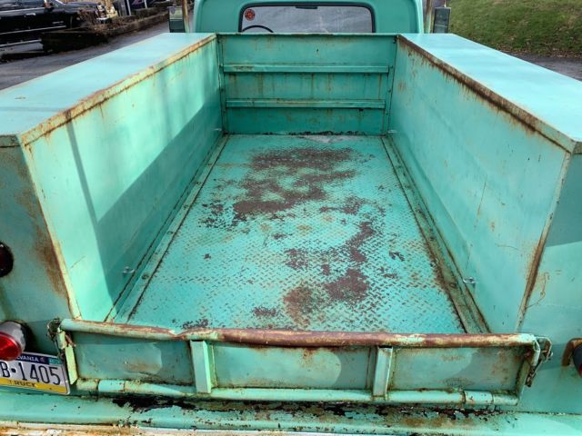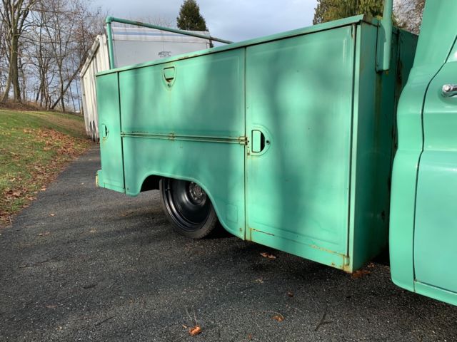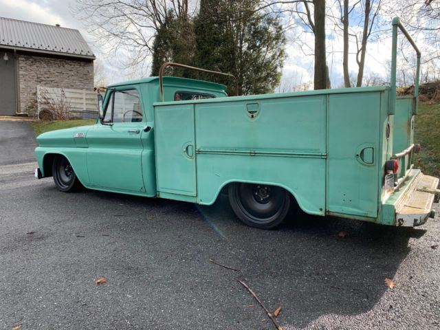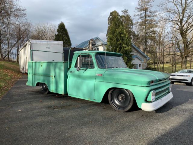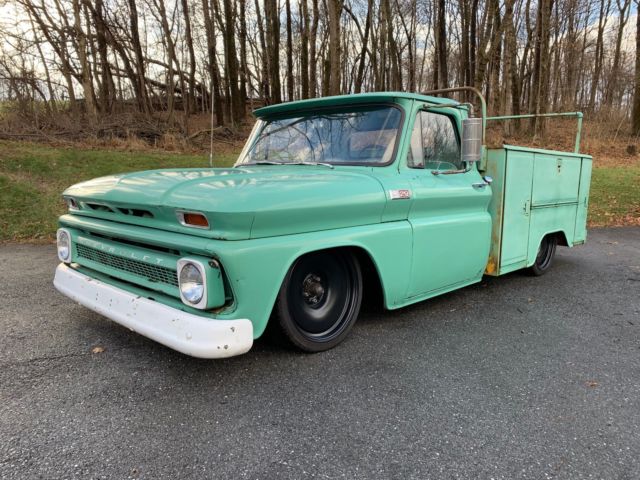 Up for sale is my air bagged 1965 Chevy shop truck. It's a really cool truck but unfortunately it doesn't get used very often and Idon'twant to see it sitoutside another winter. The truck has an old school manual air ride set up, Thomas compressor, and a 3 gallon tank with 3/8" air lines.The suspensionis from a 70's 5 lug C-10 with disc brakes. It has new ball joints, new bushings, new shocks front and rear, Firestone air bags front, slammed Specialties air bags in the rear, and all new brake lines front and rear. The rear axle is aposi 10 bolt from a later model C-10 5 lug with drum brakes. The rear of the frame has a welded in c-notch for clearance. The truck has a new gas tank, new fuel lines, HEI distributer, power steering, new speedway wiring harness, power brake kit from CPP, and new battery. The truck starts upevery time and runs great! It has 20x8 and 20x9 Detroit Steel Wheels with new tires. New door and window weather stripping was installed last winter. The glass is in decent shape with the exception of one cracked vent window. The body has some minor rust issues in the lower parts of the front fenders and drivers side door. Small pea sized hole in the drivers cab corner and a small area on the drivers side front corner of the hood. The cab mounts, floors, and rockers are in very nice shape. You can still see all the factory spot welds and are not full of body filler. I seam sealed and bed lined the inside floor of the cab and put down a new rubber mat. The seat has been reupholstered years ago but is in nice shape. The utility bed is a little beat up from years of abuse but that's part of it's charm. The four corner boxes have some rust issues on the inside but were plated with steel at one point in time from the underside. The bed floor is in good shape but there is some rust up at the bottom of the front panel. It's a really cool one of a kind truck. It's got a cool rat rod patina finish and would make a great truck for your shop or business. Slap your name on the side for great advertisement.*Truck is being sold in as is condition. I reserve the right to end this auction at any time.