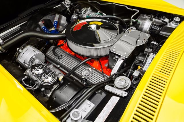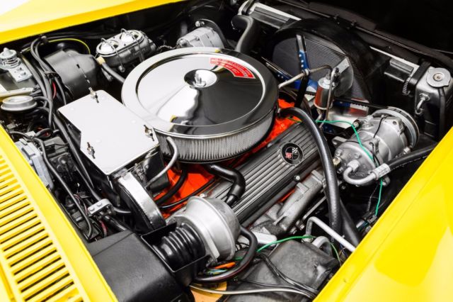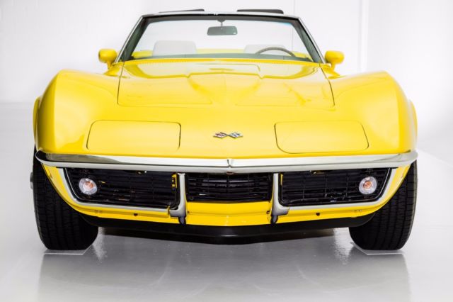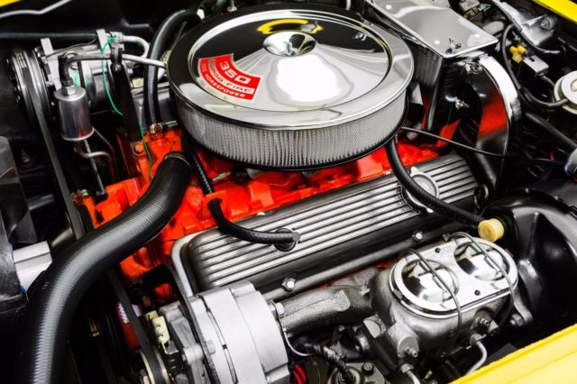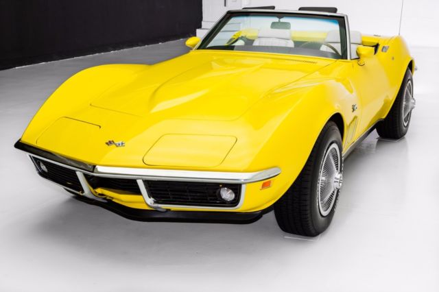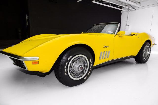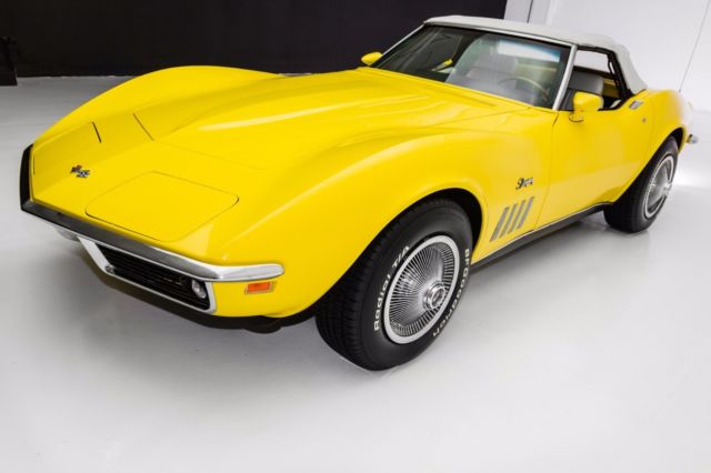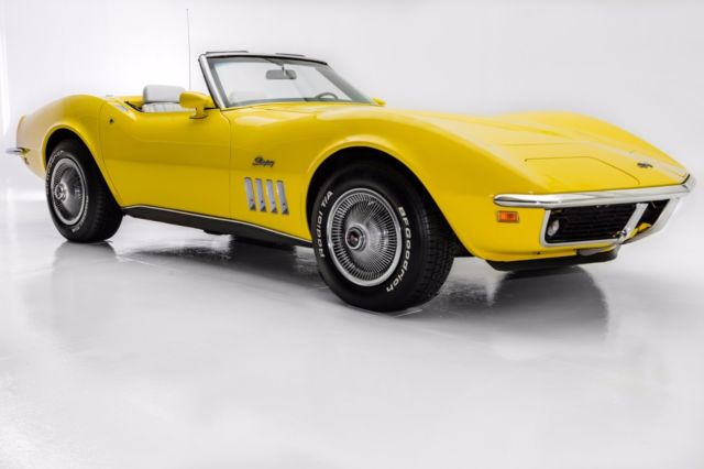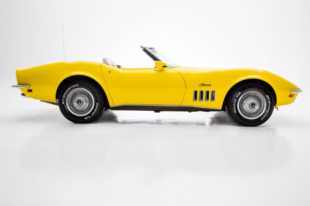 tunning Daytona Yellow 1969 Corvette Convertible with like new white interior and matching white top. This Bright Yellow stingray convertible Corvette is drop dead gorgeous and stands out in the crowd with beautiful body lines. No hassle with shifting gears with the three speed automatic transmission. Just get in and drive. Under the hood is a show quality engine compartment fresh crate350 ci engine, power steering for your driving pleasure and power disc brakes for easy stopping. We havereceiptsfor thousands of dollars inparts, serviceandthe numerous upgrades that have been done making this Corvette a pleasure to drive. This roadster is rolling on rare corvette turbine wheel covers and looks awesome. EXTERIOR: