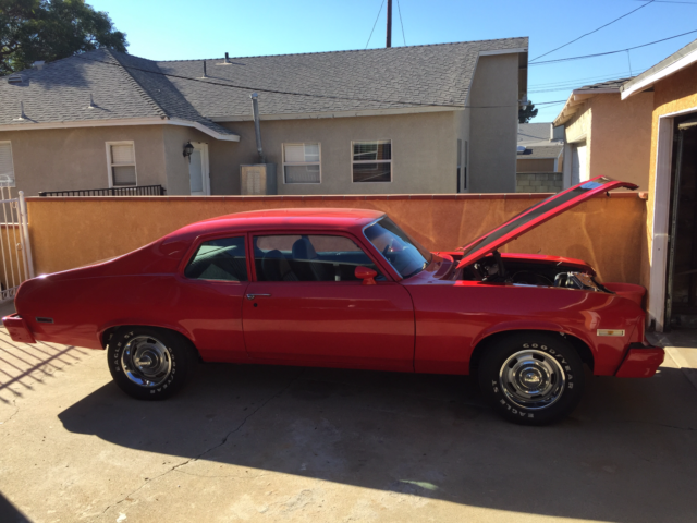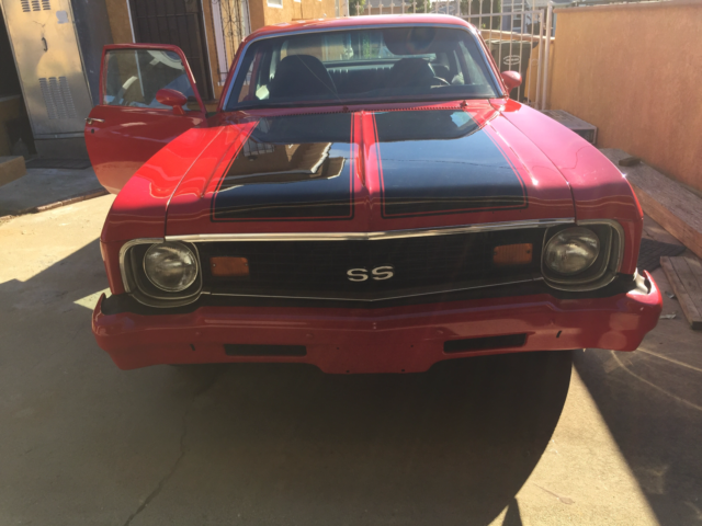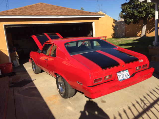 Here is a clean 1973 Chevy SS Nova with a rebuilt 1970 lt1 350 with Edlebrock carb, headers, 3 1/2 exhaust, 700 automatic transmission with overdrive new Magnaflow dual mufflers. This car has a Richmond posi traction and Richmond 373 gears .The car was recently painted and is always kept in the garage. Interior has also been redone, fuel lines and break line,rotors and break pads and disc where replaced as well.The nova has 4 core all aluminum radiator, power steering and red top optima battery. Has a brand new Kenwood radio but needs to be hooked up to speakers. I didn't hook the radio up because I didn't want to cut holes in the new interior. The car also need to put front bottom molding on the front window and inside passenger sun visor. This Nova is a good running car with nice power and fun to drive.This car is head turner and a rust free California Car. I'm selling because I have other project I want to complete. Thanks for looking and good luck. Please feel free to email with any question that you may have. Buyer is responsible for shipping.