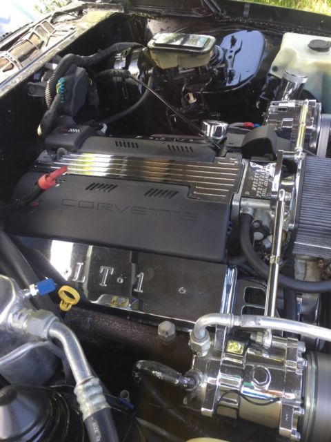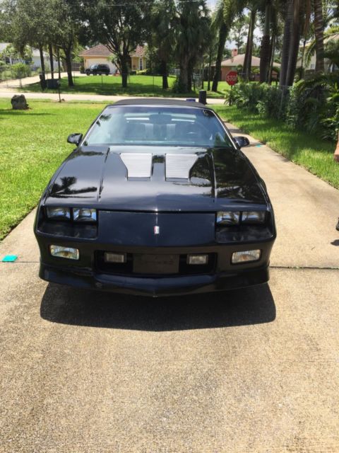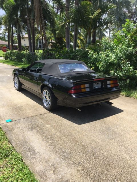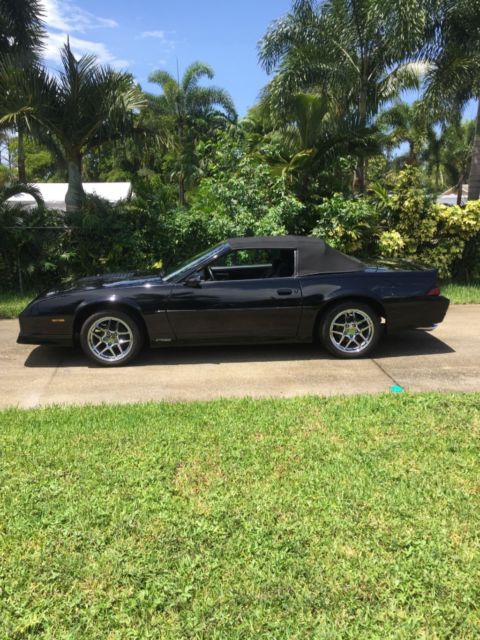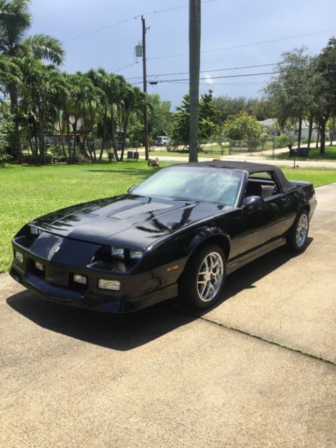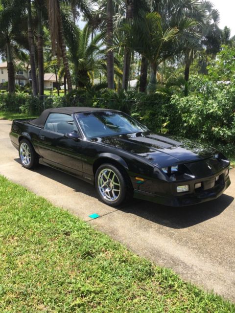 1989 rs Camaro Convertible with a fuel injected lt1 350 the engine is 30 over with new crank, pistons, mild cam and lifters, aluminum heads with roller rockers. In order to retain the functionality of the air conditioning all the accessories and brackets were replaced with SPEED AND PERFORMANCE chromed billet aluminum brackets and pulleys. SPEED AND PERFORMANCE also supplied the chrome alternator, power steering pump, a/c compressor, valve covers and manifold dress up kit. Over ten thousand invested in the engine and accessories. The transmission is a 4l60e and the rear is a fourth gen with a 3:73 posi and disc brakes. The engine breaths through 3" exhaust with dual tail pipes. The frame is reinforced with custom tubular frame connectors. The wheels and tires are chrome 17" with less than 5000 miles on them. The interior has new seat covers, carpet and custom door panels. The cloth Convertible top is new. The stereo consist of an am/fm cd dvd MP3 player with a flip up monitor. The trunk holds the amplifier and kicker speakers.