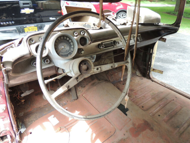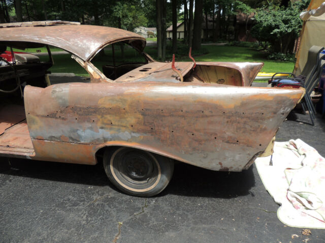 57 Belair, 2dr hdtp, No Motor Tranny or front seat, Frame is good with no rot. Body has rust but not that bad. Left floor pan needs to be replaced. Right is good. left inner rocker needs replacing. 1 floor brace end on right side is rusted. 2 floor braces on left side are bad. trunk is good, shock mounts are good.. New gas tank. Front fenders aren't bad. cowl is rot free. front window channel is rust free, rear window channel has some pin holes in a 3'' area. All the stainless comes with the car and is in good shape. it's just missing some of the rear quarter side trim. The rear quarter top and Gas tank door trim is good. Front and rear Bumpers are rusted and will need to be replaced. Plan on replacing all the front and rear chrome, front windsheild,and side glass.The Vin is VC57B182264. It is a V8 car. I know the car looks bad but it took me 5 years to find one that wasn't totally rotted.