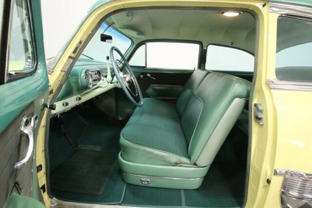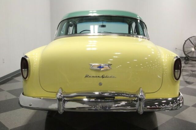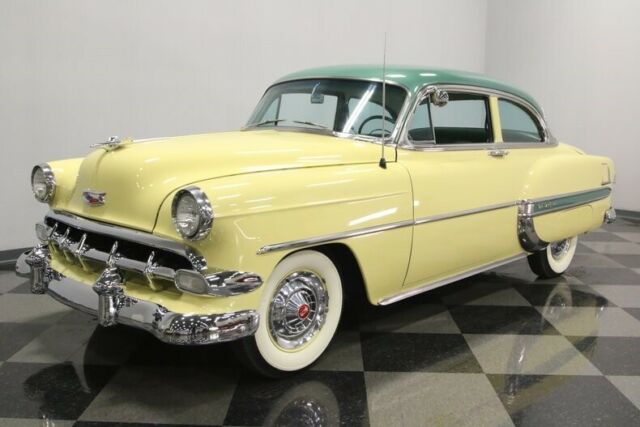 Looking for inexpensive fun with high style? This 1954 Chevrolet Bel Air sedan might just be the ultimate example. A great combination of originality and tasteful restoration, it's built to drive regularly without erasing its original personality, and we like that quite a bit. In today's world of hot rods with the same-old, same-old going on underneath, finding a mostly original car like this can be very refreshing. It's basic, no getting around that. Simple in Fiesta... Cream and Bermuda Green, with a two-tone interior and a couple of choice options, it was probably one of the most desirable of the "cheaper" cars on the lot back in '54. Nevertheless, it was someone's daily transportation back then, and it was reliable and plenty stylish, and today it stands out as something special, even when surrounded by younger, flashier, more option-laden Tri-5 siblings. The correct repaint has a very authentic look over some clean original sheetmetal that probably needed little more than a good scuff to be paint-ready. It's not show-quality, but the whole car has a period look that's very charming and which shines up beautifully. There's never been any rust on this car from what we can tell, and it's probably the kind of car that the original owner proudly bragged about washing every Saturday afternoon. All the chrome is newer and even though some of the aluminum trim is original has some light scratching and a ding or two, it's a great barometer of the quality process in the 1950s with nice detail and a deep shine that only comes from spending real money to restore it properly. The no-frills interior is actually a pretty nice place to spend some time, with handsome green vinyl and cloth upholstery and supportive seats that were designed for all-day comfort. Everything on the dash, including the instruments and metal grille that hides the original AM radio speaker, is in incredible shape for being almost 65 years old, and we believe everything but the headliner and carpets is original. The gauges are fully functional and still clear and legible, and original wheels rarely look this good after six decades. The Bel Air got carpets instead of rubber mats, so it feels a bit more luxurious than the usual bargain-priced beaters, and the beautiful door panels suggest that style mattered in every Chevy, not just the expensive ones. The spacious trunk features an original-style rubber mat and a bias-ply spare tire that looks like it might have been installed there in 1954 and not touched since. Chevy's dependable Blue Flame six was the only powerplant available, and with 235 cubic inches, it was torquey and smooth under all conditions. Further evidence of this car's dedication to the past is found under the hood, where it shows proper blue engine enamel, a correct oil bath air cleaner, factory carburetor, and no signs of any of the period speed parts that many Chevys of this vintage often carry. It is neatly detailed and quite stock, even down to the original 6-volt electrical system. A 2-speed automatic transmission was optional equipment, and the column-mounted shifter is simple to use with a clear gear selector display. Regular service to the suspension and brakes throughout the years mean that it drives extremely well, there's a newer exhaust system, and there's something about the way an all-original car drives that's simply impossible to replace during a restoration. Flashy Bel Air hubcaps are always a welcome site, which work well on the stock steel wheels and thick whitewall bias-ply rubber. Bargain-priced or not, someone loved this Chevy. Today, it's a remarkable specimen that will impress not with its flash, but with its honesty. Call today!