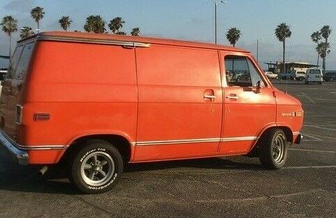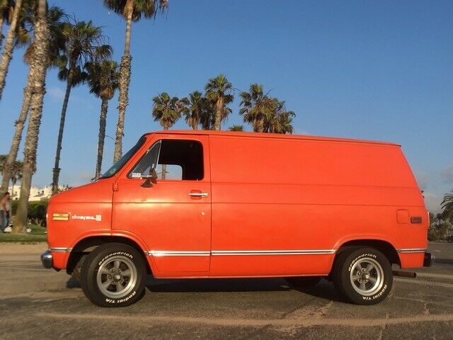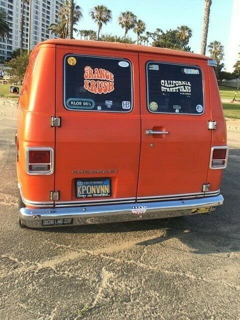 "ORANGE KRUSH" is notorious on the streets of Southern California, and an icon in local van culture, owned by founding member of CALIFORNIA STREET VANS. It is an Original, 1972 Southern California G10 Survivor custom Chevy "Shorty" van. A pure 70s street machine or "boogie' van. The original 350 has a respectable low rumble out the old school glass pack dual exhaust. Yes, that is dealer installed AC, and compressor is free moving but has not been charged in several years. It rides on nice set of vintage American Torque flight wheels and BFG white-letter TA radials. Tires are good but they are starting to show some age. The exterior is straight, with deluxe trim and is "uncutâ€, meaning it has no port hole or camper windows, no sunroof or air vent either. By not having those features, the original groovy shag carpet, matching velour and chocolate naugahyde interior remain in fantastic shape. Unique interior: