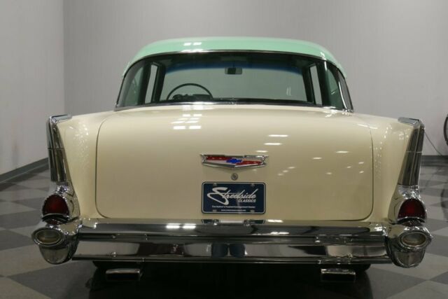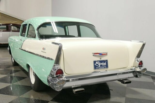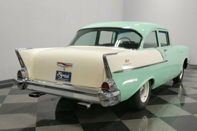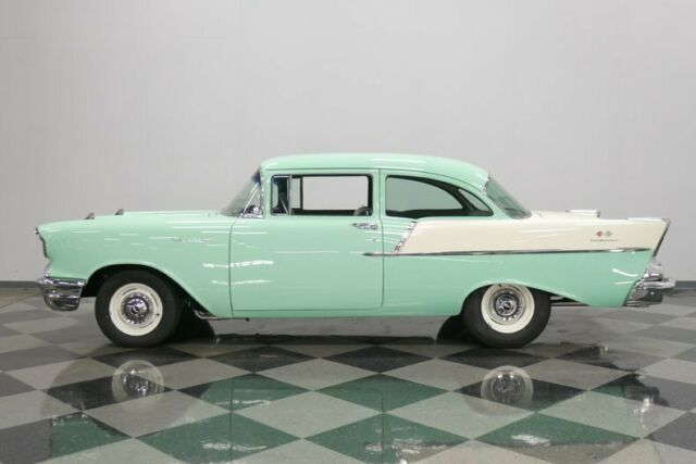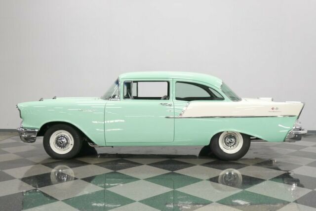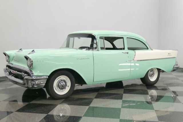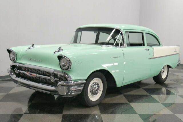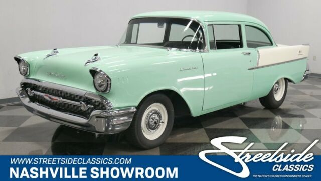 There are very few classic cars more iconic than the '57 Chevy. Its very mention conjures up images of memorable car scenes from the big screen and a long list of universally revered songs. Combining a classically attractive two-tone color scheme, a very "cruise-friendly" interior and a drivetrain that's functioning at the top of its game, this 1957 Chevrolet 150 Utility Sedan has been taken up a few notches, and is ready, willing and able to hit the boulevard and... car show scene right away. Two-tone paint jobs are certainly nothing new on classic cars, especially vintage Chevys, but you don't often see shades as nice as the combination of this teal accented with white. It's an effective choice - distinct and period classy. There are some pretty obvious reasons why the full-sized Chevys of this particular year are so prized for their styling, which was ironically due to undergo a major change this very year that was fortunately delayed. They're such stout, capable looking cars to begin with and that sturdy, dominant front grille, the rocket emblems resting on top of the hood to point the way forward, and the long stretches of chrome running the lengths of the back fenders all combine to create an unrivaled, high impact classic car appearance. Fortunately for a car carrying such a vast array of chrome, all pieces are present and accounted for and are in excellent condition, providing a glistening contrast to the pastel teal that dominates the bodywork. The interior is very inviting, offering a fully restored cabin that offers more elegance than you'd ever find in a 150 from the factory. Because this is a Utility Sedan, you'll only find a seating area up front and the vinyl upholstery on that bench seat is in excellent condition, adorned with a pattern that is replicated on the door panels. Just beyond the restored original steering wheel, a set of new gauges glisten in their factory pods, and they're augmented by a set of auxiliary gauges under the dash and a tachometer strapped to the steering column. Once again, this is a 150 Utility Sedan, which means zero options, to the point that its even factory spec'd as a radio/heater/wiper delete car. Yet sitting inside this 150 feels just as good as the Tri-5 resto-mods we have in our inventory, with the best part being the Hurst floor shifter that beckons the driver to hammer through some changes. Owing to this 150's generous proportions, there's plenty of room inside, which is a good thing, as you'll have no shortage of willing passengers to ride up front when you take this rolling nostalgia machine out on the road. There's also an abundance of cargo/luggage room in the very spacious rear and trunk area in back, along with a full-sized spare in the trunk sitting securely stowed off to the side in its recessed position. This is one classic car that will be poised to hit the road as soon as you get it home. The 400 cubic inch V8 roller motor nestled neatly in the engine bay has been built to brawl, augmented with stud girdles and a healthy cam, and fed through a Demon 4-barrel carburetor. That built small block is paired with a big-shaft Muncie 4-speed manual transmission, which is truly a match made in heaven that really takes advantage of the engine's power. The powerplant sits in a very clean engine bay that features a lot of nice dress-up pieces, including a well-proportioned radiator with a chrome cap, a polished pulley, finned air cleaner and valve covers, and a newer dual master cylinder. Long-tube headers feed a throaty Flowmaster dual exhaust system that empties underneath the rear bumper, and all the bushings underneath are new. In fact, the entire undercarriage is restored and nicely presented, including the original '57 rear end. This rare vintage cruiser sits on beautifully painted steel wheels adorned with period-correct hubcaps, all of which are wrapped in staggered 205/70/15 front and 235/70/15 rear blackwall radials. Looking to put a road-ready, fun-to drive classic in your garage? You have to check out this 1957 Chevrolet 150. Call today!