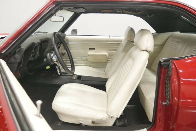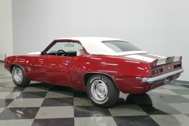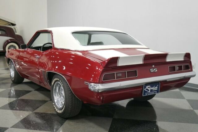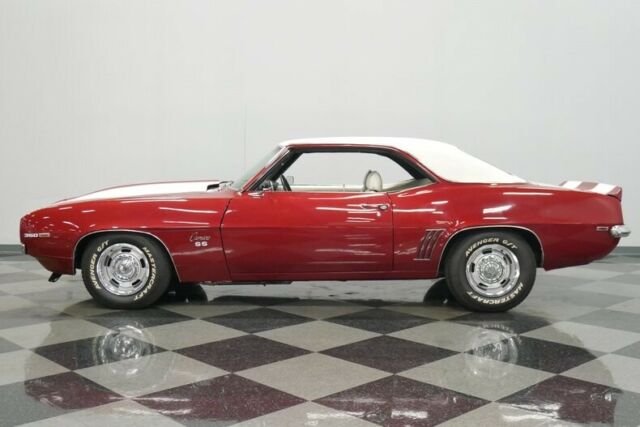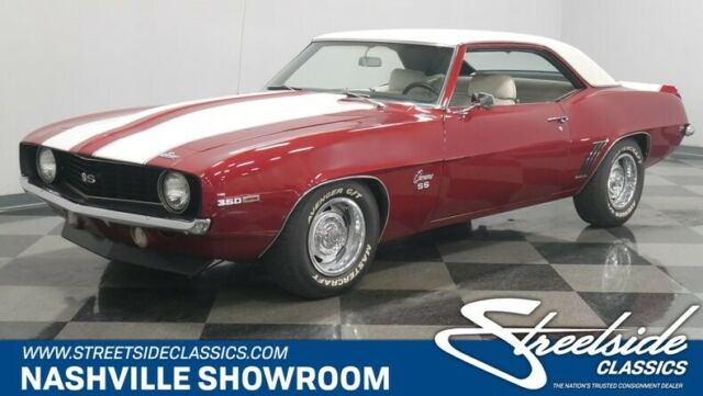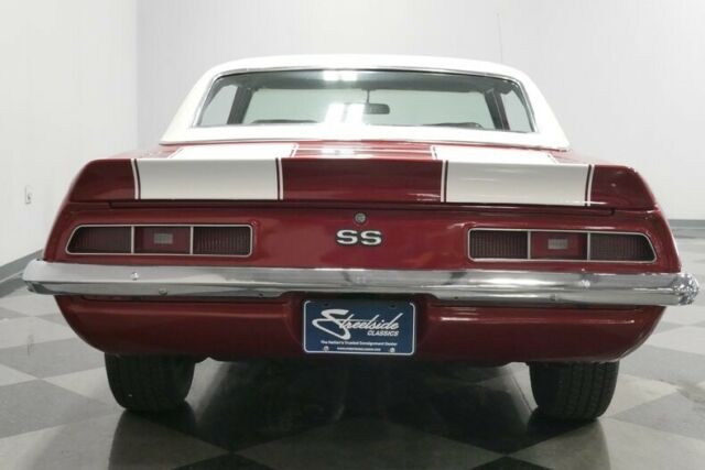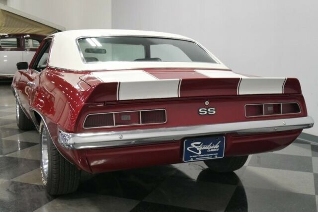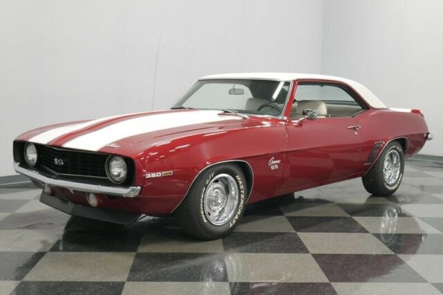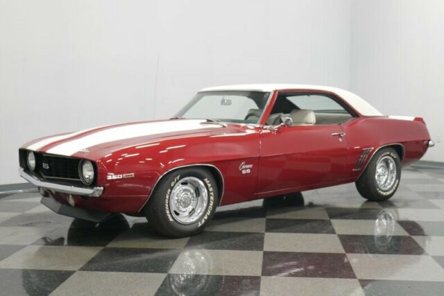 If you like to drive, small block Camaros are what you want. Cars like this 1969 Chevrolet Camaro are nicely balanced, with great handling and acceleration that still intimidates other drivers on the street, all without the fuel economy penalty of a big block. This fresh-looking hardtop offers all the virtues and few of the vices of an early F-body. Repainted to a professional standard, this car really sparkles. The burgundy finish is a great choice today... as much as it was in 1969, and with a bright white vinyl top, it's about as sophisticated as it gets in the muscle car world. Somehow this one looks longer and sleeker, perhaps due to the added white SS stripes that are less dull than the usual black, or maybe it's the stance, which is more road race than quarter mile. It proudly wears '350' badges on the front fenders, along with the requisite SS emblems on all four sides. A cowl induction hood, chin and deck lid spoilers, and the perfect stance give it a performance look that works. Finish quality is quite nice and the 1969 Camaro sheetmetal doesn't tolerate sloppy workmanship with that sharp crease running along its flanks, so this one looks pretty darned good in the flesh. Shiny chrome bumpers, quarter panel inserts, and polished stainless window trim all add some glitter that sparkles against the burgundy paint. A white interior in a burgundy car with white stripes is striking and elegant combination, and with nice-looking seat covers, clean door panels, bright wood appliques throughout, and carpets that look fresh, the interior is ready to rock. Even what GM called the "standard" setup was pretty stylish, and with a center console and that horseshoe shifter, the Camaro becomes a pretty nice place to spend some quality time. It may seem strange to us, but even the SS models didn't get a tach or auxiliary gauges as standard equipment, so this one has just the basics guiding the driver. The original AM radio is gone, replaced by an AM/FM/Cassette unit and the original "Astro-Ventilation" vents are still in place as well. Out back, the trunk is tidily presented with spatter-finish paint and provides plenty of room for luggage and car show accessories. The reason we really like this Camaro is the 350 cubic inch V8 up front, which is hundreds of pounds lighter than a big block, improving handling and braking in a big way without a major sacrifice in acceleration. With an Edelbrock 4-barrel carb and polished intake up top, Accel coil, Z/28 style finned aluminum valve covers with matching air cleaner, and some Chevy Orange paint, it looks every bit the part of a hi-po bowtie. It's very presentable under the hood, especially because the inner fenders have been nicely painted in glossy black. Long-tube headers and a Flowmaster dual exhaust system give it a great V8 rumble that few other engines can match, as well as a fat torque curve. The TH350 3-speed automatic transmission snaps off shifts like rifle shots and the 10-bolt out back is built to take it. The front end appears to have been lowered to get that awesome stance, although the shiny Rally wheels and 225/70/14 front and 225/70/14 rear performance Mastercraft white-letter radials certainly help in that regard. If you've been looking for a great early Camaro, try bending this one into a corner before making your decision. You'll love the way it feels! Call today.