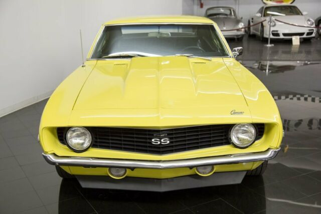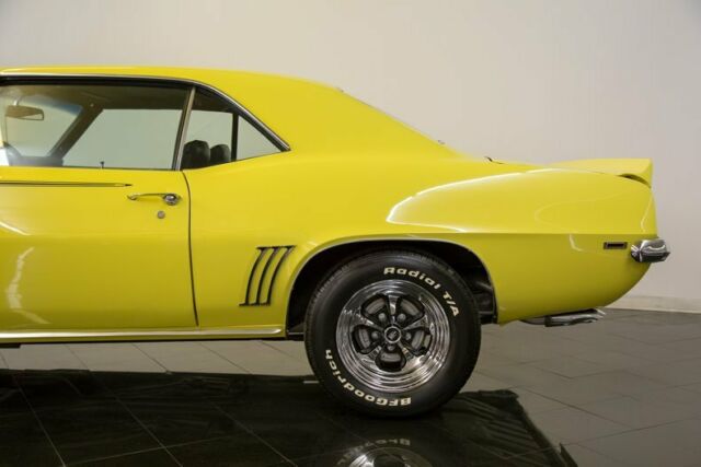Highly optioned big block 1969 Chevrolet Camaro SS Tribute For Sale with 4-speed, power disc brakes, power steering, SS equipment added, exterior trim group, 15″ chrome wheels, and more! Fully restored in 2009 and ready for car show season! The Camaro was Chevrolet's answer the ever-growing popularity of the Ford Mustang. Being introduced just two years after the Ford pony car, Chevy wanted to impress buyers with more aggressive body lines, multiple trim options, along with both big and small... block engine options. It instantly made a dent in Ford sales and continued to do so each and every year, igniting a new generation of the Ford/ Chevrolet rivalry. The final year of this first generation Camaro came about in 1969 and continues to be the most desirable today! Offered here is a sharply restored Los Angeles-built 1969 Chevrolet Camaro Sport Coupe dressed with Super Sport trim options! Refinished in Daytona Yellow with and Black vinyl bucket seat interior, it comes well equipped with favored options! From under the hood, power comes from a later generation 454ci V8, Muncie 4-speed manual transmission, and 12-bolt rear end! Options include power front disc brakes, power steering, sport steering wheel, cowl induction hood, chrome engine dress-up kit, Deluxe console with auxiliary gauges & dash tachometer, chrome 15" Keystone 2-piece wheels, front & rear spoilers, body sill molding, wheel lip molding, roof rail drip molding, quarter trim moldings, & blacked out tail panel, front & rear seatbelts, Delco AM pushbutton radio, "hockey" style side stripes, Soft-Ray tinted glass, and carpeted floor mats! Finished entirely in 2009 by Gary D's Automotive in Arlington, TX, a close look at this beautiful classic Camaro for sale shows base coat/clear coat paint, all new interior upholstery and padded carpet, fresh weather stripping throughout, new fuel system, all new braking system including parking park cables, original LOF side & rear window glass, BF Goodrich T/A Radial tires, all new exhaust, with special attention under the hood to showcase correct GM hoses, firewall inspection markings, and so much more! It presents itself as a beautiful L78 396/375 hp for period correctness while providing the next owner a truly drivable classic car investment! It now has ceramic-coated long tube headers, Flowmaster exhaust system with chrome tips, and Quick Fuel Technologies 650cfm carburetor atop an aluminum intake manifold for added power and outstanding sound! Upon arrival an inspection here at the St. Louis Car Museum, our experienced classic car maintenance team replaced the water pump, heater blower motor & dash control cables, installed new front ball joints, sway bar links & bushings, new rear shocks, as well as fresh coolant, new engine oil/filter, and new air filter. It is ready for the spring weather and summer car show season! Please feel free to call 855-586-3413 with additional questions or to schedule a chance to see this classic car for sale in person. St. Louis Car Museum & Sales can assist in providing information about trades, finance options or arrangements for transporting your next classic car investment!