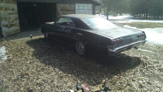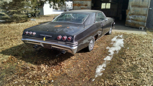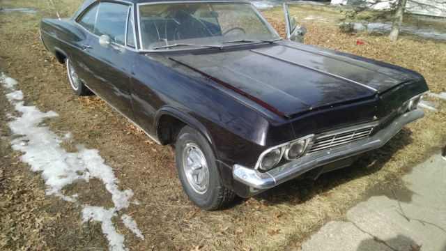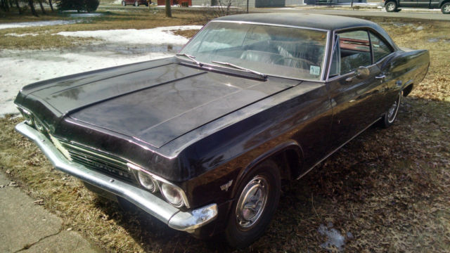 1965 Impala SS. Southern a/c car. Originally white/ red interior. Very amature. poor quality paint and body work. now black/ red. Has newer 350. bbl/turbo 350. Run well. Interior is average condition for it's age. Needs rear brake cylinder(may replace myself). windshield. heater core. passenger side floor plan(rusted thanks to neglect and heater core). Have heater core and floor pan. Some rust in trunk and lower right quarter. Think it's from poor weather strip and leaky antenna. Also needs wiring work. VIN breaks down to 1=Chevy. 6=Impala SS. 37=2dr sport coupe. 5=1965. A=Atlanta. 103365=sequence number