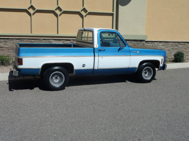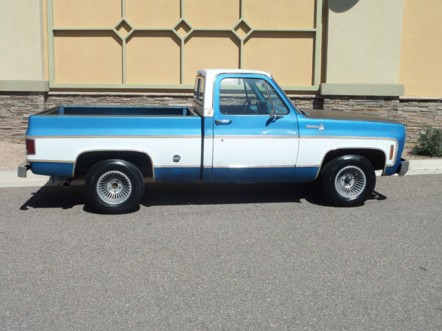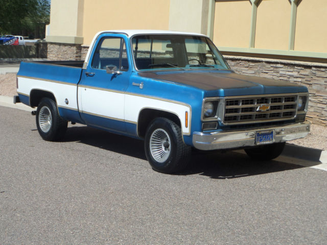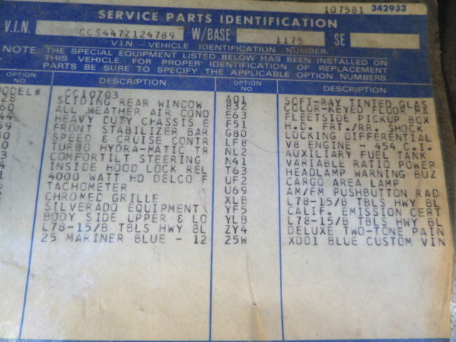 | You are looking at a 1977 Chevrolet Pick-up. This truck has been in one family since new. It is 100% rust free and is sporting it's original paint. It is a 454 Big Block. special order California truck. Power steering. Power Disc Brakes. tilt wheel. cruise control. AM/FM radio and cold air conditioning. This truck is extremely rare. when have you seen a loaded 1977 Short Box. with all the toys. including dual tanks. posi rear end. sway bars. etc. The truck runs. drives. steers & brakes excellent. It is 100% stock except for the seat upholstery and the rims. The engine runs smooth. The 400 turbo tranny shifts tight. The brakes stop straight. The AM/FM radio works. The factory Tach works. The air conditioning works. It needs: paint; it's faded on the roof and top of fenders. it has holes on the doors from trailering mirrors. There is little if any body work required on this truck. It is super. super straight. The doors close and open good. windows go up & down good. We have original paperwork that goes with the truck including; original pink slip envelope. warranty information card. factory Chevrolet punch card. factory 1977 service agreement from Fresno. CA where this truck spent it's days. emissions maintenance schedule book. owners manual with hand written oil change notes. factory GM HEI card and specification technical data card. This truck has been cared for it's whole life and I cannot name a 73-87 truck more rare. It's "Gold Trim" is a one year only option. Combined with it's rust free condition. there is probably just a handful of these trucks left in the country. Give me a call if you've ever seen one. So the truck is all there. needs a set of ralleyes or whatever. needs the factory seat upholstery. needs the pockets on the doors tightened up. and you could have fun driving and playing with it while it goes up in value as a very. very rare Chevrolet. Thank you. Roger 612-849-6350. Please call me as I don't check email very often. Thanks. |