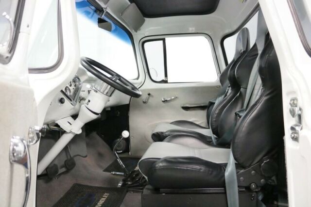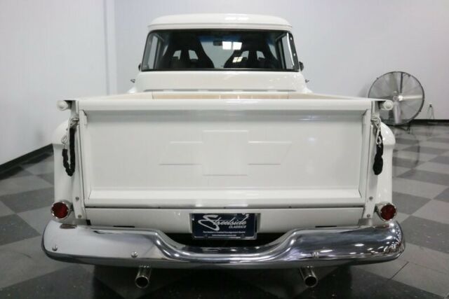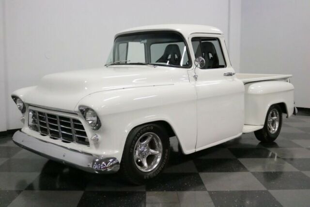 The recipe for success is easy: take one handsome 1955 Chevrolet 3100 3-Window pickup, drench it in elegant white paint, give it a comfortable and sporty interior, and power it with a potent small block V8. The results on this one speak for themselves, making this pickup a ready-made piece of full-sized fun. The white paint on this truck was done not long ago, and it shows very well today. Sure, it's not a perfect show-stopper finish,... but you'd be hard pressed to find any imperfections and overall it has a beautiful shine and a comfortable look that suits this higher-end pickup truck just fine. Totally traditional, white is the perfect color for the stylish Chevy hauler, which blends a bit of style with a ruggedness that defined Chevy trucks for a generation. Close examination will reveal great gaps and smooth body lines, all evidence that this truck was clean before the work started and that the guys in charge took their time. Crisp details like the raised hood edges and the bead along the rocker panels move beyond mere function, creating a truck that was as beautiful when it was empty as when it was hauling a heavy load. The slightly forward-canted cab suggests power and speed, which this truck delivers, and the stepside bed gives it a muscular stance. All the chrome is in very good shape, including the substantial bumpers fore and aft, and the rubber seals around the clean glass is in perfect shape. Beautiful oak planks with stainless strips and hardware in the bed warm everything up but if you're planning on hauling anything, bring something to protect it because it's just too pretty to beat up. The black-and gray cloth interior is just as neatly finished as the bodywork, inside and adds a touch of performance upgrades for the driver. They ditched the original bench seat and replaced it with two racing buckets with great bolster support and harness seat belts, which means bending a corner aggressively no longer means you'll be sliding down to the other end of the cab. Plush gray carpets with contrasting black vinyl floor mats help control noise and heat in the cab and replace the original rubber mat, helping to further the luxury truck image. The gauges are drop-dead gorgeous pieces from Auto Meter that fit neatly in the updated triangular instrument panel and offer a much more comprehensive view of the engine, and just ahead of them is a slick leather-wrapped LeCarra 4-spoke steering wheel. There's also a Sony AM/FM/CD stereo head unit that sounds pretty darned good and a Hurst cue-ball shifter for the 4-speed manual gearbox below, and R134a A/C was added to keep the entire cabin nice and comfortable. They even added a set of custom tweed door panels and speakers in the kick panels, making this a truck you could drive every day if you were so inclined. The 350 cubic inch V8 under the hood is a very strong motor with plenty of pop, fed by an Edelbrock 4-barrel carburetor and Edelbrock intake manifold for added reliability and performance. The block wears blue paint, and you can tell they focused on the details, because the clean inner fenders, chrome valve covers and matching air cleaner, and big aluminum radiator all suggest a truck that was built to look as good as it drives. Block-hugging long-tube headers funnel into a newer dual exhaust system with a great rumbling idle, and yes, that's an independent tubular A-arm front suspension with power rack-and-pinon steering and disc brakes at all four corners. The 4-speed manual is connected to a stout Ford 9-inch rear end, so it's still able to do some hauling on weekends if necessary. Stylish 5-spoke chrome wheels are a nice update and wear fat 225/75/15 Firestone white-letter radials that fill the big wheel wells perfectly. Beautifully built and lots of fun to drive, this 3100 is ready to enjoy and show-off without worries. Call today!