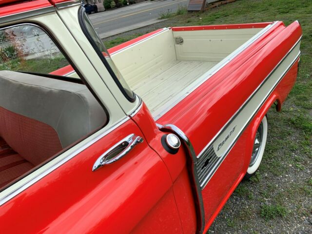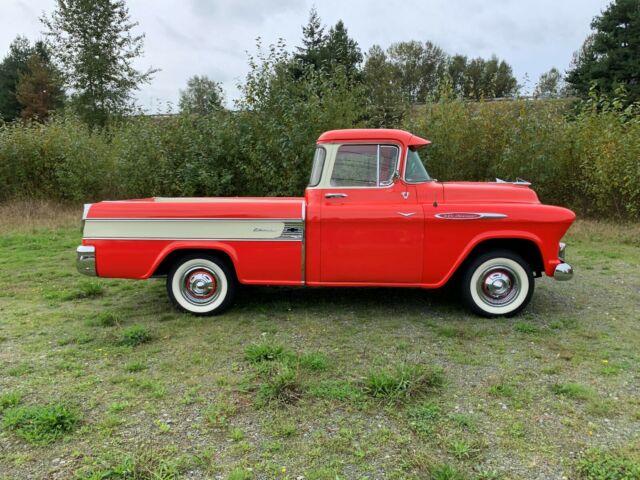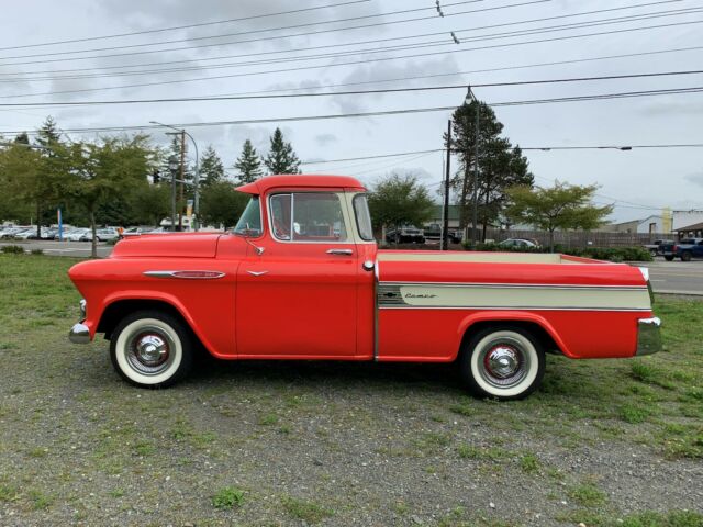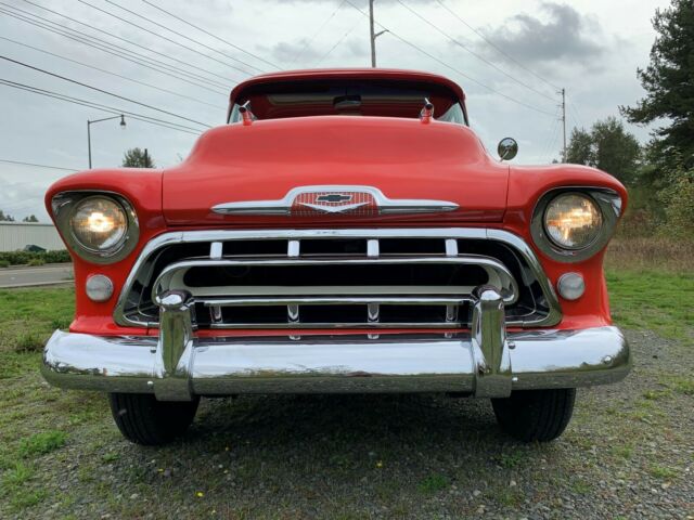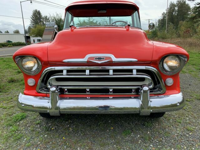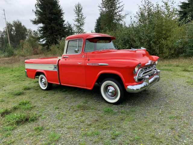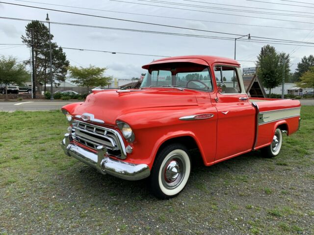 Click here for additional photos and videos 1957 Chevrolet pickup. Cameo 3124 clone, 58 front grill. Harder to find Daily Driver in a reasonable price range. Clean undercarriage, solid floor pans, even look to be origional, solid wood bed, solid frame rails and inner wheels wells, as seen in my undercarriage photos. Fresh 283 v8 small block, power steering, stock manual trans with Overdrive........ Gauges are in working order fuel, temp, oil. Speedo starts to bounce after 50mph as seen in my freeway test drive videos. Exterior lighting, electric windshield wipers, new heater. Exterior stainless and chrome are in good shape, glass is in good shape as seen in my additional photos and video's of truck. New carpet kit and a truck cover comes with truck. New tires, origional hub caps and beauty rings. Overall straight body, small rust spoted noted outer lower passenger side Cab pinch seam. I pointed out in my chassi photos. Small paint/rust bubbles starting on lower passenger door pointed out in demonstration videos. Passenger fender has been touch up in the past can be noted by color difference from door to fender. Nice 57 chevy truck, getting harder to find them in this driver maintained condition and that have not been a Full concourse restoration and high price range $$$. Runs and drive good as demonstrated on my freeway test drives. Great truck to go a bit further on if looking for more of a detailed show truck. Overall Solid truck. Thank you for your interest feel free to call me with questions. I have taken lots of additional photos and videos of truck for the best overall visual description. Th Brian wilson 1-425-931-6448