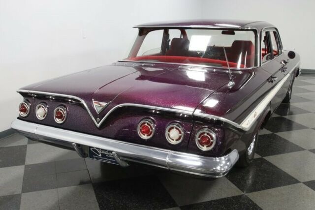 When you're looking for that turn-key classic that's distinctive, affordable, and can carry all your family and friends, this 1961 Chevrolet Impala fits everything you want and much more. One of the easiest ways for your classic cruiser to be instantly memorable is with the right paint. So if you love plenty of metallic element, then this one already has you hooked. The deep purple with heavy metal flake has all the appeal of the night sky just... before dawn breaks (so it's no wonder this cosmic look is topped off with half-moon wheel covers.) It's a very cool package, and you'll love this for more than just the paint. The full-length side trim is a sporty-looking spear. It also provides a direct connection to the trim that wraps around the rear. We love the trunk line that the dipping "V" design that you could only get it in '61. This one is full of sporty classic style, right down to the wraparound glass that's not only in the front, but also the rear, too! The exterior is not the only distinctive part of this custom classic. The interior is built to be both bold and comfortable. You see it best on the later model seats with plenty of comfy bolstering and bright red velour. This coordinates nicely with the door panels, carpeting, and dash. This is built to be a great cruiser with high-back bucket seats up front, a fold-down armrest in-between, and even a cup holder. You get a grippy Grant sports steering wheel, and the factory gauges are supplemented by a Sunpro package that includes an auxiliary readout trio and a large tach mounted on the steering column. Under the hood is proper Chevy V8 power. The 283 cubic-inch unit is correct for this era, and it even has the right detail, like the bold orange block and valve covers. A set of headers feed the dual exhaust to add an extra hit of power and enhanced sound. This one feels good out on the road, and that's thanks to the right "power" features, like the Powerglide automatic transmission, power steering, and upgrade to power brakes w/discs up front. The right features and a great V8 sound make this a custom cruiser with true go-anywhere appeal. So at a price like this, you know you need to hurry on this deal. Call now!