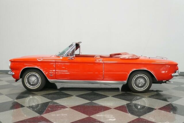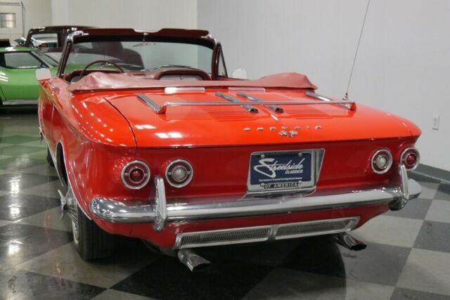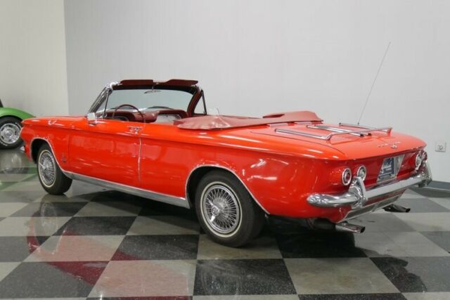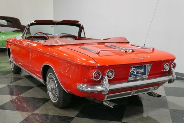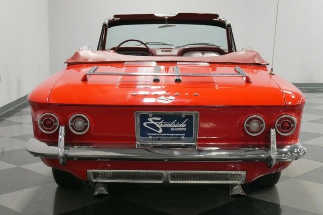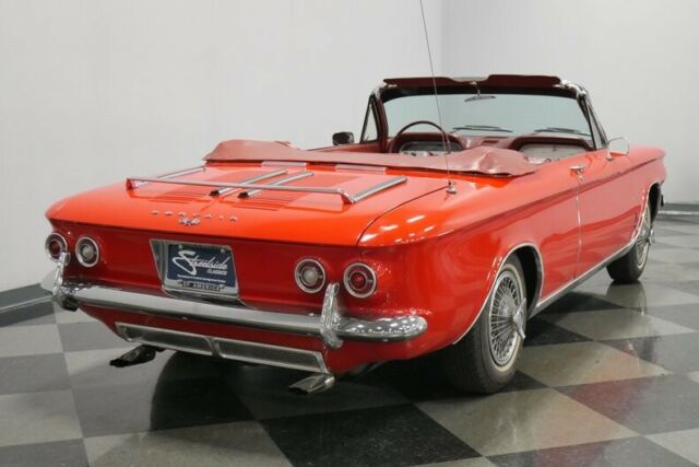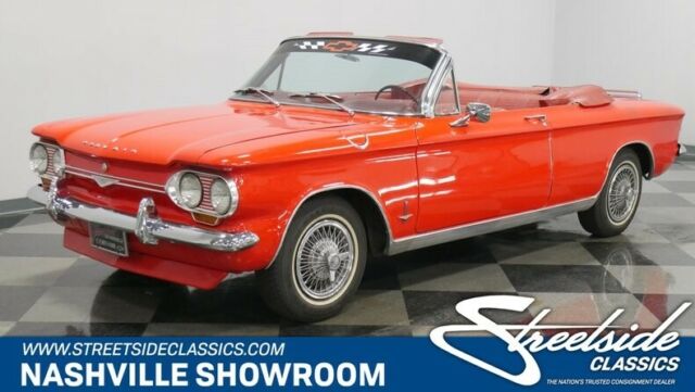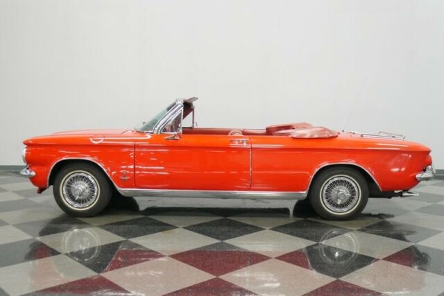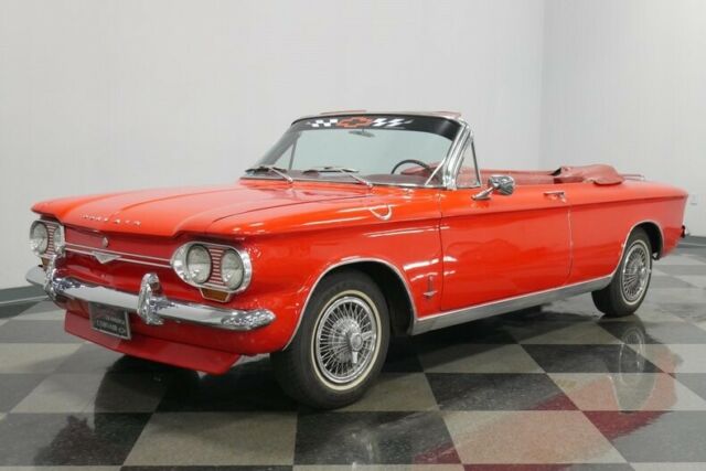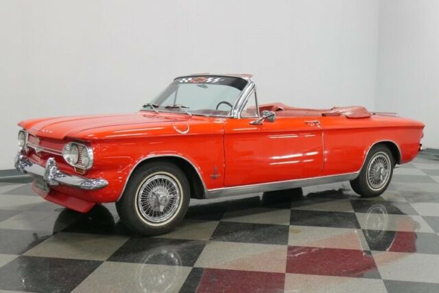 The Corvair always marched to its own drummer, and today it's probably the most underrated collector car of them all. With great performance, stylish good looks, and impressive economy, it's a great hobby car for our times. This 1964 Chevrolet Corvair Monza convertible in brilliant red makes for a wonderful summertime cruiser that is just unusual enough to generate a ton of attention. It really is hard to go wrong with a bright red ragtop, and the humble... Corvair delivers a funky 1960s look that always attracts attention. You can see shades of the Bel Air in the rear 3/4 view, there's a hint of the upcoming Camaro in the profile, and for an inexpensive car, the stylists seem to have put in a few late nights making it look right. The restoration continued that legacy, giving it a better than average finish, and the bright red paint shines better than anything they were spraying in the '60s. That crease that wraps around the body runs in an unbroken line across every panel on the car, and they all line up neatly, so a good amount of time has been invested in the fit and finish. The Corvair, of course, has no need for a grille, but the trim up front looks great, the chin spoiler adds a sporty element and the rest of the brightwork that is on the car has been neatly polished, including a set of chrome bumpers and rear valance trim that sparkles beautifully against the red finish. Inside, the Corvair offers room for five thanks to a handsome bucket seat interior. We wouldn't be surprised if the upholstery on the seats is original, but it's in very good shape with only minor signs of use, and the matching door panels and carpet present very well too. Thanks to the rear engine, the floor is completely flat, adding valuable legroom front and rear, and nobody will be complaining about spending an afternoon in the back seat. Gauges are sensible and basic, and although the lens is a big cloudy after nearly 50 years, all of them are fully functional. The original AM radio is remarkably still in the dash, and if you're wondering where the shifter is, take a closer on the dash and you'll see that this is a rather rare automatic model, which makes this Corvair a blast to drive around town. With the engine in back, the front trunk is spacious, wearing a fresh coat of gray spatter finish paint and a reproduction rubber mat. You're also in luck because in 1964, the Corvair got a larger engine, thanks to a longer stroke. Now displacing 164 cubic inches, it makes 95 horsepower, and in the lightweight convertible, performance is lively. The rear axle was tamed thanks to a transverse leaf spring like the Corvette's, and the heavy-duty suspension was standard equipment. The flat-six engine is distinctive in the rear engine bay, with its wide air cleaner and elaborate fan belt routing. It's highly original under the hood, but quite well maintained and very presentable well, so it starts easily and drives well thanks to a pair of carburetors that look to have been rebuilt not that long ago. Thanks to a stock exhaust system, it has a traditional Corvair grumble, and the period-correct steel wheels are adorned with wire hubcaps and wrapped with 185/80/13 thin whitewall radials at all four corners. A fun little fair-weather cruiser that's great around town and attracts attention like a much more expensive car. Call today!