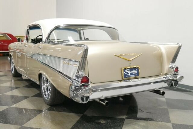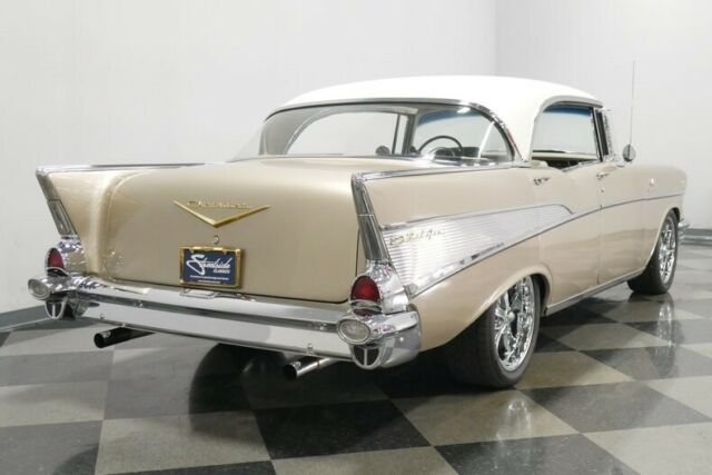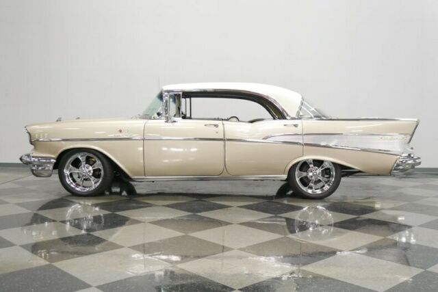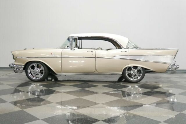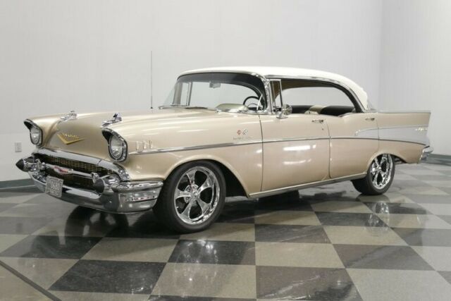 Great resto-mods don't just happen, they're meticulously planned and executed, and if you get it right, the results are something like this 1957 Chevrolet Bel Air 4-door hardtop. Yes, I know it has four doors, but look closely and you'll see a hard to find pillar-less 4-door hardtop. Yes that's right, you could also get an extra two doors while still retaining the hardtop feature! Any 1957 Chevy is a great-looking car, and this Bel Air 4-door... hardtop wears the same sparkling trim as its 2-door siblings and wears it well. With twice as many doors, there are twice as many gaps to fit, twice as many doors to align, and two extra panels to sand and straighten, but the guys tasked with this job delivered in a big way. This car just looks awesome in the flesh, with glittering paint that shows off the vintage sheetmetal to great advantage. And the 4-door carries its own cool details, including the way the rear doors invisibly blend with the quarter panel, giving it the look of a sporty 2-door, as well as the decorative stainless trim at the base of the rear windows. This car also offers a lot of fresh chrome (which was surely also expensive), beautifully polished stainless trim, and correct taillights that were unique to the '57s. No matter how many doors it has, this is a great-looking car. A four-door like this really shines when it's time to hit the road with some friends, with plenty of room for everyone. Fresh factory-style two-tone upholstery helps to uphold the classic good looks, and wide benches fore and aft are all-day comfortable. That funky fabric is definitely correct for '57 and the colors used inside are sophisticated and elegant, not hot-rod brash. And you'll undoubtedly hit the road frequently thanks to the many creature comforts this Bel Air offers, including a powerful A/C unit under the dash and an AM/FM stereo radio in the original slot. Crisply rendered gauges look fantastic through the spokes of a custom steering wheel that's almost stock but a bit easier to grab, plus the bigfoot-style accelerator pedal just for fun. Reproduction rubber floor mats protect the recent carpet, and the trunk was fully carpeted to add to the luxurious feel this car carries. The great thing about the small block Chevy is that the latest and greatest fuel injected V8s virtually bolt into cars like this '57. That means fuel-injected reliability and performance, instant starting with a single turn of the key, and impressive fuel economy when linked to a 700R4 4-speed automatic transmission. Unlike a lot of builders who just slap on a 4-barrel carb and call it done, this one keeps the fuel injection system, which means easy starting, a great idle, and plenty of power with bulletproof reliability. A serpentine belt drive system keeps the accessories tucked in tight to the block for good service access, and there's a new power master cylinder for the disc brakes. Up front there's a massive aluminum radiator and pusher fan to ensure the A/C stays cool even in traffic. The chassis is tidy and clean, although not detailed for show, and carries front disc brakes, a recent Flowmaster dual exhaust system, and a new gas tank out back. Flashy 18-inch Ridler wheels give it a performance look despite the four doors, and it wears 245/45/18 performance radials all around. Quite honestly, it's remarkable that someone built a 4-door that's this nice, but that also means you get a screaming bargain on a fully-sorted Bel Air that's ready to cruise today. Call now!
