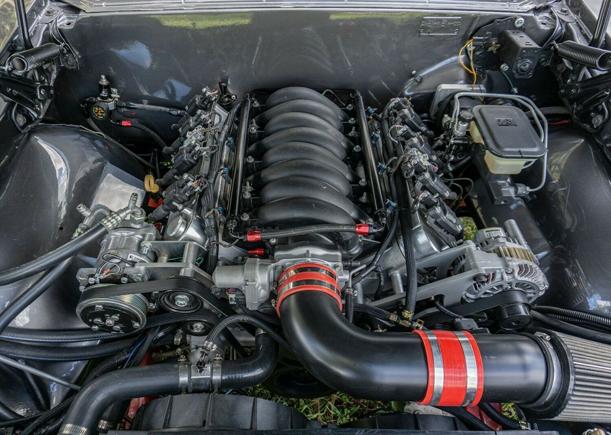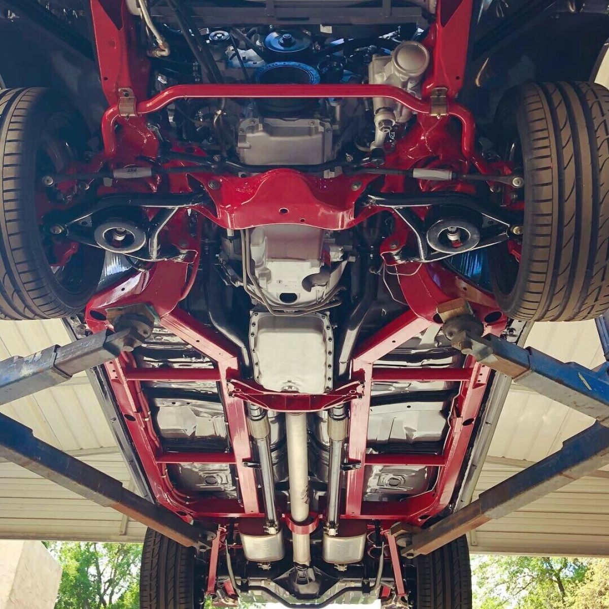 Custom exhaust fabrication (custom black high temp coating) with Magnaflow mufflers and stainless headers. Wiring by Current Performance. Dual fan relays and headlight relays. The battery has been moved to the trunk. The trans is the matching 6L80 six speed automatic that's been gone thru and tuned for the gearing and power and a new trans cooler. It shifts very well, and with the Camaro shifter, can be used in manual mode. It has a custom Driveshaft Shop Aluminum CV shaft with billet adapter hooked to an original 66 date coded 12 bolt with a 3.73 Posi rear gear. The frame under this car was modified heavily for additional rigidity and strength with boxed in side rails, drive shaft loop and full inner structure, with the rear rails narrowed for a mini-tub to fit the large rubber. Beautifully powder coated red.