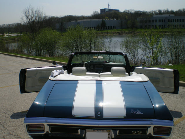 | Car is in Great condition. This non-numbers matching SS 454 replica (clone) is an original blue fathom blue car with white stripes and ivory interior. Extensive ground up restoration. Muncie 4 speed transmission. 454 cubic inch V8. Minor/small blemish (bump) on the rear quarter panel. Highly sought after muscle car. I purchased the vehicle at Meacum Auctions in Indianapolis in I think 2007. The vehicle is kept in a temperature controlled garage in Downers Grove. Illinois. No shipping is included. Pick up by purchaser. Car is being purchased in as is condition. No warranty included. |