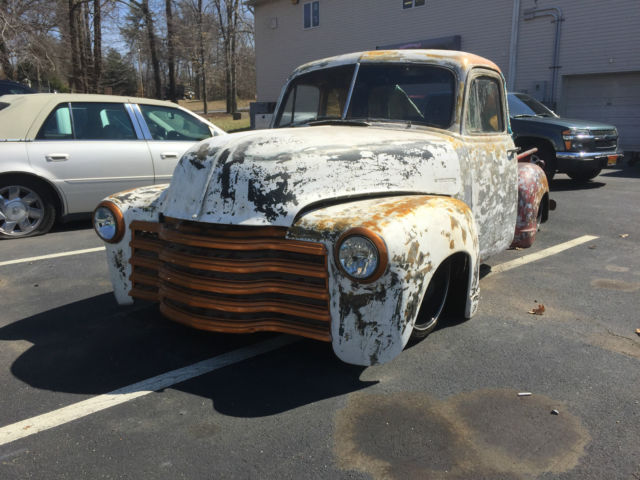 | Chevy Rat Rod project almost complete. 1949 Chevy 3100 base on S-frame. The good starting from the front:Harley Davidson headlightsGrill painted copper350 motor with copper paintedSanders headersSpider web in copper on firewall (pic not shown)Wired with harnessCustom battery boxNew wood bed stainedCustom tailgate REVOLTWidened rear fendersBagged on all four corners with 2 compressors and copper linesFoose wheelsTitle for S-10 chassisThe bad:Needs interiorNeeds glass installed. Included in sale but not installedNeeds exhaustAny questions email. text or call. Great almost done project. Our lease is ending and moving to new location. Just trying to thin the heard. Thanks for looking. Sam443-221-9093On Mar-24-15 at 06:40:47 PDT. seller added the following information:*Engine compartment pic added |
