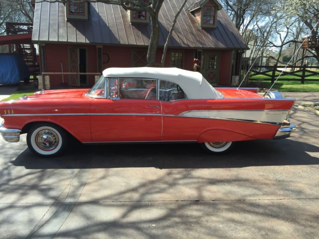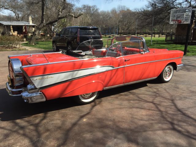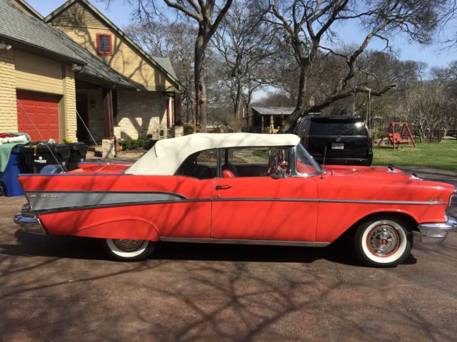 | 1957 Chevrolet Bel Air Convertible - 283 CI Small Block 8 Cylinder Engine–Automatic TransmissionHIGHLIGHTS- All original - Restored 8 years ago - New top - New interior - Rust freeDESCRIPTIONAn all-time popular color combination and the right options make this 1957 Chevrolet Bel Air convertible a great choice for the “Tri Five” Chevy enthusiast. Restored 7 years ago and well kept. it is entirely as-original and rust free and finished in bright Matador Red with a new Silver-on-Red interior and new soft top. Driving is easy with a 283 CI small block under the hood turning a 2-speed automatic. and the presentation is full dress: dual mirrors and rear antennas. full spinner wheel covers. wide Whitewalls. fender skirts and a chrome-trimmed Continental kit. (I am relisting car because the previous buyer on ebay chose the "buy it now option" and when I contacted him he said it was an error and he didn't select the option). On Mar-24-15 at 08:57:08 PDT. seller added the following information: I have uploaded the bill of sale from Mecum when I purchased the car 9/11/2012. The car has been garaged at my house and driven 3-4 times in a veterans day parade. It is in exact condition as when I purchased (as is). The listing above is the exact listing that was provided by the original owner when I purchased the car. On Mar-25-15 at 17:35:12 PDT. seller added the following information: I cant upload additional pictures. If you would like pictures underneath. Please send me a message and I will send to you. |