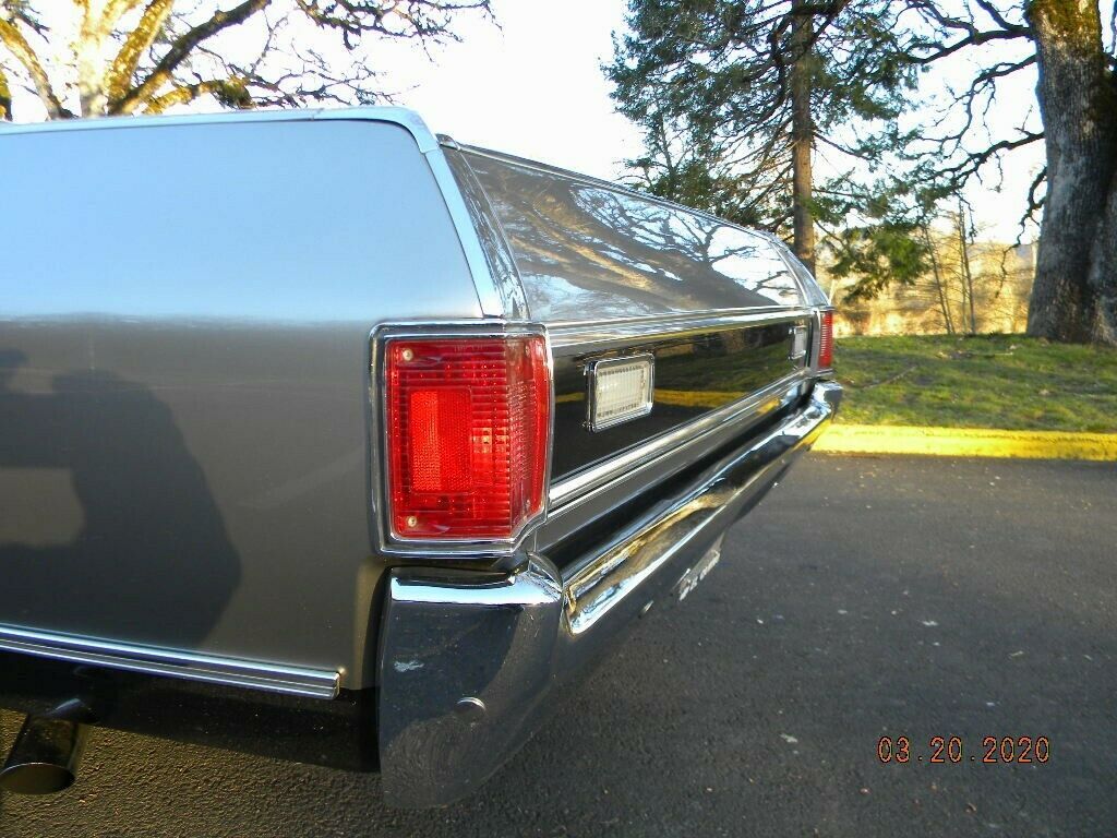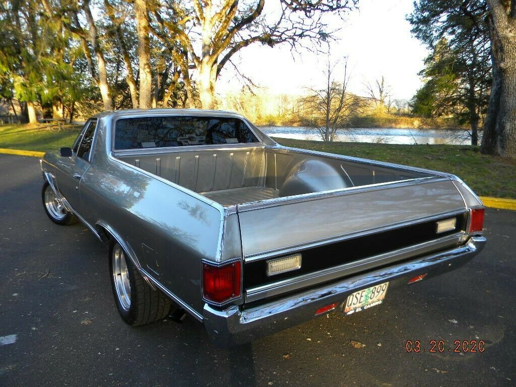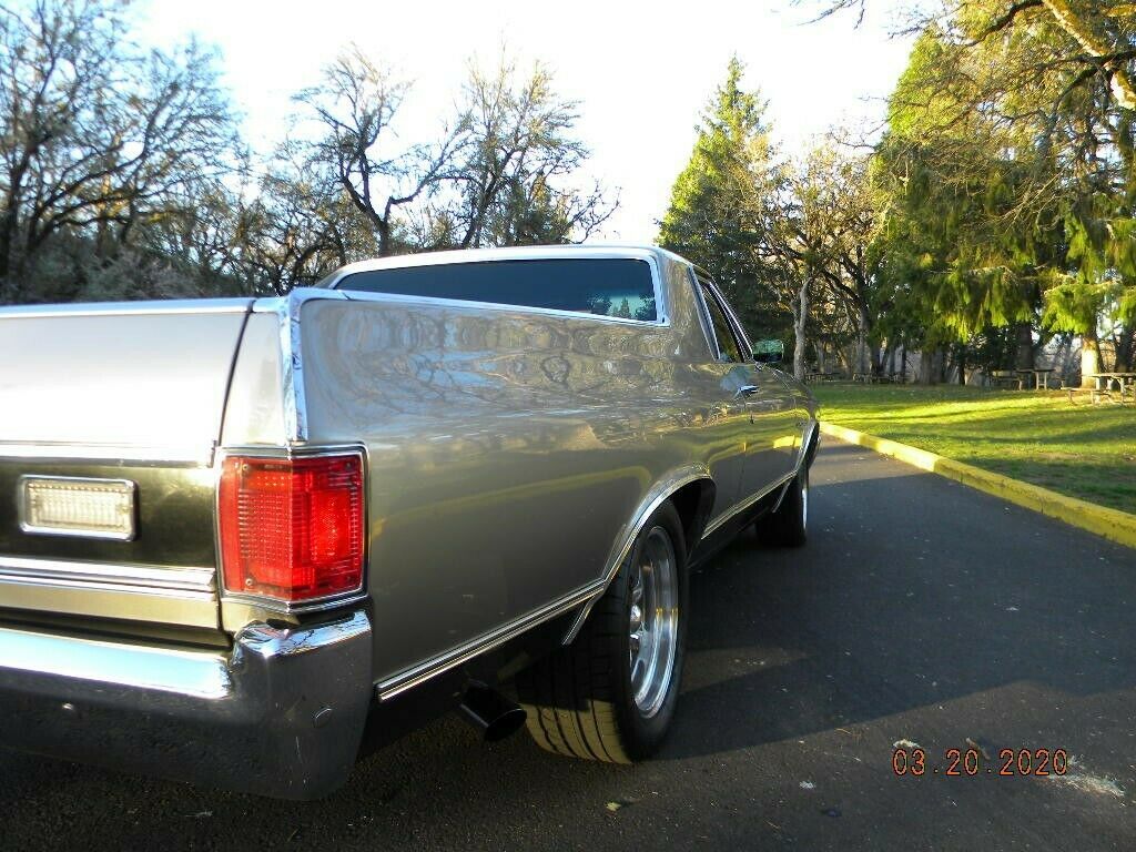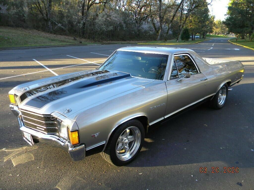 For Sale;1972 Chevy el Camino. Factory 350 4bbl. car (NOM) and automatic transmission and Factory 12 Bolt Rear. Options include: Power Steering, Power Front Disc Brakes and working Factory Air Conditioning! Additional equipment includes Tinted Glass, Cowl Induction Style Hood, and Stereo with CD Player. The undercarriage shows the original floors, with no rust. The suspension has been upgraded with Hotchkis Front and Rear Sway Bars, Hotchkis Shocks, and Hotchkis Rear Lower Control Arms. This el Camino runs drives and handles exceptionally well! The exterior is finished in Silver, with black SS style stripes. The bed is in excellent condition, showing no rust and very little wear. The body is laser straight and the paint is very smooth and glossy, with only a couple of blemishes. The chrome and stainless are in excellent condition as well. The front tires are 225/50/16's and the rear tires are 245/50/16's all mounted on 16 x 8 inch billet aluminum Centerline 5-spoke wheels. The black interior features an original bench seat upholstered in comfortable cloth, factory style black carpet, a custom LeCarra leather - wrapped steering wheel, and a beautiful dash pad with no cracks! Mechanically, the engine seems to be stock, with the addition of an Edelbrock aluminum intake and Edelbrock 4bbl. carburetor. She starts instantly, on the choke and idles nice and smooth! Factory exhaust manifolds take the gases through a pair of glass pak mufflers, exiting just behind each rear wheel. This gives the el Camino a nice low tone, without being annoying. The TH350 automatic transmission shifts smoothly. Overall, this is a hard to find rust free el Camino with tons of eye appeal that can easily be driven and enjoyed.This beautiful El Camino is being offered by Heritage Motors, Inc. We have been in business for 40 years in the same location! This vehicle is sold as-is, no warranty. For questions, feel free to call Steve at 541 840 2658 or Ken at 541 973 6211. Buyer is responsible for shipping, but we can help with logistics. Free inside storage is available for a short time until shipping can be arranged.