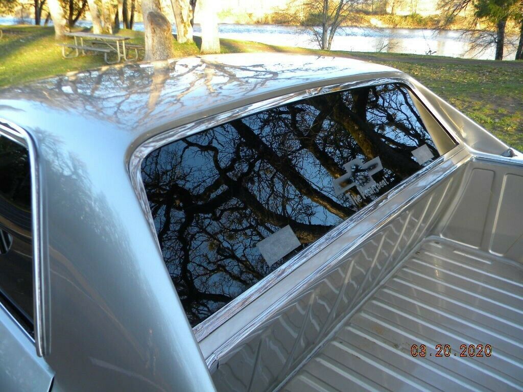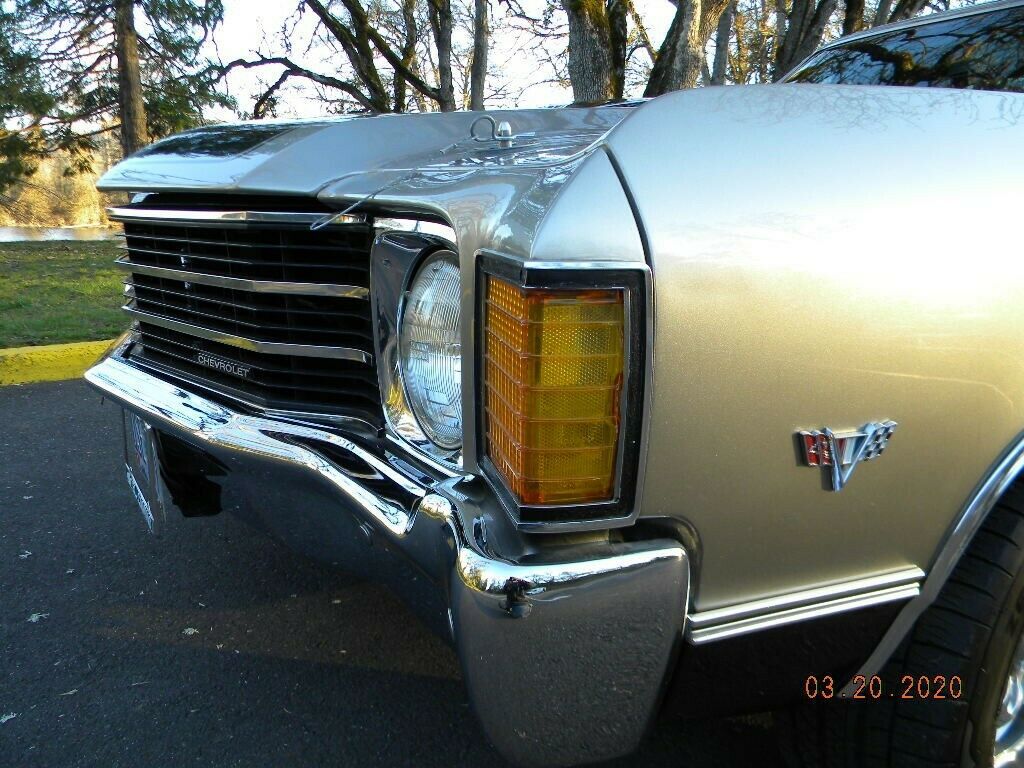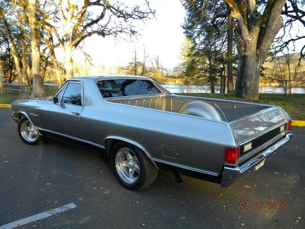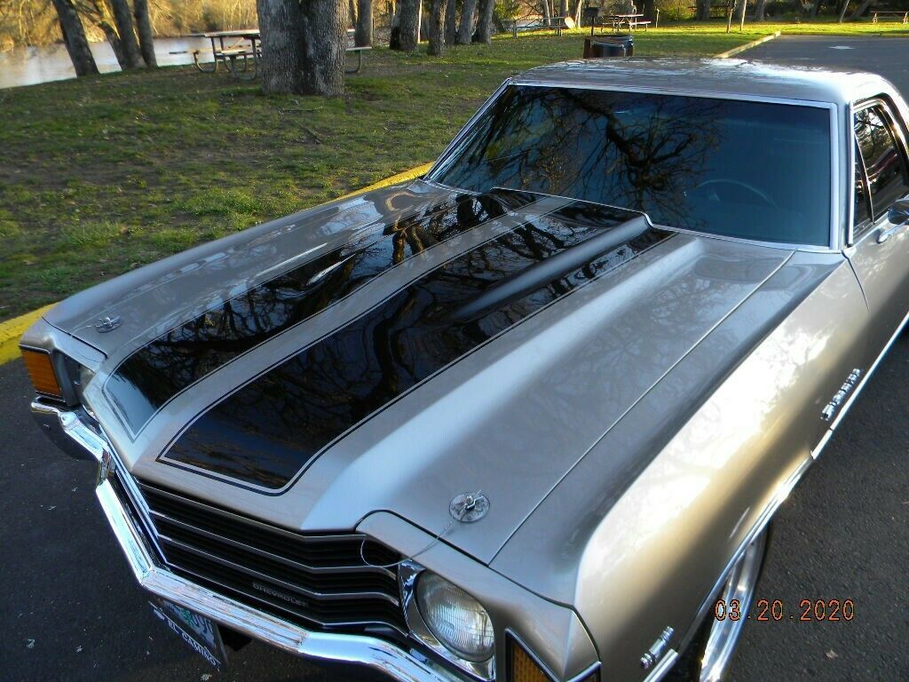 For Sale;1972 Chevy el Camino. Factory 350 4bbl. car (NOM) and automatic transmission and Factory 12 Bolt Rear. Options include: Power Steering, Power Front Disc Brakes and working Factory Air Conditioning! Additional equipment includes Tinted Glass, Cowl Induction Style Hood, and Stereo with CD Player. The undercarriage shows the original floors, with no rust. The suspension has been upgraded with Hotchkis Front and Rear Sway Bars, Hotchkis Shocks, and Hotchkis Rear Lower Control Arms. This el Camino runs drives and handles exceptionally well! The exterior is finished in Silver, with black SS style stripes. The bed is in excellent condition, showing no rust and very little wear. The body is laser straight and the paint is very smooth and glossy, with only a couple of blemishes. The chrome and stainless are in excellent condition as well. The front tires are 225/50/16's and the rear tires are 245/50/16's all mounted on 16 x 8 inch billet aluminum Centerline 5-spoke wheels. The black interior features an original bench seat upholstered in comfortable cloth, factory style black carpet, a custom LeCarra leather - wrapped steering wheel, and a beautiful dash pad with no cracks! Mechanically, the engine seems to be stock, with the addition of an Edelbrock aluminum intake and Edelbrock 4bbl. carburetor. She starts instantly, on the choke and idles nice and smooth! Factory exhaust manifolds take the gases through a pair of glass pak mufflers, exiting just behind each rear wheel. This gives the el Camino a nice low tone, without being annoying. The TH350 automatic transmission shifts smoothly. Overall, this is a hard to find rust free el Camino with tons of eye appeal that can easily be driven and enjoyed.This beautiful El Camino is being offered by Heritage Motors, Inc. We have been in business for 40 years in the same location! This vehicle is sold as-is, no warranty. For questions, feel free to call Steve at 541 840 2658 or Ken at 541 973 6211. Buyer is responsible for shipping, but we can help with logistics. Free inside storage is available for a short time until shipping can be arranged.