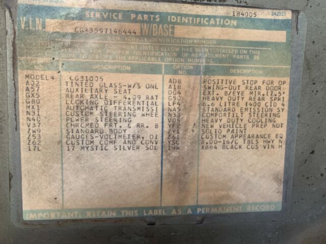 1979 Chevy G 30 4x4 “shorty†van. This is a “Pathfinder†4x4 conversion.Original 400 SBC. Automatic trans. Power windows and tilt steering column. It Was an 80’s Custom van! 14 bolt rear axle, Dana front. Lock out hubs. It does run and move but is not road worthy. The van is very rusty and is best used for a “Donor†vehicle to build another 4wd van.No title, Bill of sale from the estate.If I find a good shell I’ll rebuild it as this was my uncles dream, unfortunately he recently passed.