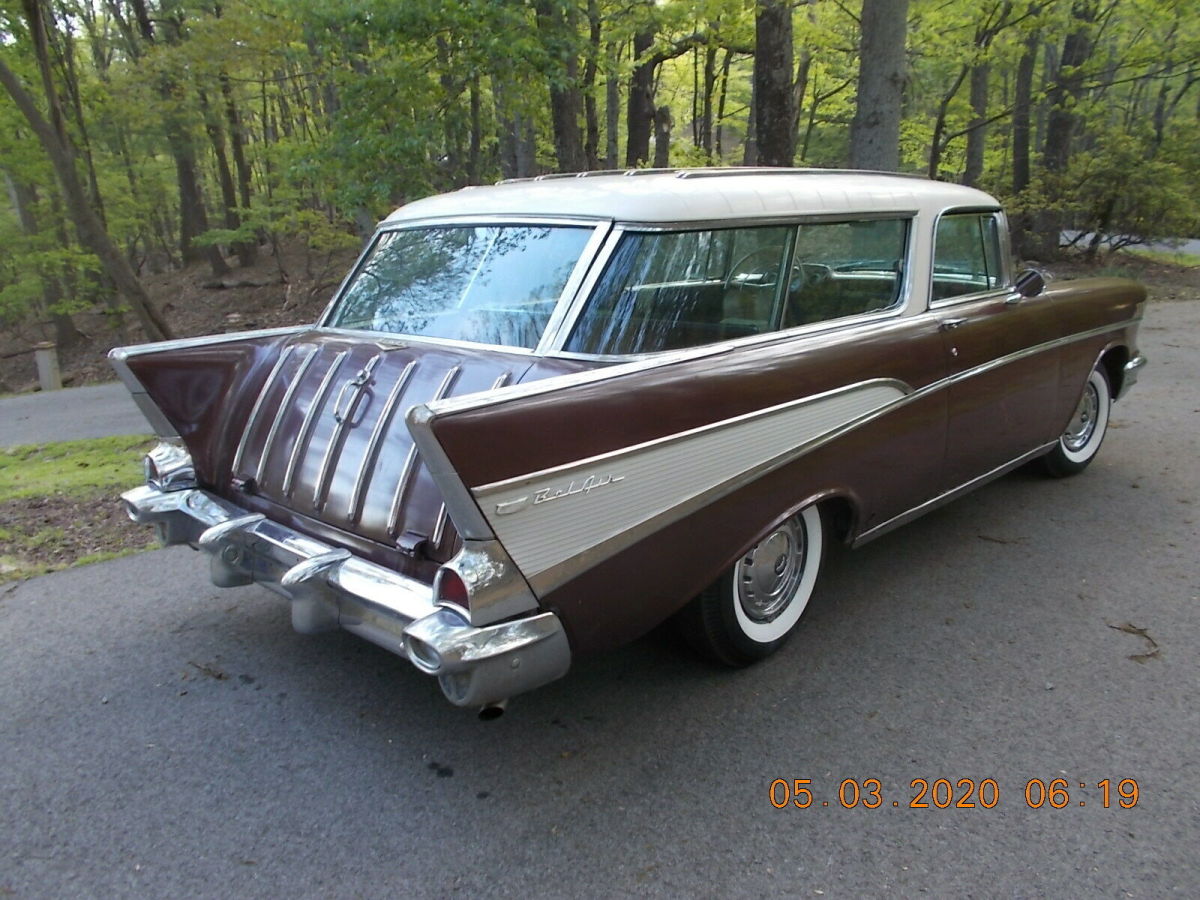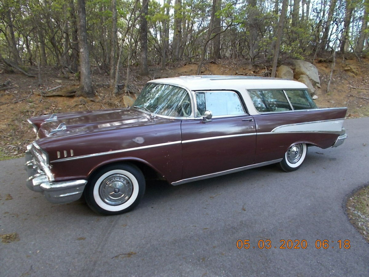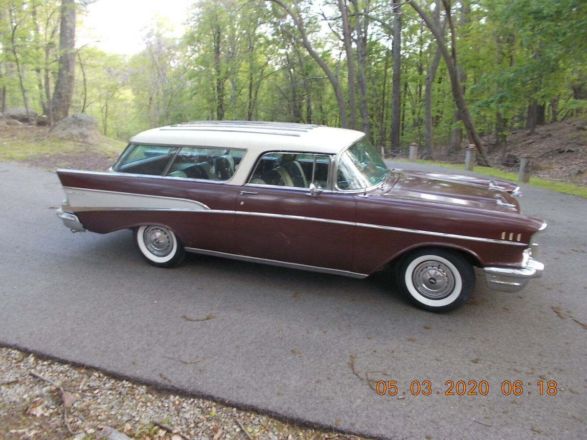 This Nomad was taken off the road in the early 70s for an engine upgrade and was never put back on the road. From discussion with a previous owner, I know the car was native to Covington, VA. The original engine is reportedly still in Danville, VA, partly apart from scavenging. The car is now a three-speed manual. It was initially Sierra Gold, but it was repainted (badly) in the late 60s to Canyon Coral.The seats were badly worn and the carpet in tatters. I repaired the cloth with original material from another Bel Air, repaired loose seams, and pieced together the front and rear carpet to make an all-original material carpet for the front.The car was gone through entirely by a qualified restoration mechanic in Martinsville, VA. He put in the replacement engine and transmission. The car runs and drives as it should, but some gauges don't work. The tires are new Cokers.The worst rust is the softball-size area in front of the right rear wheelwell. There is some rust beginning in the right front fender behind the wheelwell. The paint is chipped, faded, and scratched throughout. The chrome is okay but not great. The car probably looks better in the photos than in person, but it's still presentable.The spare tire cover board is missing, and there are a few rust holes in the spare well. The undercarriage is otherwise remarkably clean. The windshield is cracked, but all the curved glass is good.This car needs everything as much as a really poor shell would if one wanted to restore it. However, it is a rare, largely untouched Nomad that sat inside for almost 50 years, and it would likely be the best survivor Nomad at any car show.