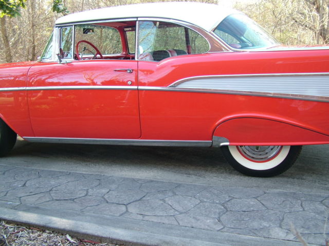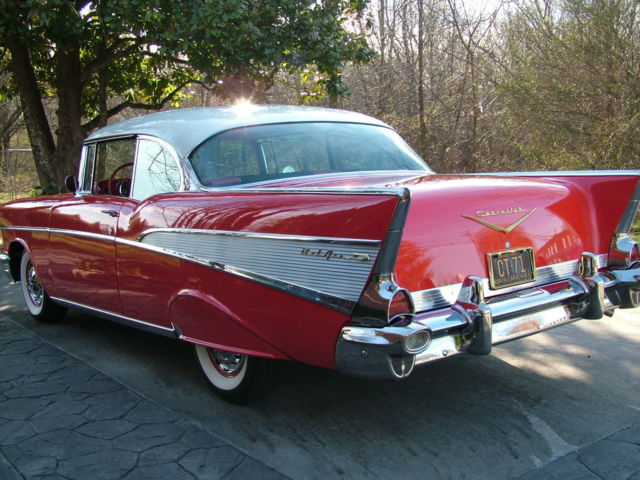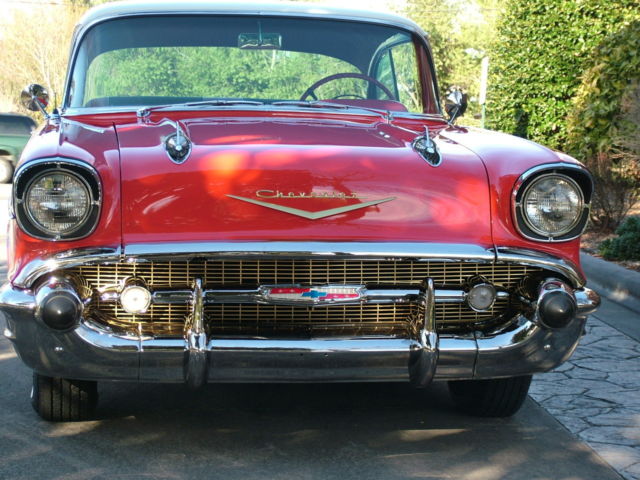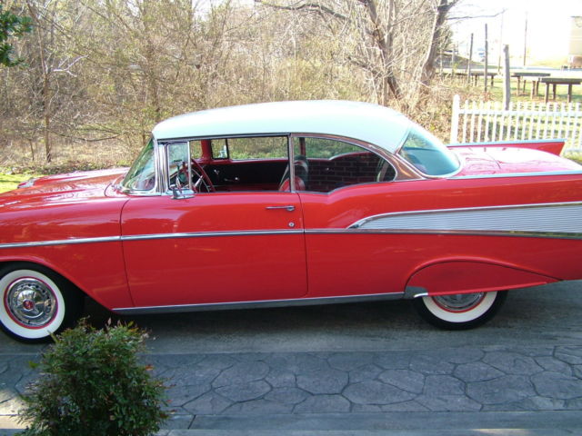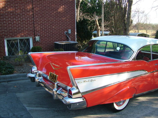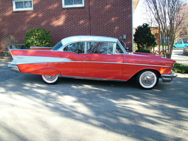 1957 CHEVY BEL-AIR 2-DOOR HARDTOP---ONE REPAINT A FEW YEARS AGO IN ORIGINAL COLORS OF MATADOR RED & INDIA IVORY ON AN ALL-ORIGINAL SHEET METAL VERY SOLID CAR---ORIGINAL REBUILT 283 CU. IN. POWER-PACK ENGINE (4-BARRELL CARB. & TWIN EXHAUSTS)---ORIGINAL REBUILT POWER-GLIDE AUTO. TRANNY---POWER STEERING---POWER BRAKES---CAR IS A ROTISSERIE RESTORATION DONE TO THE HIGHEST STANDARDS AND TO ORIGINAL SPECS READY FOR ANY AACA MEET---THE PHOTOS SPEAK FOR THE QUALITY OF THIS CAR AND ITS RESTORATION---HITS THE ROAD LIKE A BRAND NEW 57 CHEVY---YOU WILL BE HARD PRESSED TO FIND A BETTER CURED RESTORATION 57 CHEVY 2-DOOR HARDTOP---CLEAR NORTH CAROLINA TITLE IN HAND---CAR IS NOT PERFECT (NONE ARE) BUT VERY CLOSE---WAAAY SLICK & STRAIGHT---LOCATED IN THE FOOTHILLS OF N. C. ---SELLER RESERVES THE RIGHT TO END THIS OFFERING EARLY---SOLD AS IS WHERE IS WITH NO WARRANTY EXPRESSED OR IMPLIED---QUESTIONS COMMENTS CALL PAUL AT 336-838-2078---NO EMAILS PLEASE (I AM A VERY SLOW PICK & PECK TYPIST)---THANKS FOR LOOKING AND HAVE A BLESSED DAY .