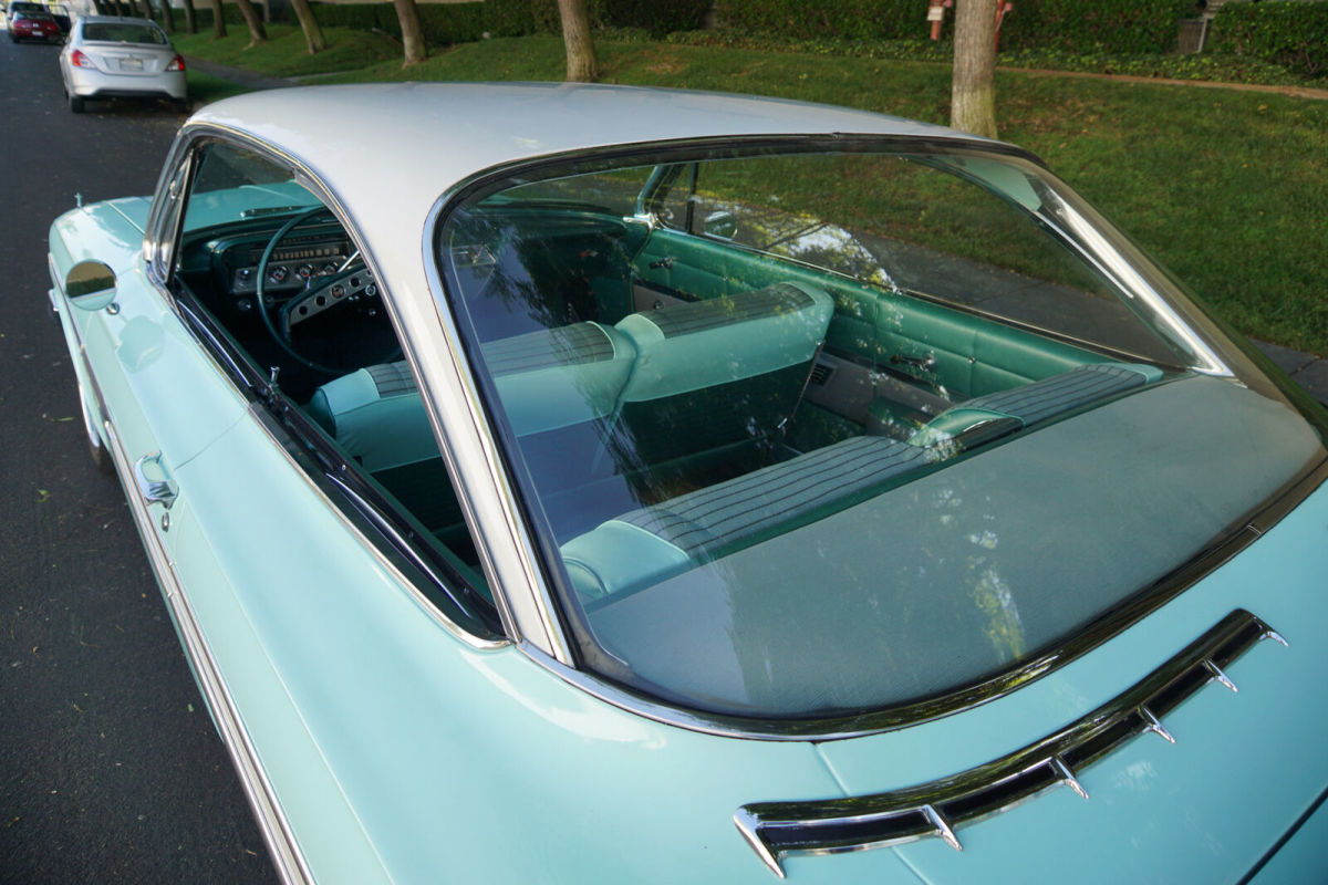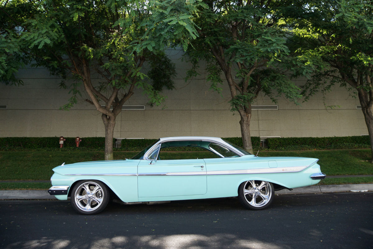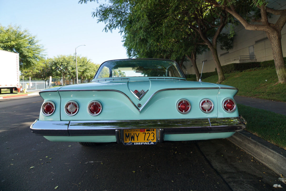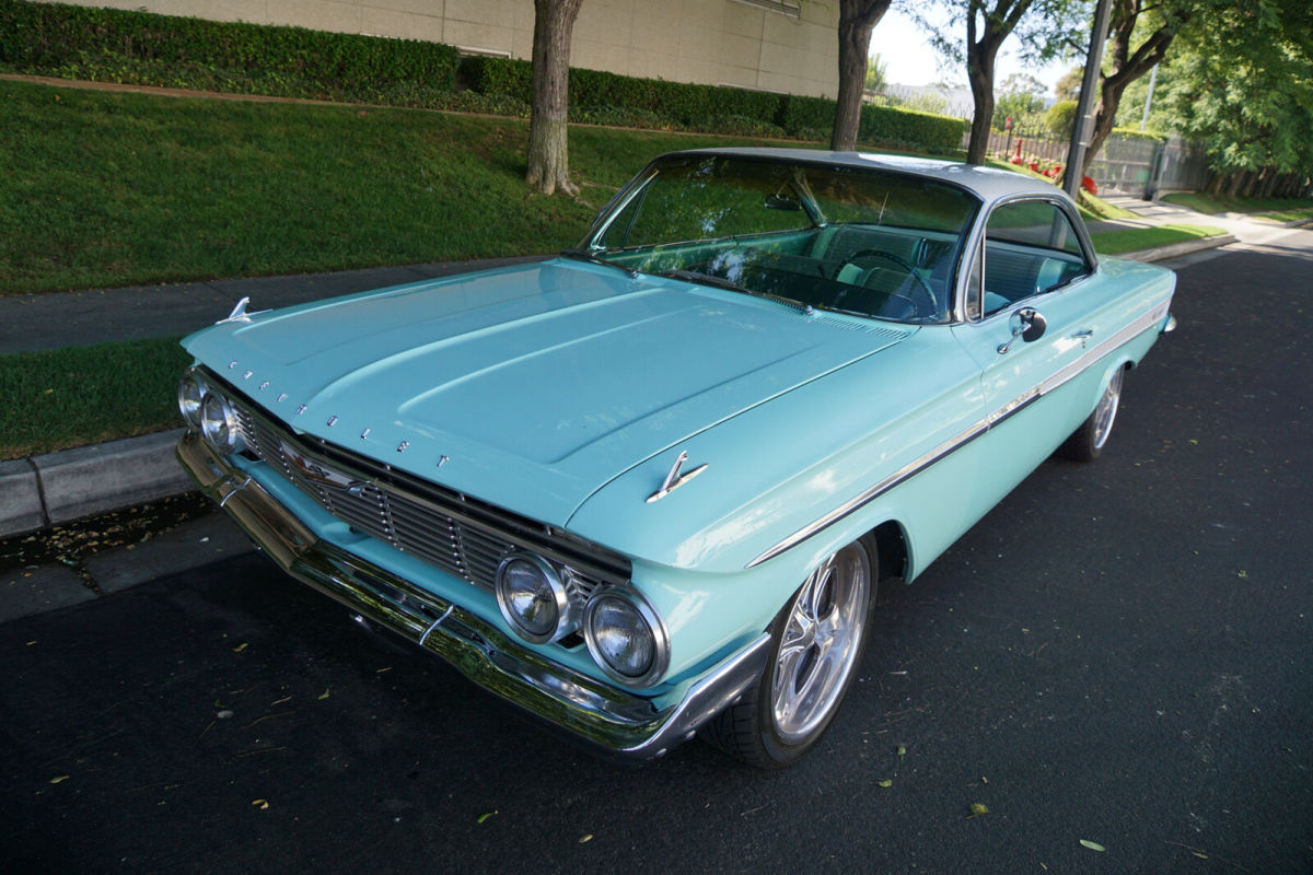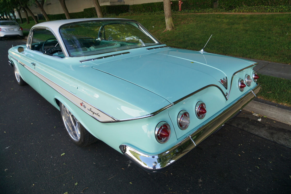 West Coast Classics presents are proud to present an exceptional example of this custom built 1961 Chevrolet Impala 2 door Coupe with a new crate 350 V8 440HP V8 engine matched to a 700R4 4 speed automatic transmission with a shift kit & with 4 wheel disc brakes & striking chrome 'Foose' wheels. The car is finished in a stunning 'Solid Twilight Turquoise' over a 'White' hardtop color repaint with a new matching Turquoise stock looking interior and trim. It has has a superb build with an all new drive shaft, U joints, belts, plugs, hoses, radiator, exhaust and with custom 'Stewart Warner' gauges. The 1961 full-size Chevrolet model was totally revamped for the new year. As with all other full-size GM lines, the new cars finally finished with the knee-banger, wrap around windshields and tailfins and shed some of the length and width that had been popular in the prior three years. The front end sported a full width grille with dual headlamps mounted at each end with the turn signals and parking lamps mounted above the headlamps. The car boasted all the regular Bel Air equipment plus Nylon pattern cloth seats, electric clock, full carpeting and dual backup lights. The Impala was restyled on the existing GM B platform for 1961. The new body styling was more trim and boxy than the 1958-60 models. Sport Coupe models featured a 'bubbleback' roof line style for '61 and a unique model, the 2-door pillared sedan, was available for 1961 only. It was rarely ordered and a scarce collectible today. The rare Super Sport (SS) option debuted for 1961 and was retired in 1968. The 1962 model featured new 'C' pillar styling for all models except the 4-door hardtop 'Sport Sedan.' Sport Coupe models now featured the 'convertible roof' styling, shared with other GM 'B' full size hardtop coupes. This particular example is an obvious customized car yet still very stock looking and boasts most of its original equipment including the AM radio and with original floor boards and trunk and a very straight body. It has received a beautiful date correct 'Solid Twilight Turquoise' color repaint with an 'Ermine White' hardtop and has a matching interior trim and seats and rides on striking 'Foose' chrome wheels. This car must be seen and driven to be fully appreciated - the engine is extremely strong and responsive, the transmission shifts smoothly through the gears and the engine temperature always remains cool. The car's re-paint is of a very high quality and in very fine shape and the car has very few flaws. In summary, this is a wonderful example of a very striking 1961 Chevrolet Impala 2 Door Hardtop coupe muscle car in turn-key ready daily driving and daily head-turning condition, most definitely one very collectible and attractive example of an early sixties full-size classic all American muscle car! |