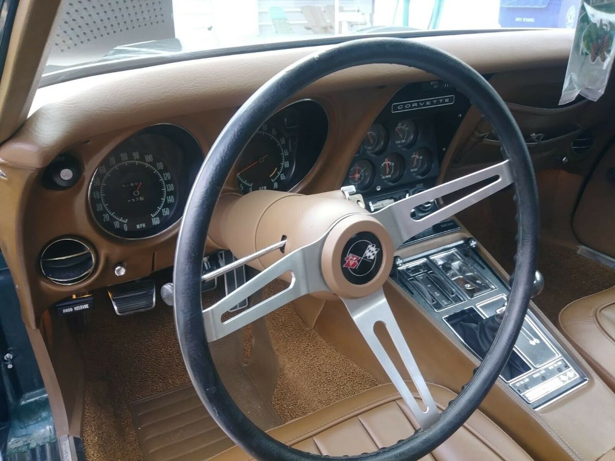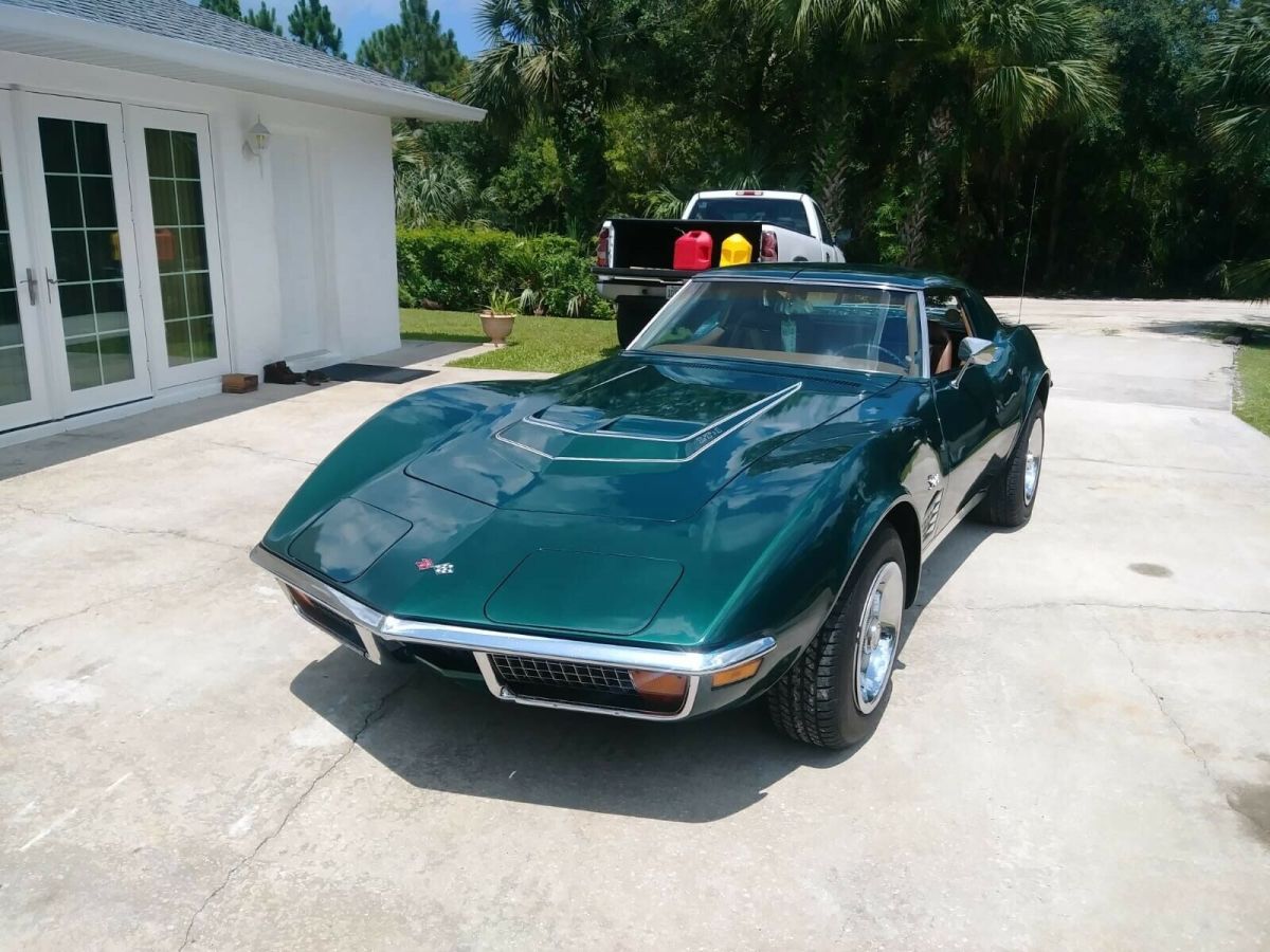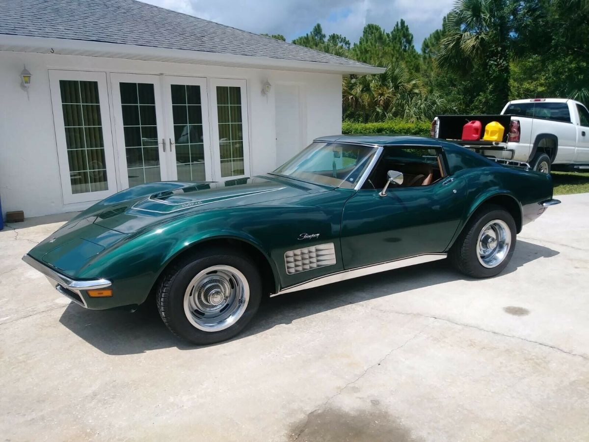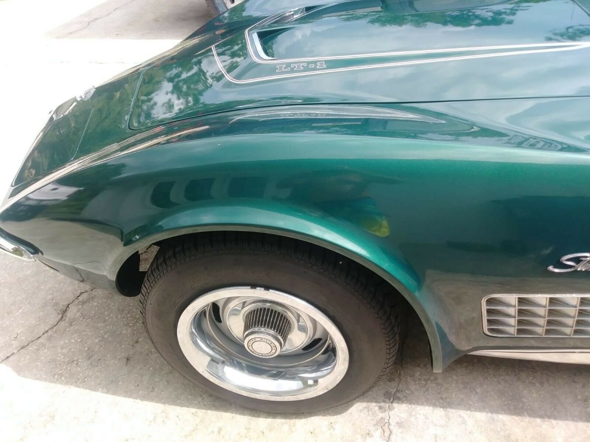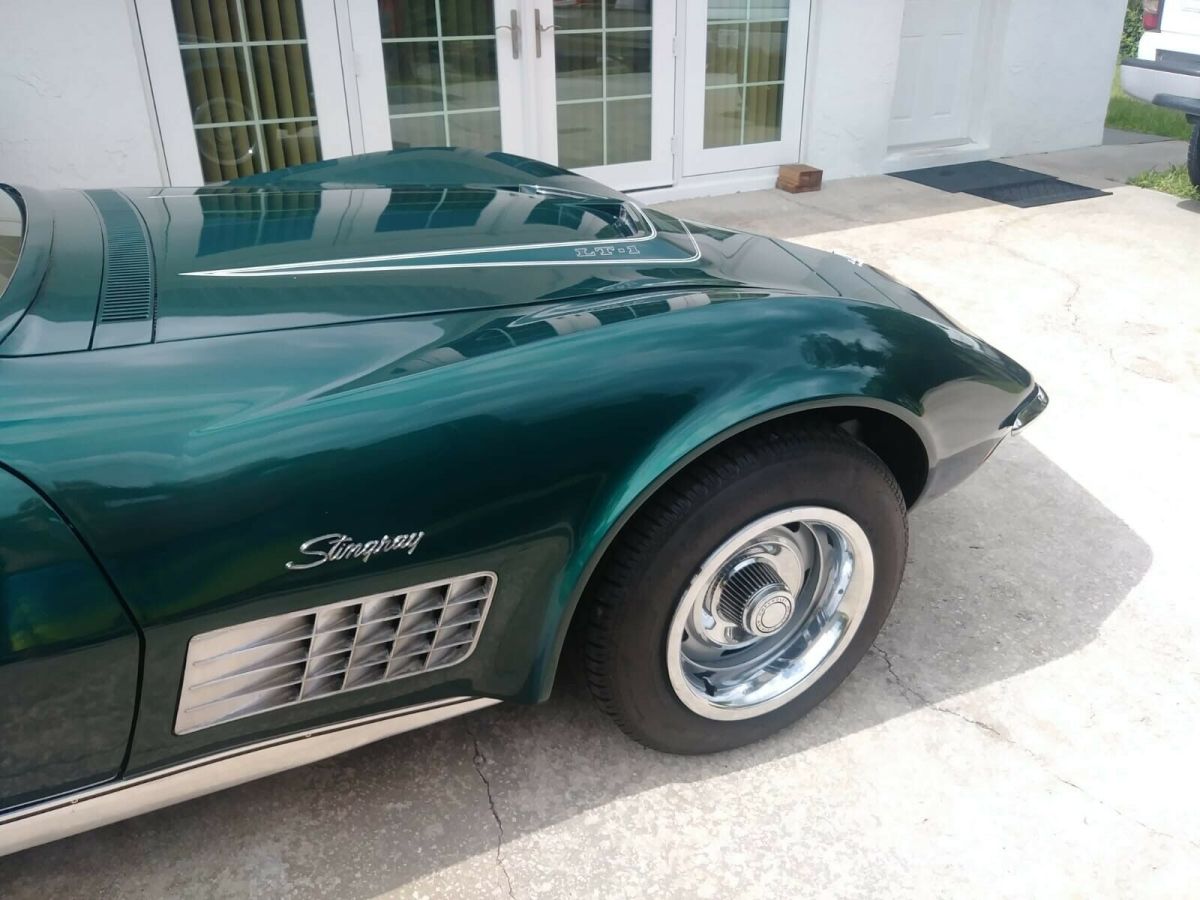 Car located in vero beach Florida.1971 Corvette LT1, 350 cu. in. 330 horse, 4 speed, with 81,880 milesColor: Brands Hatch Green, with Dark Saddle interior. This is a two-owner car. All chrome is original and in good condition. The paint is in great condition considering it is a 48 year old lacquer finish. As far as I am aware, this car was painted once by the selling dealer under warranty There is a small crack in the paint by each door handle, which the photos show. I replaced the Hood header support because the rivets in the original support were causing pimples, which is common in C3's. (this in the area between the headlights and the hood) After replacing the support, the pimples disappeared and are now very slight dimples - but in the process, I put some minor nicks that needed to be touched up. You have to look very closely to see them. I have included photos showing all of these spots. Undercarriage completely rebuilt, mechanically from front to back. - Replaced seat covers and foam, door panels, dash pad, and carpets. The rest of the interior is original and in good condition. - Removed the drive train, all the suspension, front and rear, front cross member, radiator and saddle, bumper brackets, and headlight assemblies.- Rebuilt the headlight assemblies, sandblasted, primed and painted all other suspension and steering parts front and rear.- Steam cleaned all underneath the car including the frame, wheel wells and engine bay.- Replaced a-frames dust covers and tie rod ends.-Rebuilt steering relay rod, new ball joints; upper and lower, new brake calibers, pads, and hoses from frame to calibers; front and rear.- Replaced front stabilizer bar, mounts, bushings, link bushings, washers, and spacers.- Installed new front wheel bearings.- Replaced rear wheel bearing assemblies.- Installed Heavy Duty Van Steel trailing arms and strut rods- Installed new rear leaf spring, mounting kit and bushings, new shocks; front and rear, secondary parking brake cable- Installed 4 new tires; the spare tire is original and has never been used.- Front and rear end have been aligned.- The gas tank has been removed, inspected and cleaned.- Replaced the alternator, starter, water pump, fan clutch and fuel pump.- All new s/s fuel lines between pump to carburetor- New motor mounts and complete 2.5 in. exhaust system- Complete carburetor rebuild- New choke thermostat, new clutch, pressure plate, throw out bearing, U joints, new coil, plugs, plug wires, electronic ignition, cap, rotor, all new headlight and wiper vacuum system and hoses. The engine runs great; has 35 lbs. oil pressure at idle. The engine is a factory warranty replacement as per the serial number CEA133693, CEA indicates it is a certified engine that can only come from a GM dealer thru a warranty. Transmission is the original M21, 4 speed, so it could be considered numbers matching. The car runs and drives like new. It is being sold with an extra set of T Tops, translucent green Astro T Tops; made by Thompson Astro Tops and Performance Parts, in Florence Alabama. Sale includes the original owner’s manual, original warranty folder with the attached PROTECT-O-PLATE. After many hours of research it looks like there were 1,949 LT1 Coups built in ‘71 and only 25 with code 983 Brands Hatch Green paint and code 417 Dark Saddle interior. This would make a nice daily driver or a Sunday car. I have too many projects and not enough room, hate to let it go, but I must. For more pictures or info please free to message me.