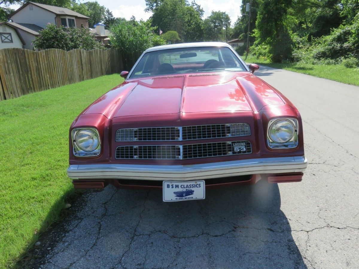 Hard to Find 1975 Chevrolet Laguna S3 in Sharp Dark Poly Red, White Stripes & Vinyl Top, Oxblood Red Interior with Factory Swivel Bucket, Console, Custom Autometer Gauge Cluster, Custom Sounds Bowtie Stereo, Ice Cold A/C, Power Steering & Brakes, Tilt Wheel, Pro Built 4 Bolt 355 with Dart Iron/Eagle Heads, Comp Mother Thumper Cam that Hits Hard and Sounds Wicked, Holley 750, RPM Intake, Big Tube Headers, 3 Inch Flowmaster Exhaust, Bee Cool Aluminum Radiator, Pro Built 350 Turbo with B&M Shift Kit and 3000 Hole Shot Converter, 4:10 10 Bolt Posi and 8 Inch Rally Wheels with BFG Radials, Runs Super Strong and will Probably be the Only One at Any Cruise.. Feel Free to Call 314-795-7355 with any Questions! Selling As/Is and a $500 Non-Refundable Deposit is Due 24 Hours after ending! https://youtu.be/0_eYzo5APVw