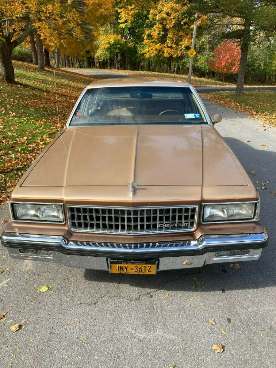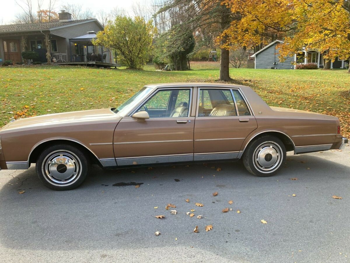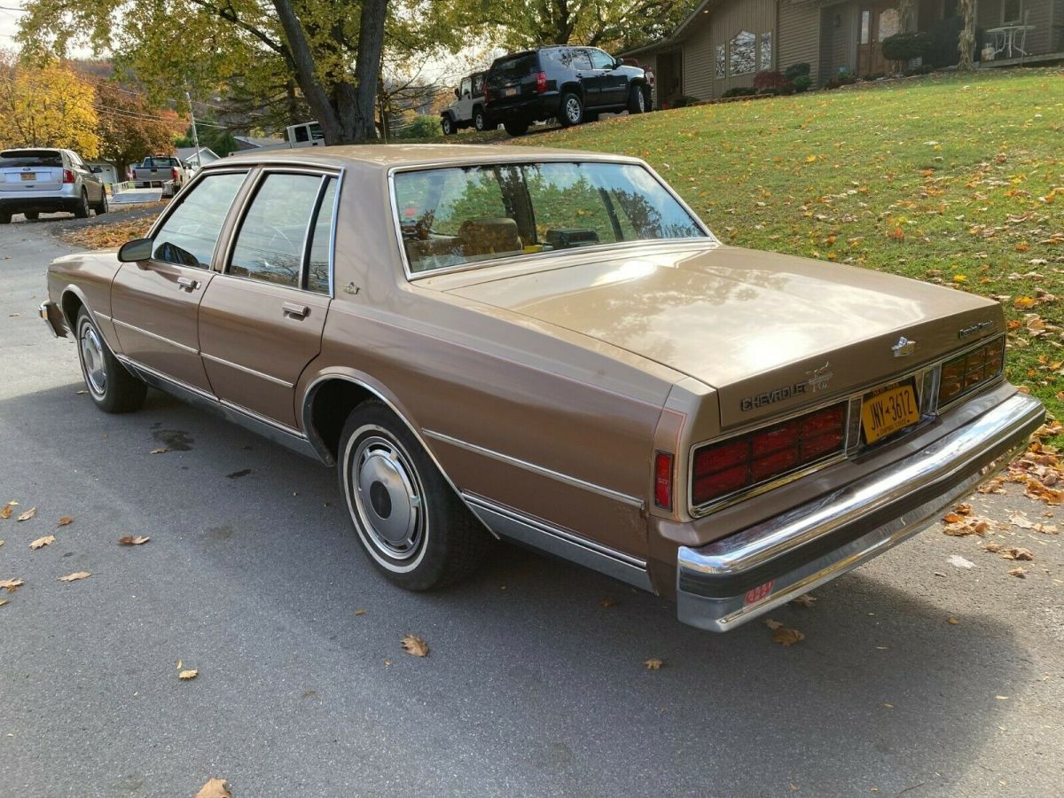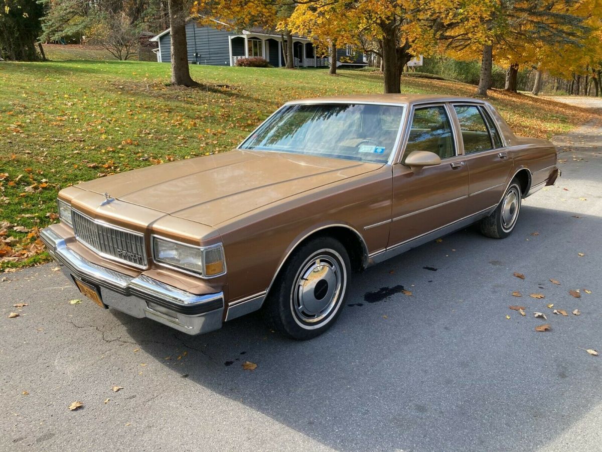 Up for sale is my 1987 Chevy Caprice Classic sedan with what I believe to be 65k original miles. I purchased it from the friend of the original elderly owner in Syracuse NY this past summer and have driven it sparingly since. The original Fox Chevrolet trunk badge is intact along with the original manuals and warranty information. It has a clear carpet protector tucked under the door sills and another carpet over that. This car shows very little to no wear and is a true time capsule. Protected with Auto Armor when new and is clean underneath, especially being a local NY car its entire life. There is one spot of surface rust on the rear quarter by the marker light. Has the 305 V8 engine and 4 speed automatic transmission. Crank windows and manual locks, optioned to have A/C but it was never retrofitted to R134A and does not blow cold currently. The passenger front fender was replaced just prior to me getting it due to something falling on it in the garage and the dark brown isn't an exact match as seen in the pictures, but wet-sanding and buffing the overspray off the door and polishing that entire side of the car would blend everything together to almost new. The Goodyear Decathlon tires are what I believe to be the second set of tires on this car and are due for replacement soon. Starts up, runs and drives with no issues, and is ready for a new home. I hate to sell it but I have too many vehicles at the time and need to downsize. Feel free to reach out with any questions you may haveThanks for looking
