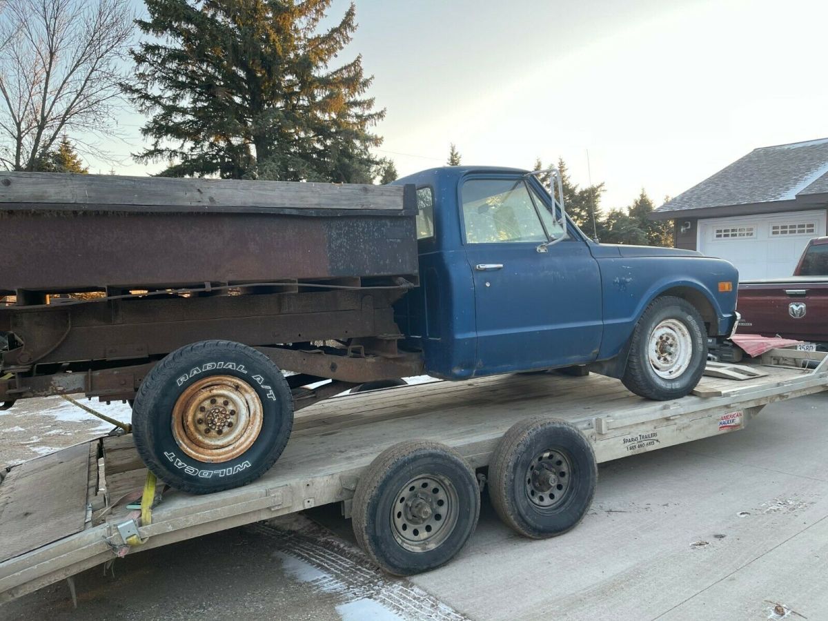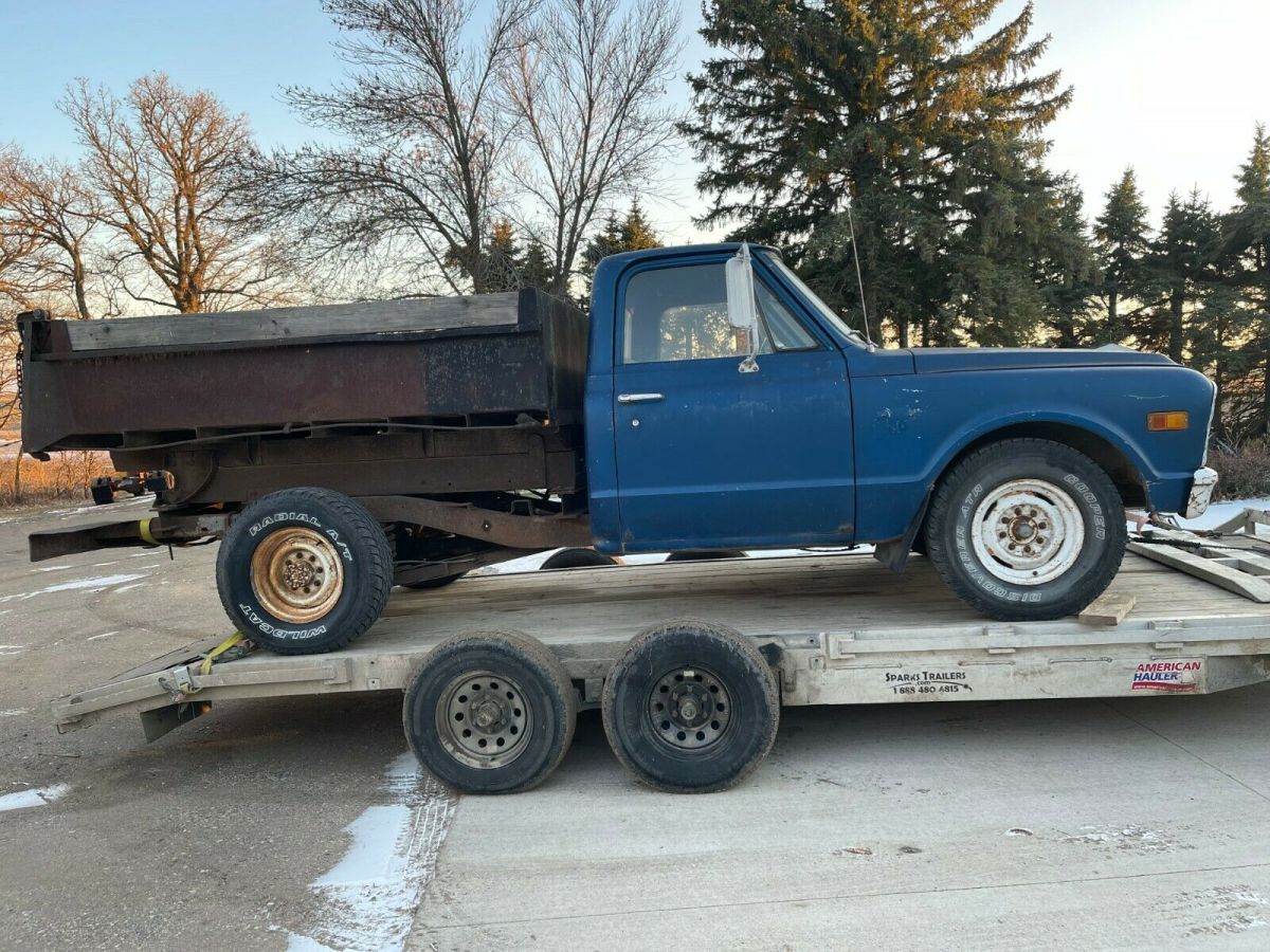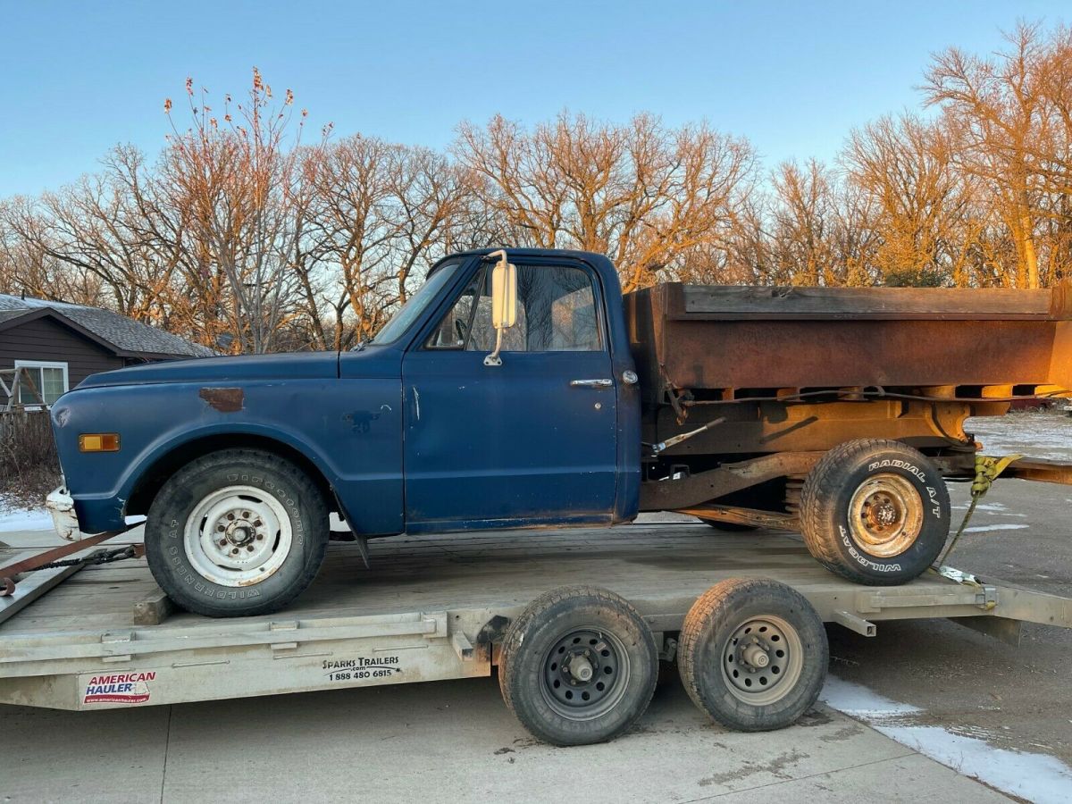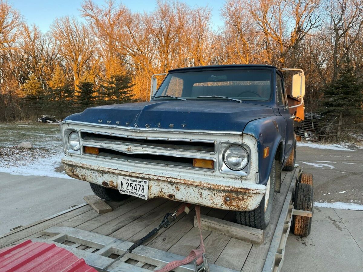 FROM NORTH DAKOTA IS A1968 CHEVROLET PICKUP;ITS A C-20 THREE QUARTER TON.THE BED HAS A 2 YARD DUMP BOX;THE OWNER WAS USING IT UNTIL A MONTH AGO;THE CLUTCH WENT OUT;IT WAS RUNNING GOOD, HE SAID;YOU WILL NEED TO GET A NEW CLUTCH INSTALLED TO MAKE IT USABLE AGAIN.TAKE A LOOK AT THE PIX,THERE IS NO WARRANTY OFFERED;WE ARE SELLING AS IS.IT HAS WELL ABOVE AVERAGE DECENT METAL.THE ENGINE IS A V - 8 CHEVY; NOT SURE IF IT IS ORIGINAL OR NOT;THE TRANNY IS A 4 SPEED;IT JUST CAME IN FROM A FARM IN NORTH DAKOTA;REASEN HE IS SELLING I, HE DOES NOT WANT TO BUY A CLUTCH AND HE IS RETIRING.THIS IS JUST A 3 DAY AUCTION.I CAN HELP WITH A REASONABLE SHIPPING QUOTE.JEFF 218-464-2821