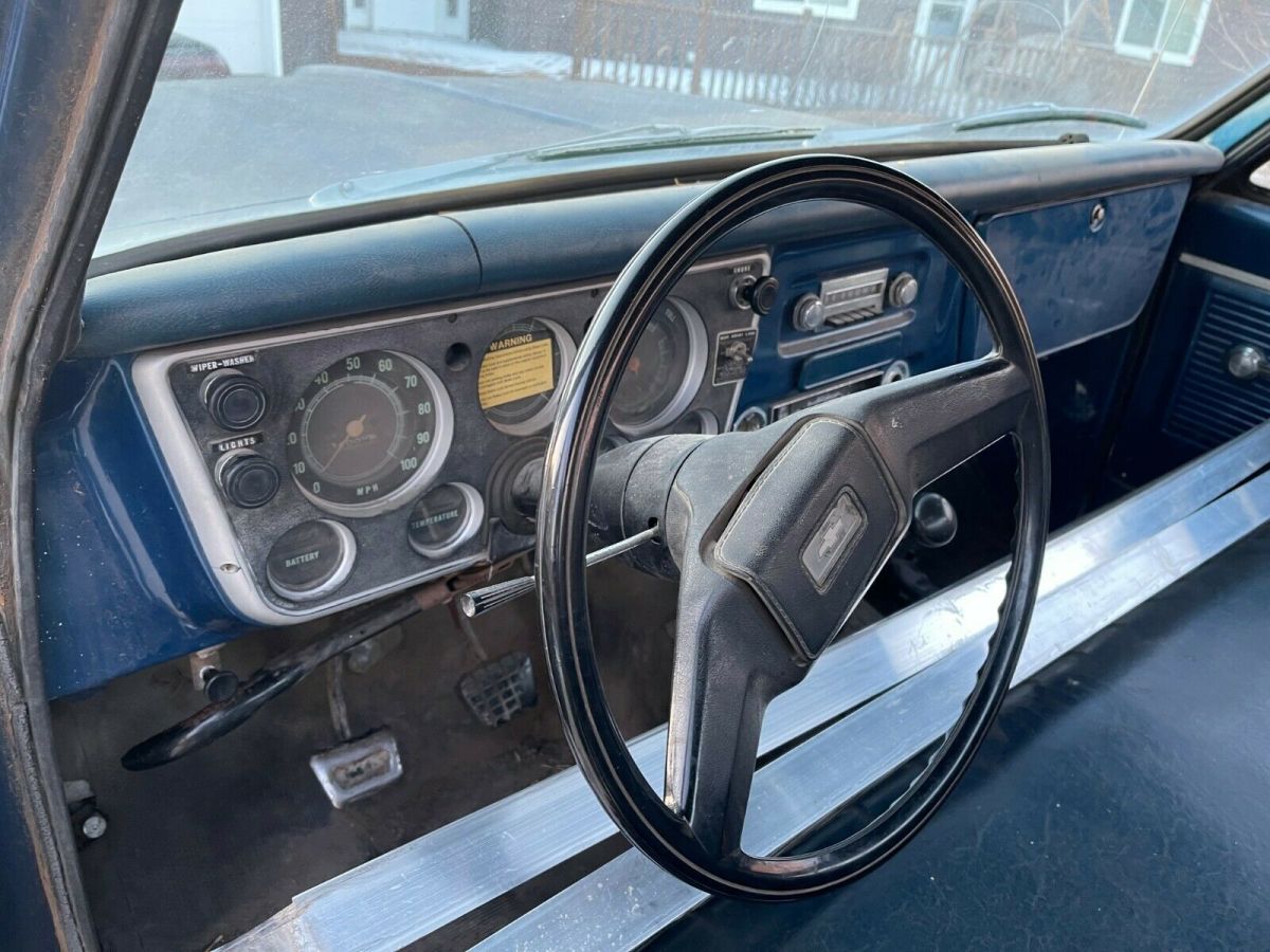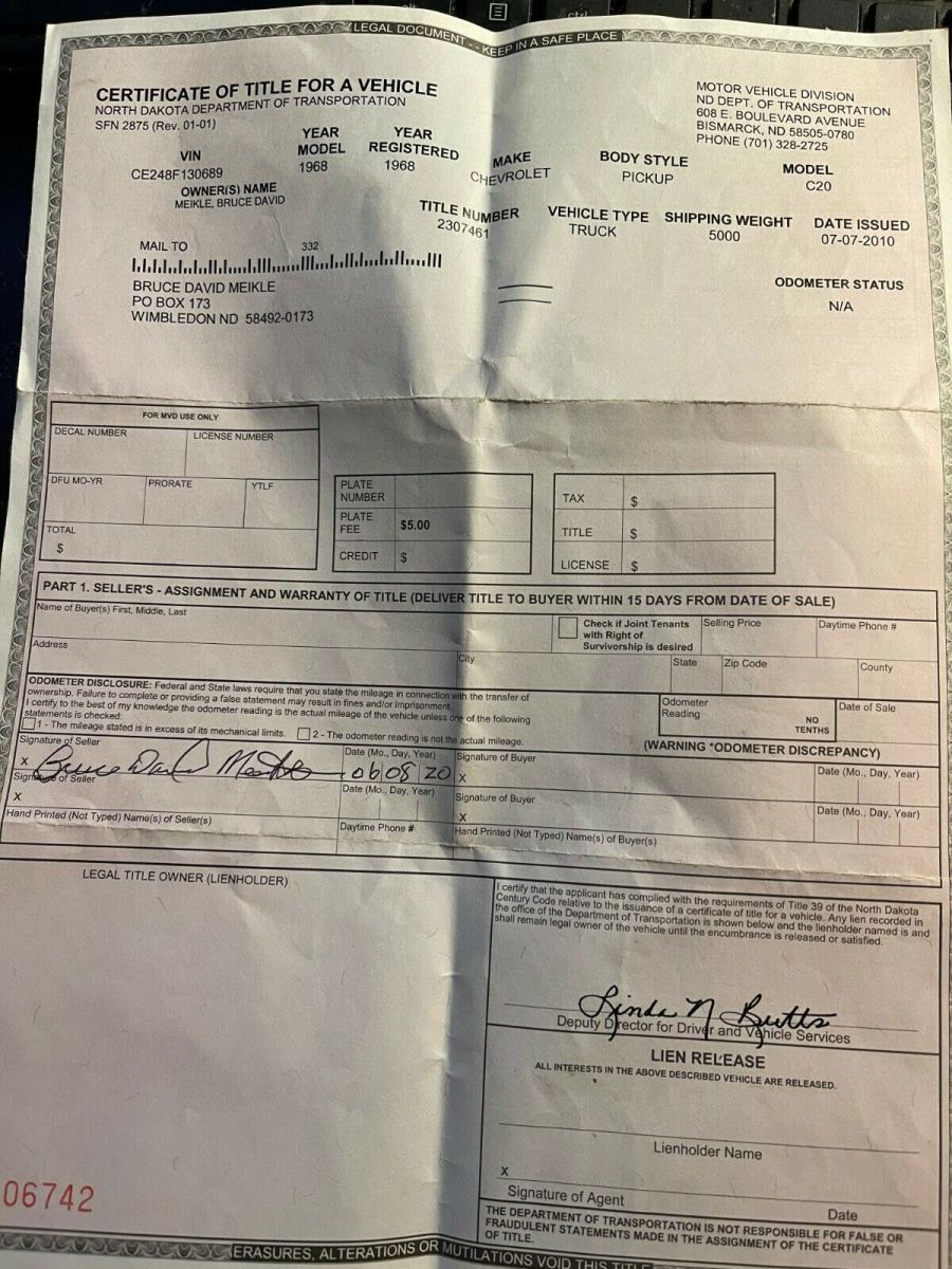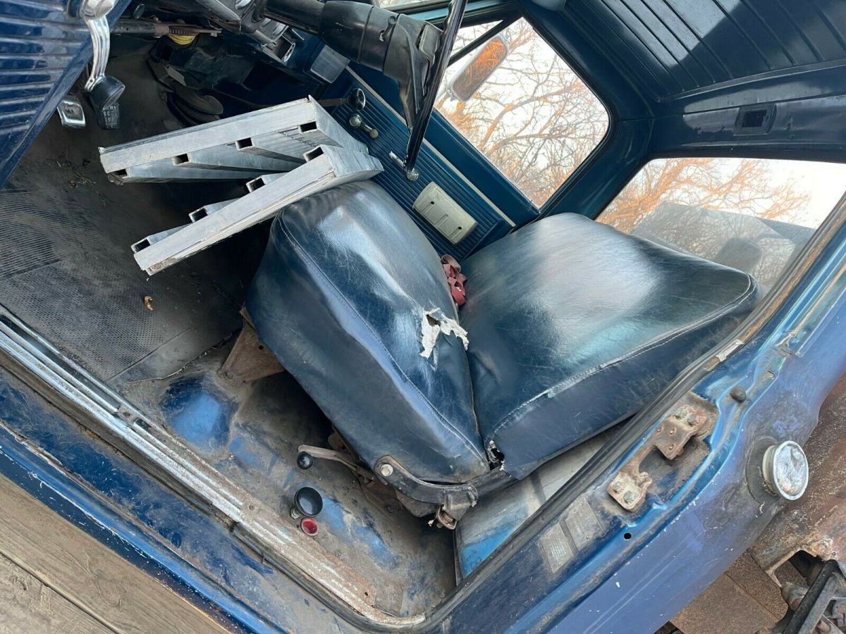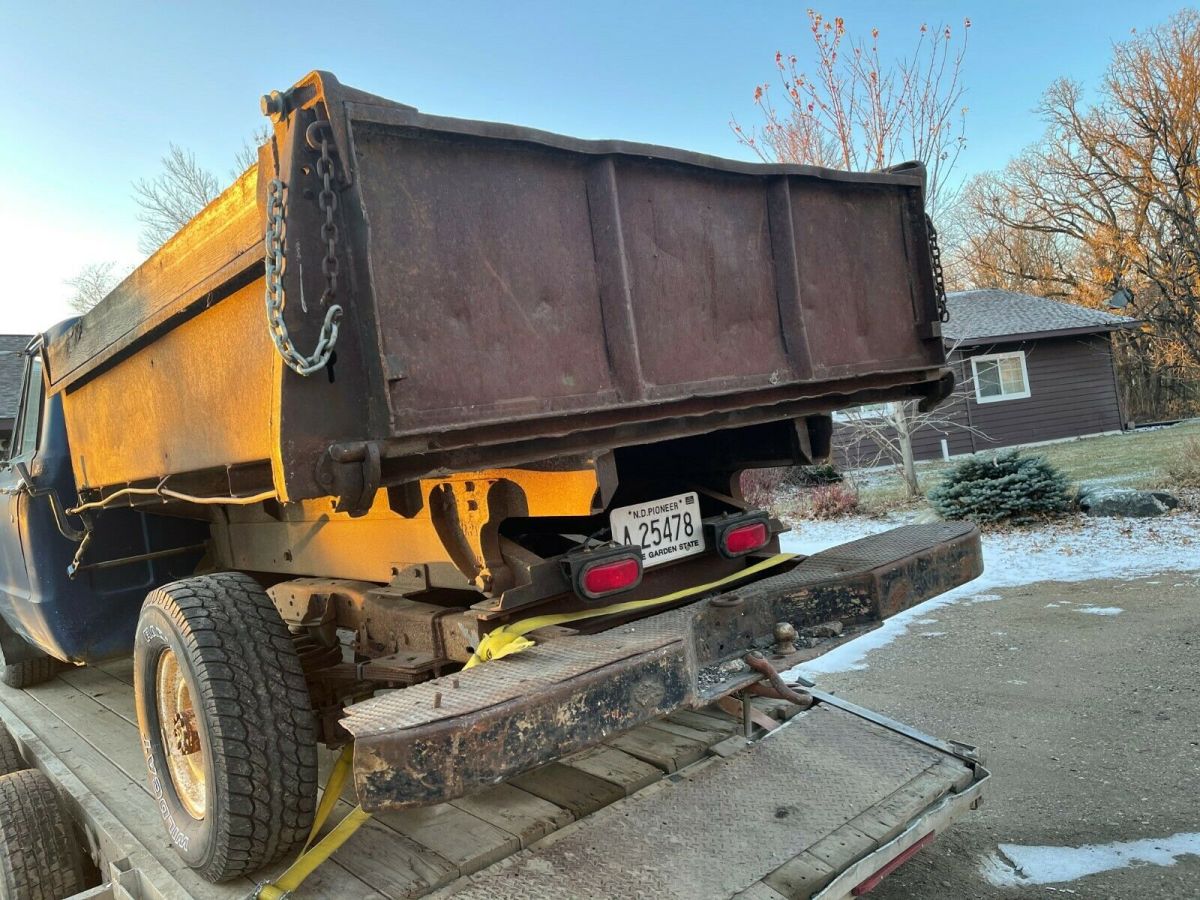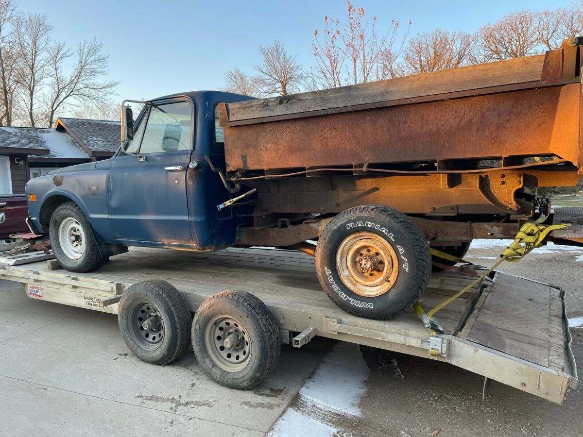 FROM NORTH DAKOTA IS A1968 CHEVROLET PICKUP;ITS A C-20 THREE QUARTER TON.THE BED HAS A 2 YARD DUMP BOX;THE OWNER WAS USING IT UNTIL A MONTH AGO;THE CLUTCH WENT OUT;IT WAS RUNNING GOOD, HE SAID;YOU WILL NEED TO GET A NEW CLUTCH INSTALLED TO MAKE IT USABLE AGAIN.TAKE A LOOK AT THE PIX,THERE IS NO WARRANTY OFFERED;WE ARE SELLING AS IS.IT HAS WELL ABOVE AVERAGE DECENT METAL.THE ENGINE IS A V - 8 CHEVY; NOT SURE IF IT IS ORIGINAL OR NOT;THE TRANNY IS A 4 SPEED;IT JUST CAME IN FROM A FARM IN NORTH DAKOTA;REASEN HE IS SELLING I, HE DOES NOT WANT TO BUY A CLUTCH AND HE IS RETIRING.THIS IS JUST A 3 DAY AUCTION.I CAN HELP WITH A REASONABLE SHIPPING QUOTE.JEFF 218-464-2821