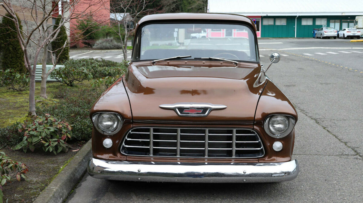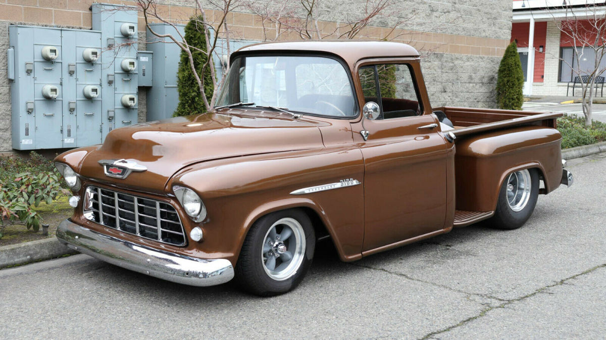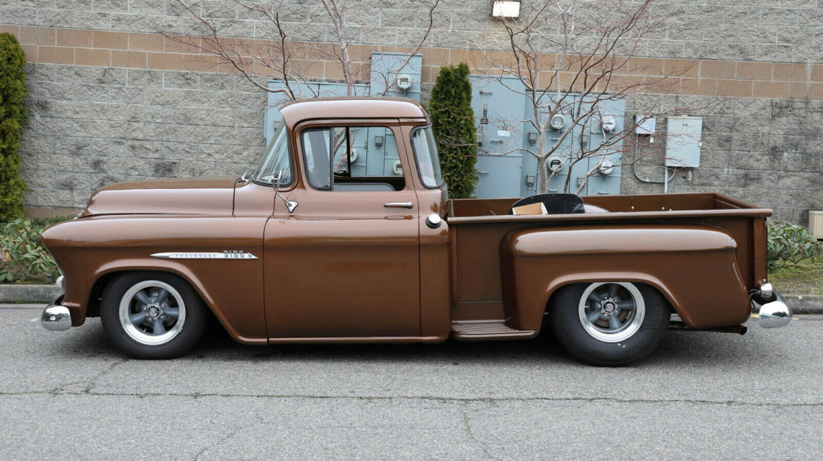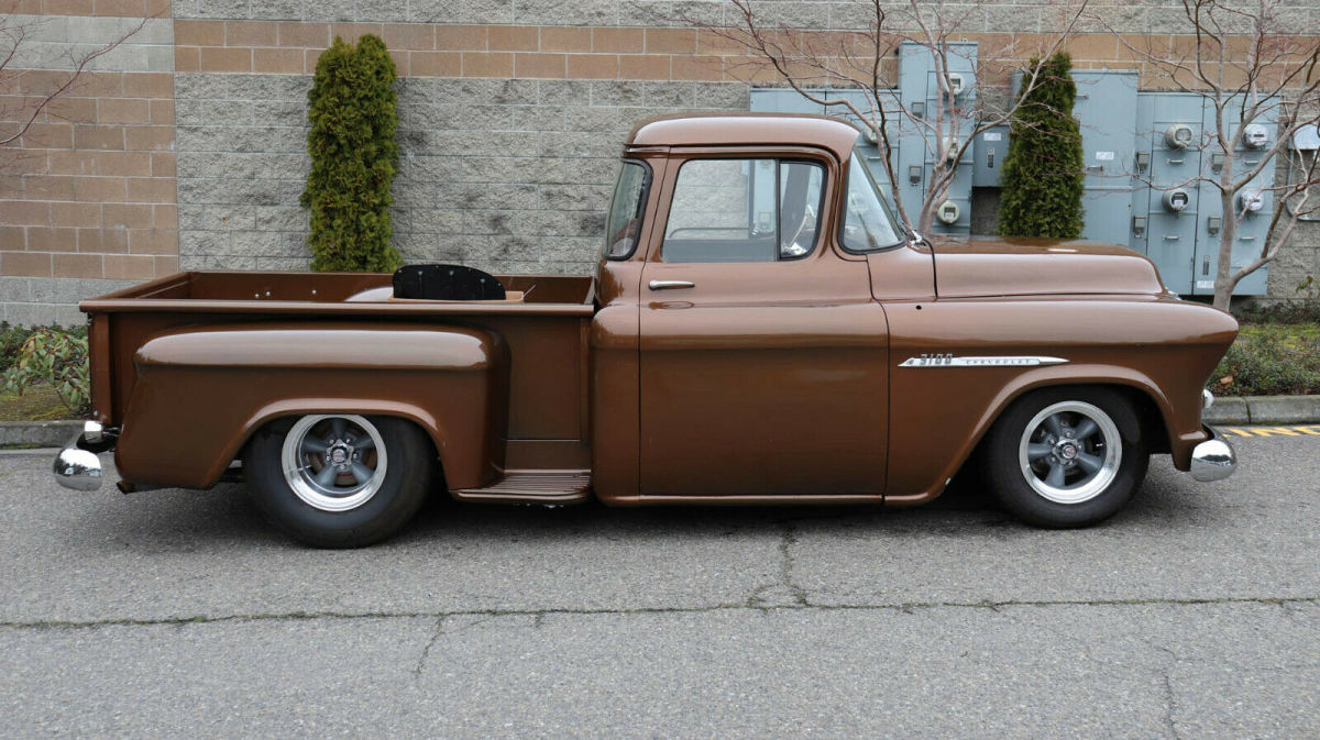 Description: 1955 Chevrolet 3100 1/2 Ton Short Box "Big back window", "slammed", raised bed floor 427 c.i., Weiand street blower, approx. 450 h.p. Holley dual feed, big headers, 4-core aluminum radiator Auxiliary fan, tubular a-arms, adjustable coil-overs Vented drilled disc brakes, new heavy 4-speed, Hurst shifter Clutch assembly, new 9" posi with 3.25 gears, "freeway friendly" New independent front end with QA1 shocks, super solid 15x8 & 15x10 traditional Americans with 245/60 fronts 295/65 rears 3 owner truck, gas tank mounted in rear, extra room in cab Tilt column/trick billet wood wheel, fast, fun, affordable Less than 500 miles on running gear Most parts are new - not rebuilt Re-chromed front/rear bumpers & grille V.I.N. H2550004428 Stock # 25580 20,108 miles $39,950 For more info please call Louis Lamb 425-343-7079, Kent Chaplin 206-713-7844 or Adolfo Sandoval 206-683-5855
