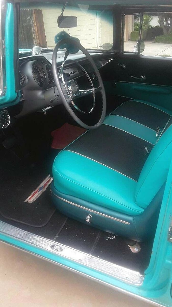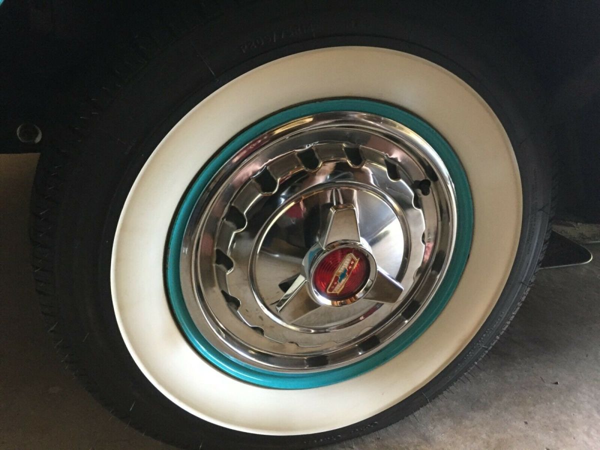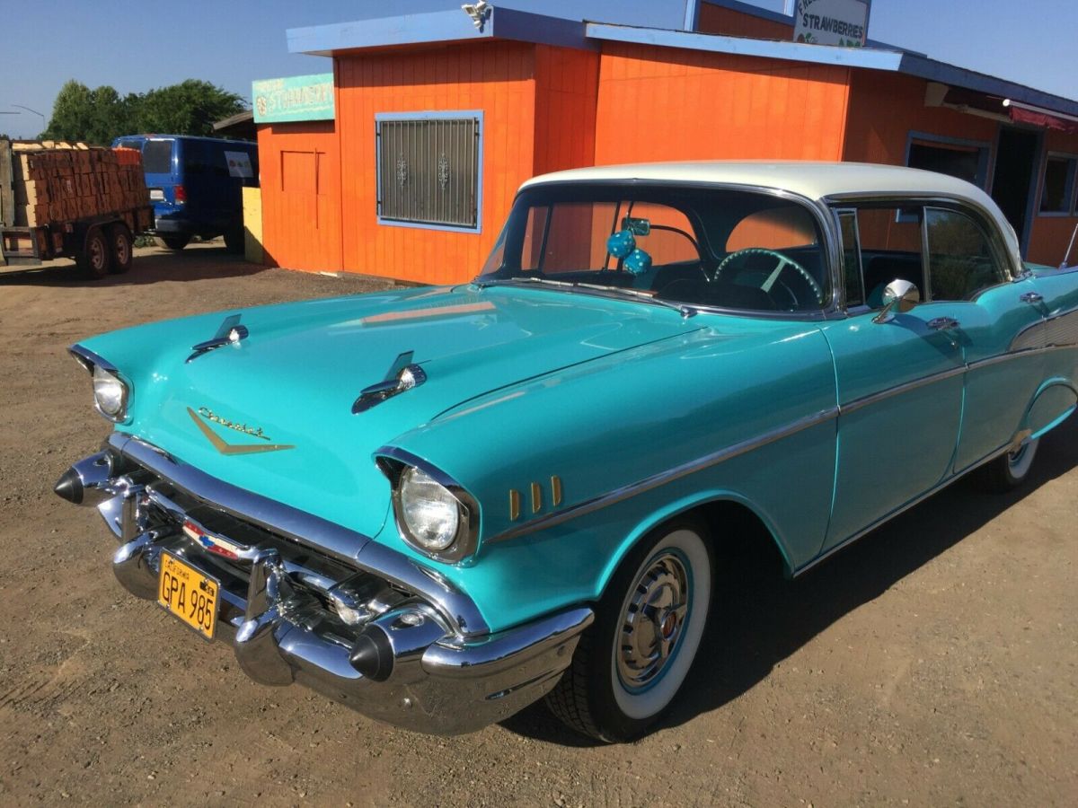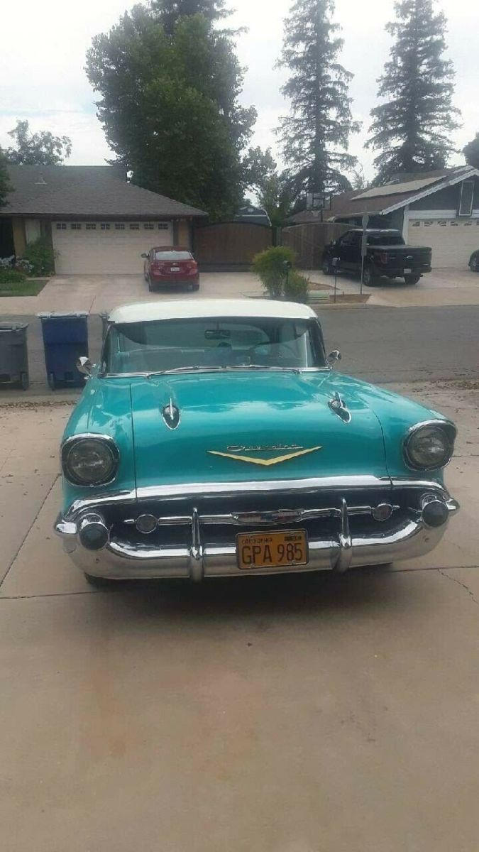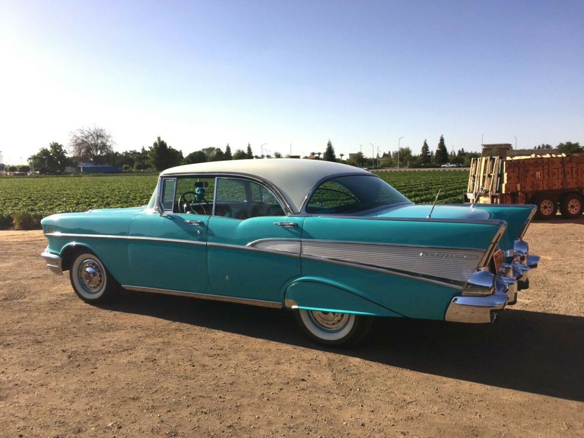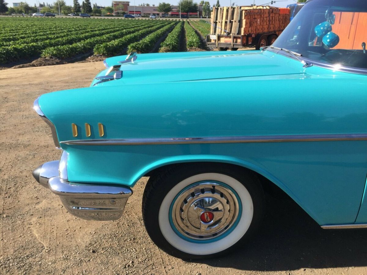 RARE1957 CHEVROLET BEL AIR 4 DOOR HARDTOP SEDAN is in amazing condition! OriginalOEM color: Tropical Turquoise / India Ivory exterior with Turquoise/ blackinterior. 283ci V8 Engine, four-barrel carburetor, Power Glide Transmission. Ihave religiously maintained and pampered and lovingly cared for this beautifulcar myself! Amazing extras: Continental Kit, air conditioning, powerwindows, factory tinted windows, new tires, dual exhaust, new chrome all theway around, power steering, dual antennas. Everything has been reconditionedfrom bumper-to-bumper. Interior is brand new stock, and original radio works. |