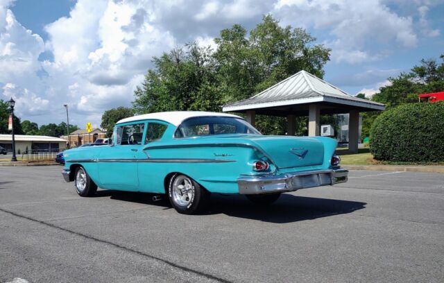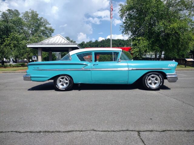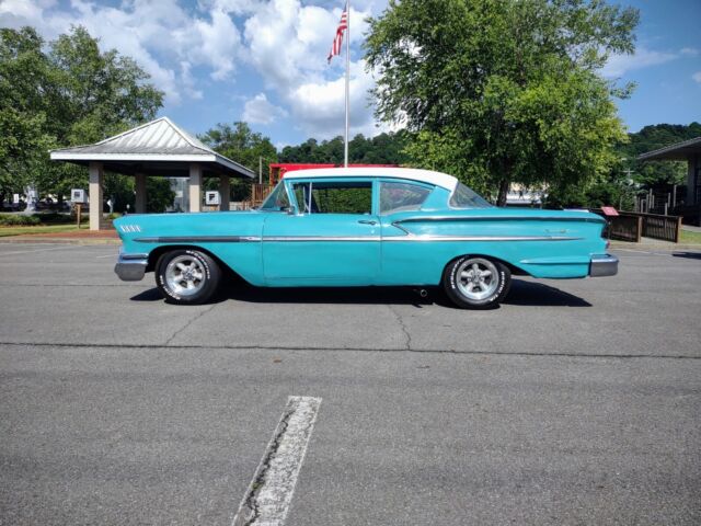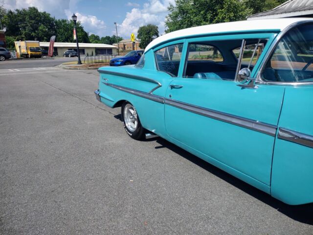Chevrolet Bel Air/210. 1958 Chevrolet for sale. Has a stout 283 V-8 with Saginaw 4 speed and Hurst shifter. Has a 4 barrel Rochester carb. Exhaust is stock manifolds with glass pack mufflers. Exhaust is ran out front of the rear wheels with chrome tips. Car packs a cool, aggressive sound! Not a show car but has good paint and chrome. Paint is 1958 color Indian Turquoise with a white top. New wheels, tires, front and rear shocks recently added. Has manual brakes. The master cylinder and the wheel cylinders have been replaced. Chevrolet has an Ididit tilt steering column with 15 inch steering wheel modeled after the top line Impala steering wheel. Car has manual steering but still turns easily. Bumpers are original in good condition. Has a new windshield and interior is about 3 years old. Seats are a custom stitch. Headliner is about 3 years old and in great condition. Has a 3 pack gauge setup and a Moon Eyes tach on the column. Has had the floor pans and trunk pan replaced. All lights and turn signals work. Car has mostly new wiring and a new speedometer cable. Also I recently added a new battery and alternator. Bel Air emblems on quarter-panels are 1954 Bel Air emblems. Has windshield wiper vacuum setup but it recently stopped working. Has a new emergency brake cable but needs adjustment. Have Georgia title for car. ****Not part of this auction but if the buyer is interested I have a 348 tri-power motor that I can sell separately from the car. It is complete, has about 1500 miles on it and ready to bolt into a car. |