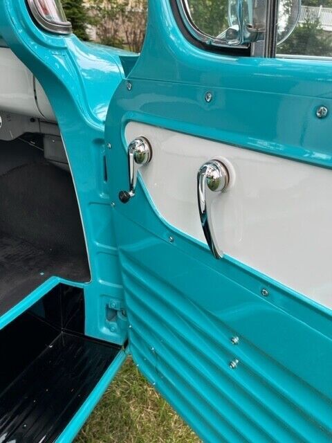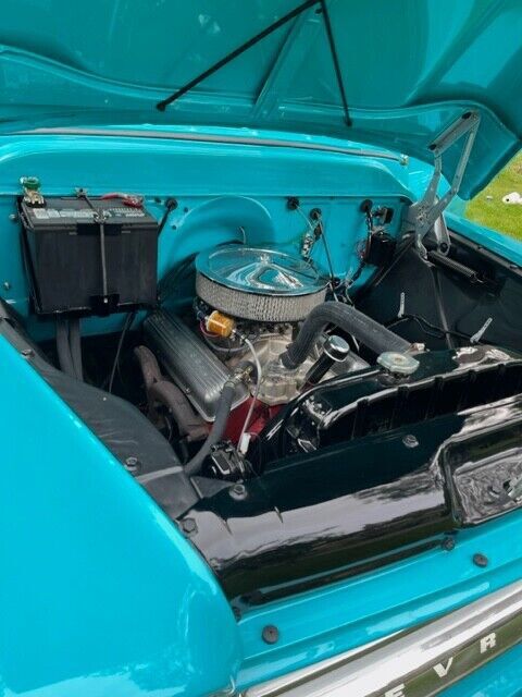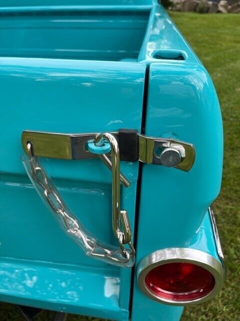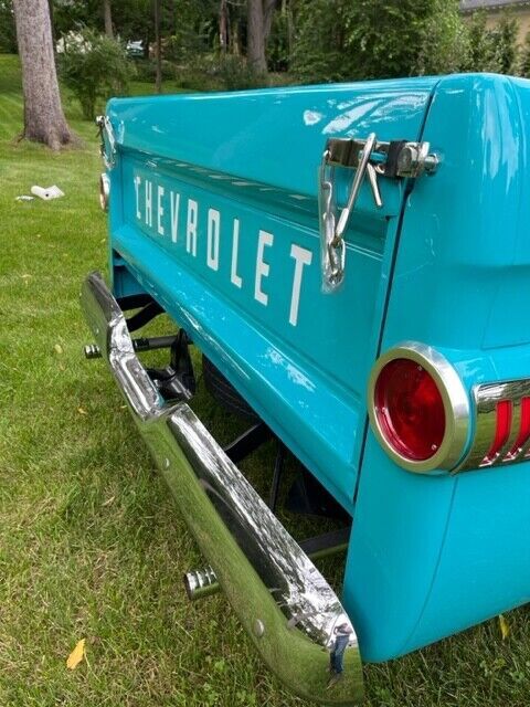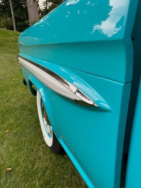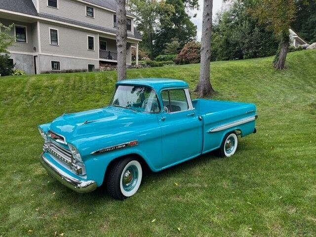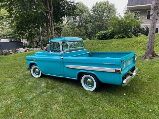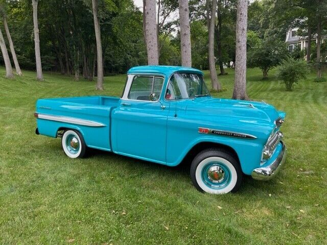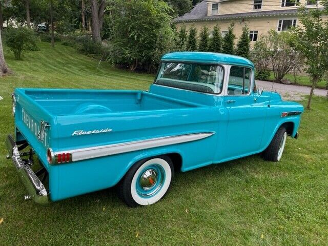 Absolutely stunning 1959 Apache Shortbed Fleetside in amazing condition-Owned and Restored by an auto bodyshop owner...the paint is immaculate and laser straight. It is a beautiful GM color "dawn blue" and is fantastic in person. All the metal was media blasted and restored, then repainted. The steps and cab corners are replaced and are professionally done...not a hack job they look perfect. Floors are original and mint. Tailgate, doors, bedsides, hood all original metal, Wheel tubs are replaced and look excellent. Bed floor painted shiny black with stainless trim and hardware. Interior all restored, headliner, seat rebuilt and new custom houndstooth seat cover over rebuilt and restuffed seats. Inside all stripped and repainted. Every single thing works on this truck...lights, heat, blinkers, everything. Custom dash mounted original 1952 Chevrolet electric clock works and looks like it was there from day one. Retro stereo works as does the speaker above the windshield!!! Has two speakers hooked up behind the seat as well. Again, the color on this truck is fantastic...and the metal and paint looks better than new. This truck is amazing and will not disappoint. It drives great. -Base coat clear coat new paint throughout-Mechanically excellent, 283 previously rebuilt and runs great with later model GM rear end for highway travel, and upgraded disc brakes!!-New front and back glass, new gaskets everywhere, new wipers, new bumpers, new tires and wheels, new rubber mat inside, new radio, new radiator, new hoses, etc etc...NOS hood hinges!-Original grille and emblems are excellent. Original jack included!-Underneath is super tidy and not all gunked up with undercoat to hide anything...not overdone and just sprayed with chassis oil to keep it fresh looking.-Glass goes up and down perfectly, vent windows great, doors shut and are aligned excellent.