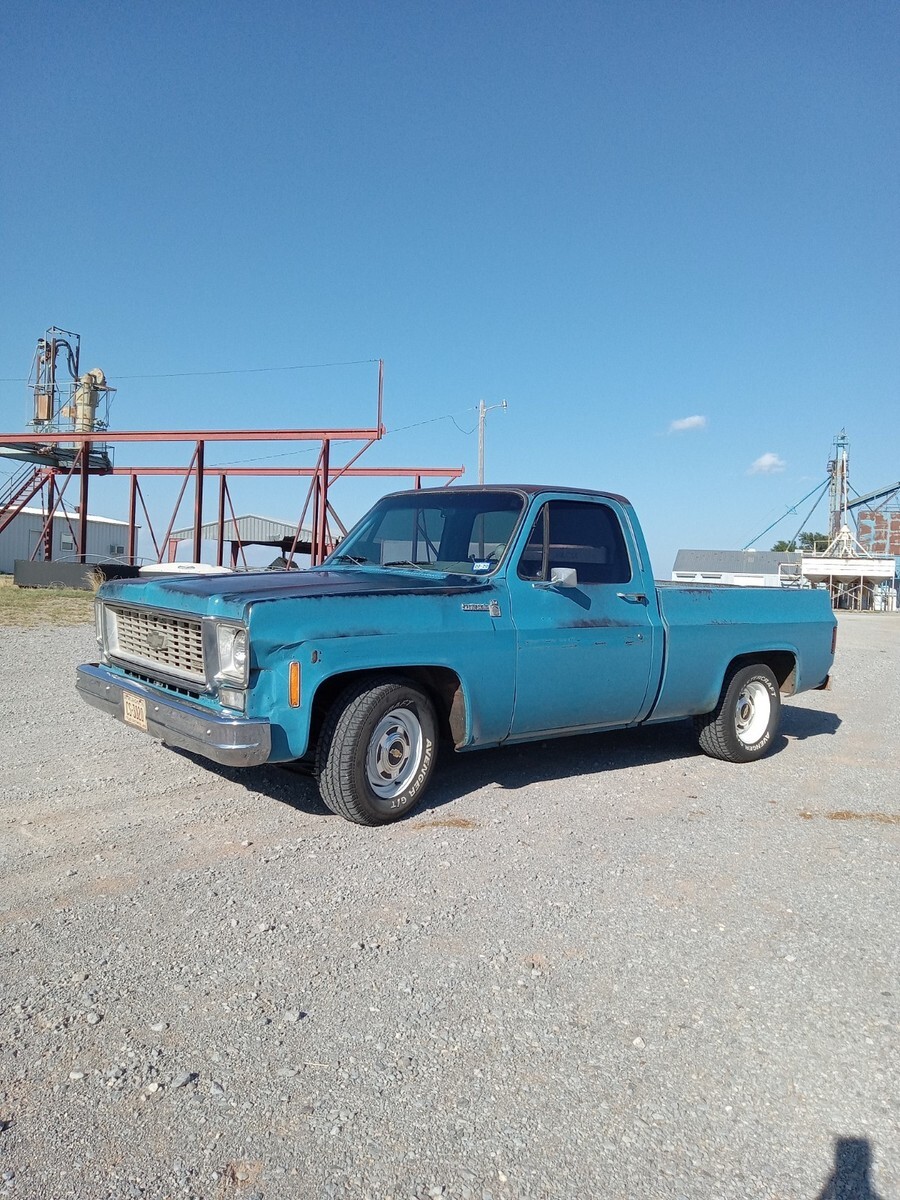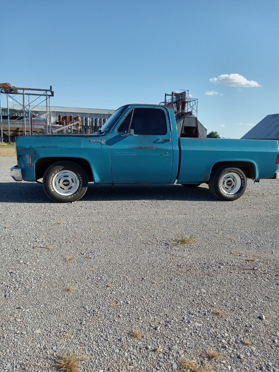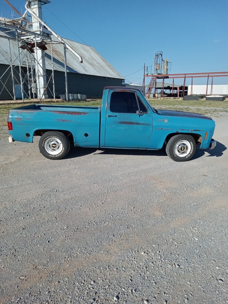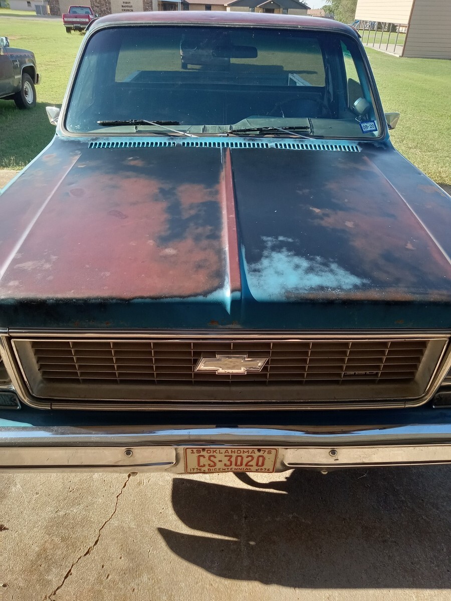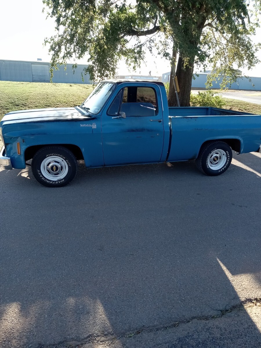 1976 chevrolet c10, short bed, 3 owner Texas truck now resides in Oklahoma, original Hawaiian blue paint, nice patina that was buffed out and then used vice grip garage shine juice to give it a nice matte finish, blue interior with factory blue rubber floormat, Scottsdale package, interesting factory packaged truck, 350 4barrel, 350 trans, 3:42 12 bolt, non power manual disc brakes, 56 inch heavy duty leaf package, hd brakes, factory ac works but compressor just started knocking-will need a ac job and it was new 5 years ago-was converted to 134a, power steering, lowered 2/4 by using mcgaugheys 2 inch front sprindles and removing some leafs in back (still have the leafs if new owner wants them) and shackles-not c notched, drives and rides nice!!!! some new front end pieces like lower control arm on driver side and ball joints, truck is a great driver will drive anywhere and is a real tight driving truck, factory rally wheel truck but i installed factory 15x6 gm steel wheels in front and rare factory 15x8 gm steel wheels in back, new mastercraft gt tires 235/70/15 and 275/60/15, i installed a 73-74 grille but have the factory 76 grille and brackets if owner wants them, has cool 70s mods like trailer brake controller, tach on dash, and even cb radio-antenna not hooked up, dual exhaust,only rust spot is driver side cab corner has a lil dime size spot, floors are nice, i got it from a older gentleman from Texas who put a few bumps in it here and there-driver fender has a pretty good size dent in front, pass door has some dings, pass fender was replaced at one point but matches pretty good colorwise, some hail dings in roof but none on hood, new shocks all the way around, new radiator, new distributor, new brakes all the way around with new master cylinder, installed new CPP sway bar in front, could use new pass side vent window rubber- i taped up on inside to eliminate wind noise, had a aftermarket extra gas tank that i eliminated and just use the factory front one, hate to sell but have way too many vehicles right now, questions call or text Brandon 580-774-9223.