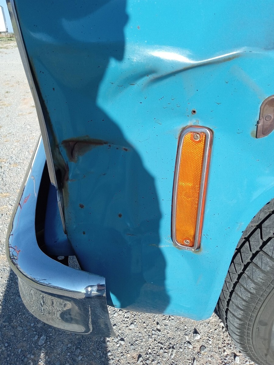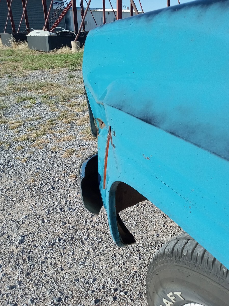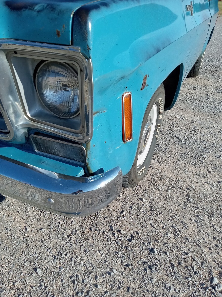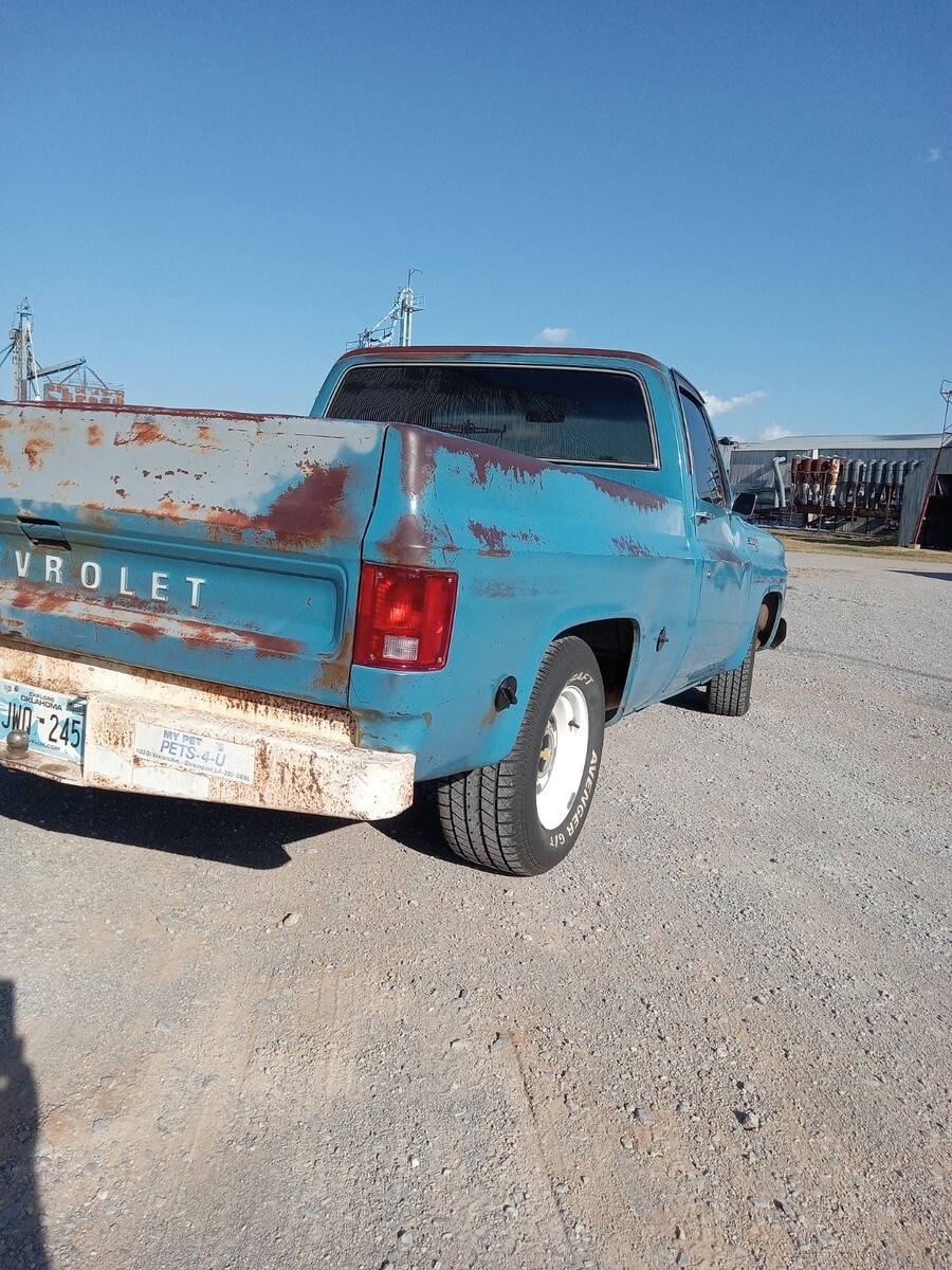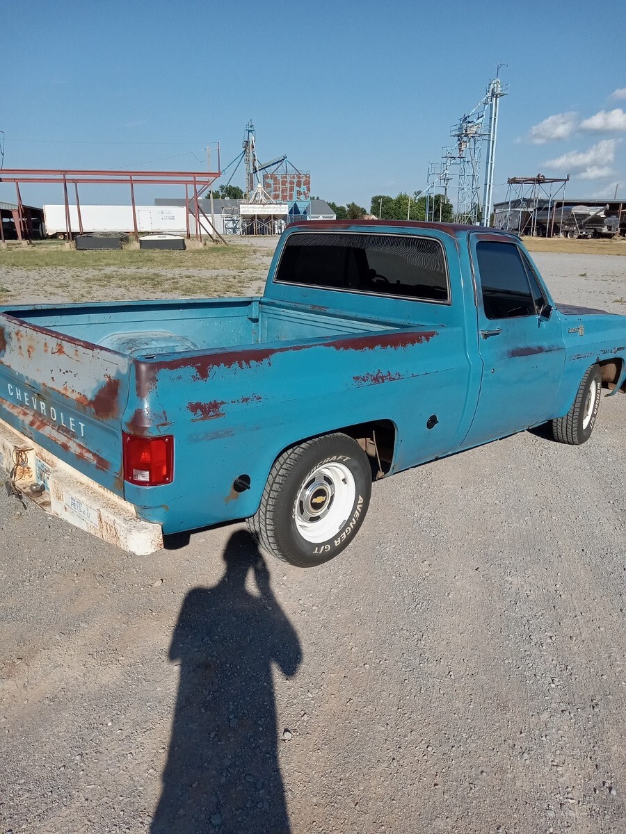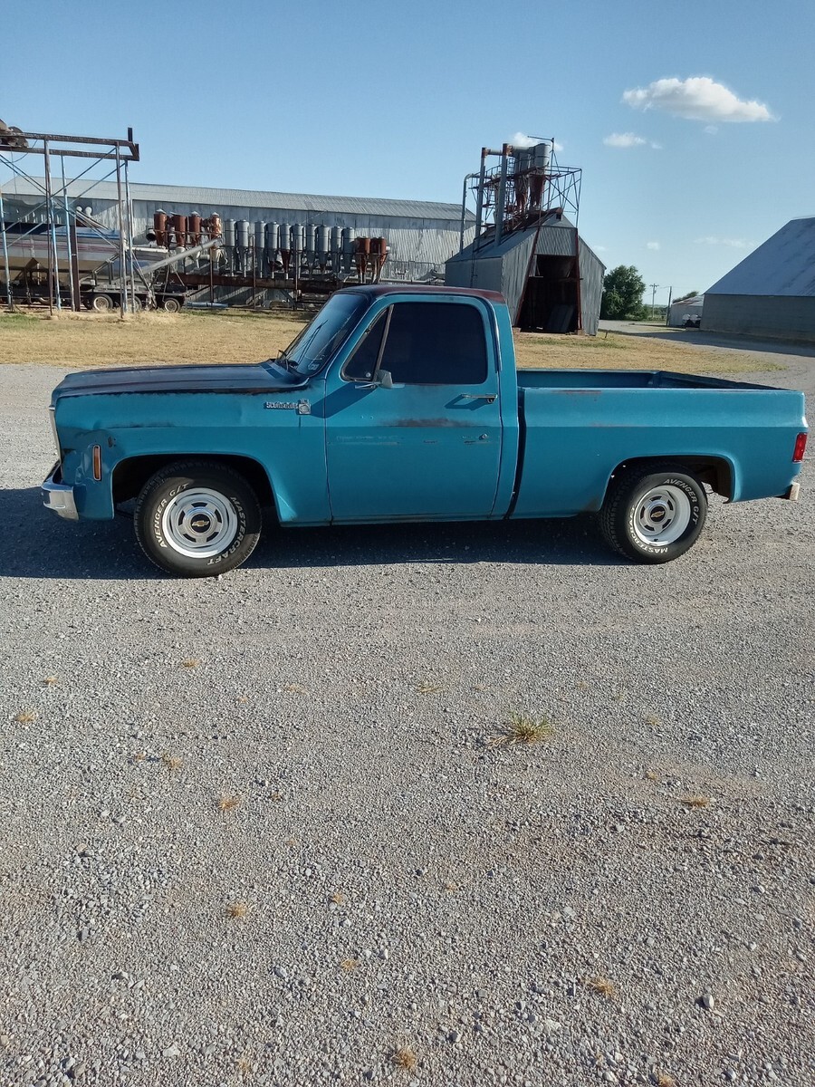 1976 chevrolet c10, short bed, 3 owner Texas truck now resides in Oklahoma, original Hawaiian blue paint, nice patina that was buffed out and then used vice grip garage shine juice to give it a nice matte finish, blue interior with factory blue rubber floormat, Scottsdale package, interesting factory packaged truck, 350 4barrel, 350 trans, 3:42 12 bolt, non power manual disc brakes, 56 inch heavy duty leaf package, hd brakes, factory ac works but compressor just started knocking-will need a ac job and it was new 5 years ago-was converted to 134a, power steering, lowered 2/4 by using mcgaugheys 2 inch front sprindles and removing some leafs in back (still have the leafs if new owner wants them) and shackles-not c notched, drives and rides nice!!!! some new front end pieces like lower control arm on driver side and ball joints, truck is a great driver will drive anywhere and is a real tight driving truck, factory rally wheel truck but i installed factory 15x6 gm steel wheels in front and rare factory 15x8 gm steel wheels in back, new mastercraft gt tires 235/70/15 and 275/60/15, i installed a 73-74 grille but have the factory 76 grille and brackets if owner wants them, has cool 70s mods like trailer brake controller, tach on dash, and even cb radio-antenna not hooked up, dual exhaust,only rust spot is driver side cab corner has a lil dime size spot, floors are nice, i got it from a older gentleman from Texas who put a few bumps in it here and there-driver fender has a pretty good size dent in front, pass door has some dings, pass fender was replaced at one point but matches pretty good colorwise, some hail dings in roof but none on hood, new shocks all the way around, new radiator, new distributor, new brakes all the way around with new master cylinder, installed new CPP sway bar in front, could use new pass side vent window rubber- i taped up on inside to eliminate wind noise, had a aftermarket extra gas tank that i eliminated and just use the factory front one, hate to sell but have way too many vehicles right now, questions call or text Brandon 580-774-9223.