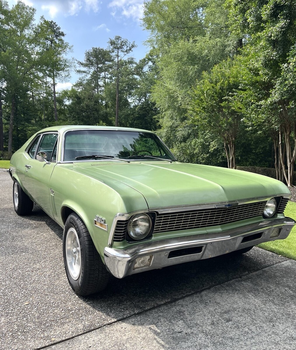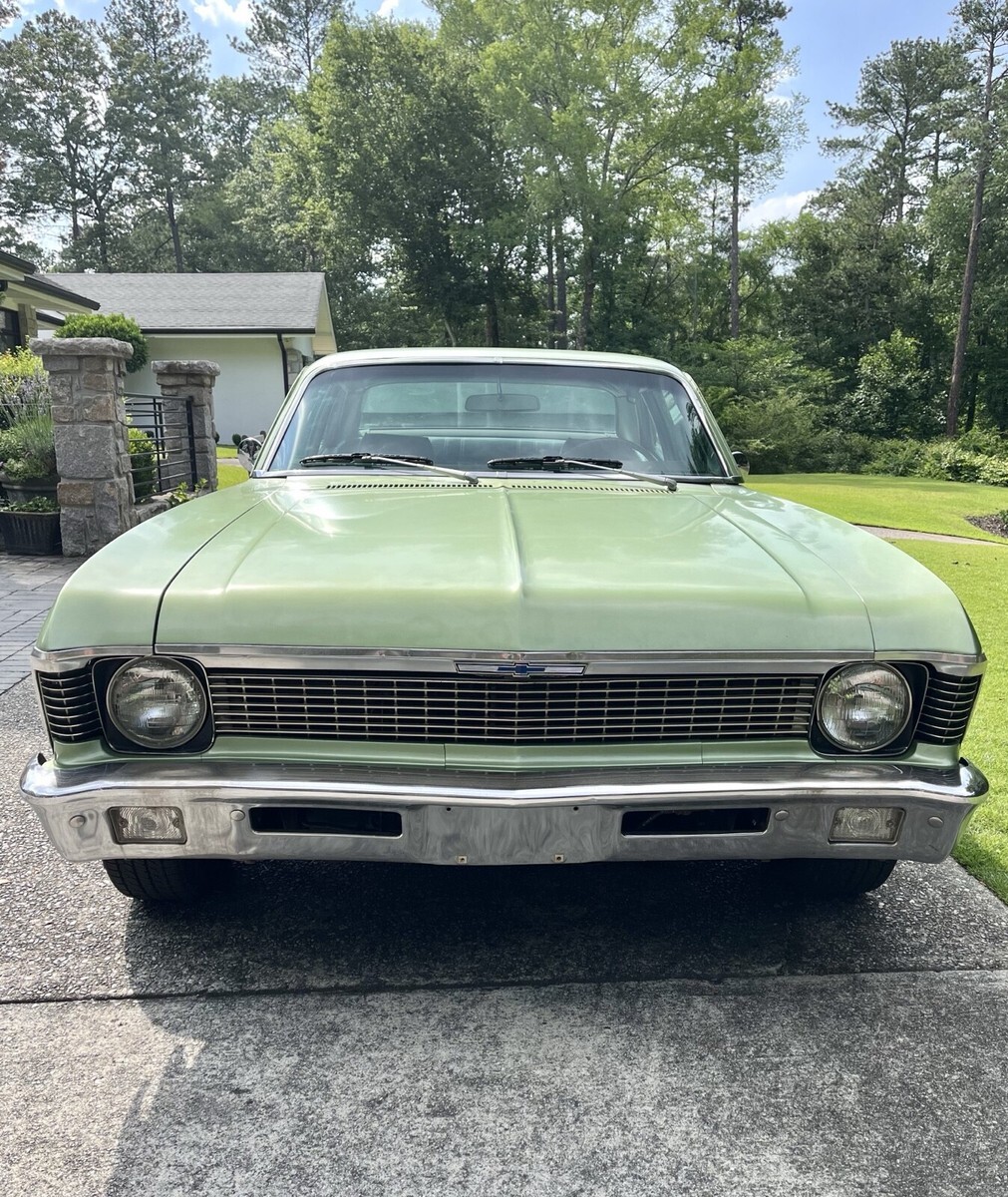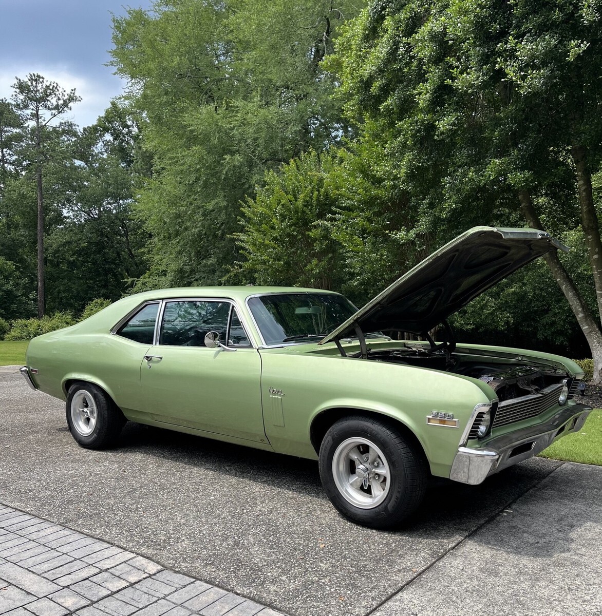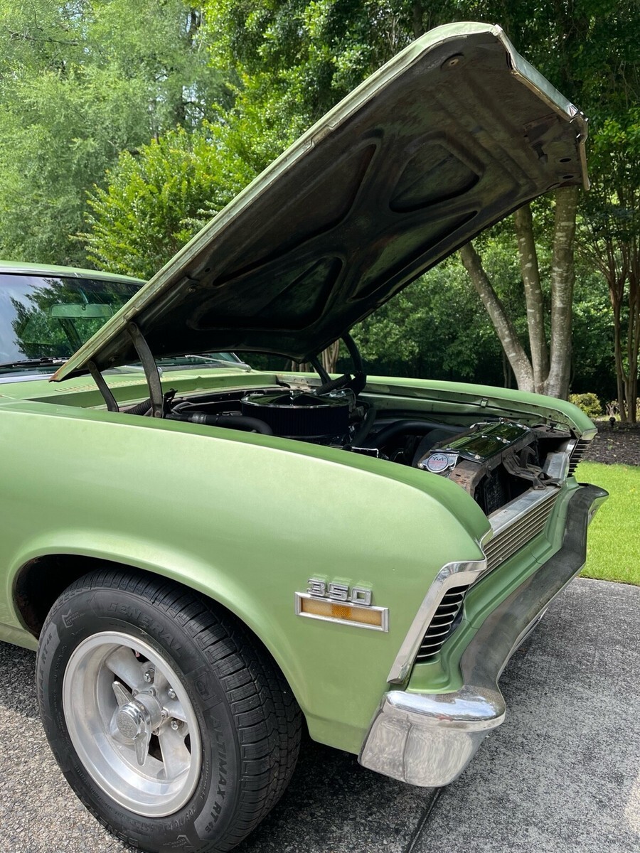1970 Chevrolet Nova 2 door coupe. Factory V8 car! Now has a 400 ci small block with a streetable cam. Factory color green mist paint, air conditioning, power steering, bench seat, power brakes, front converted to disc. New tires, master cylinder, brake booster, rebuilt carburetor, wheel cylinders, brake hoses, shocks, front floor pans, carpet, headliner, rebuilt matching numbers automatic transmission turbo 350, aluminum radiator, belts, and hoses. Rust in door corners, lower quarter panels, and trunk edge. AC hasn't been converted to R134A so the belt is off of the compressor. Everything is there to make the conversion and recharge the system. Also included: NOS side moldings, new headlight brow moldings, new window felts, AC/Heater control face and chrome knobs, rear door panels, Super Sport grille, and misc stainless trim pieces. Clean Georgia title. Vehicle Details All mechanical work has been done to make this car reliable. This is not a show car but has lots of potential once body repairs have been made. |