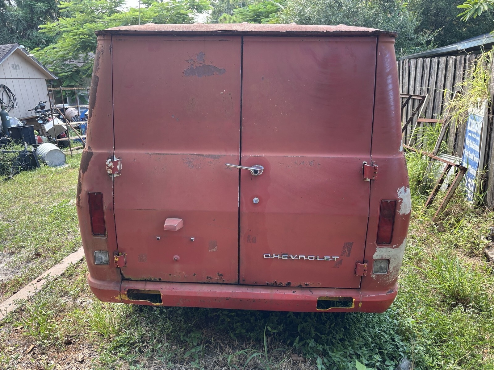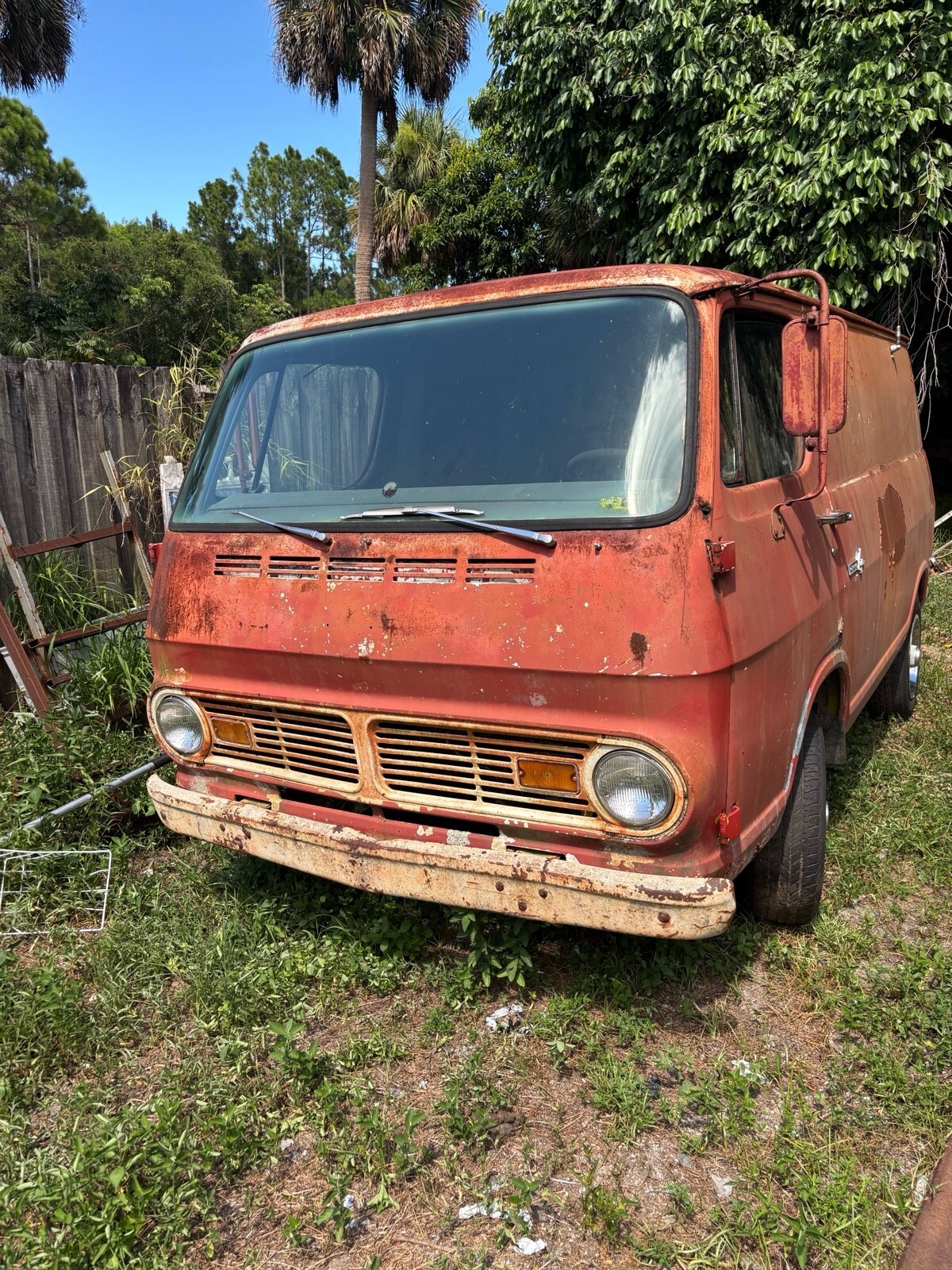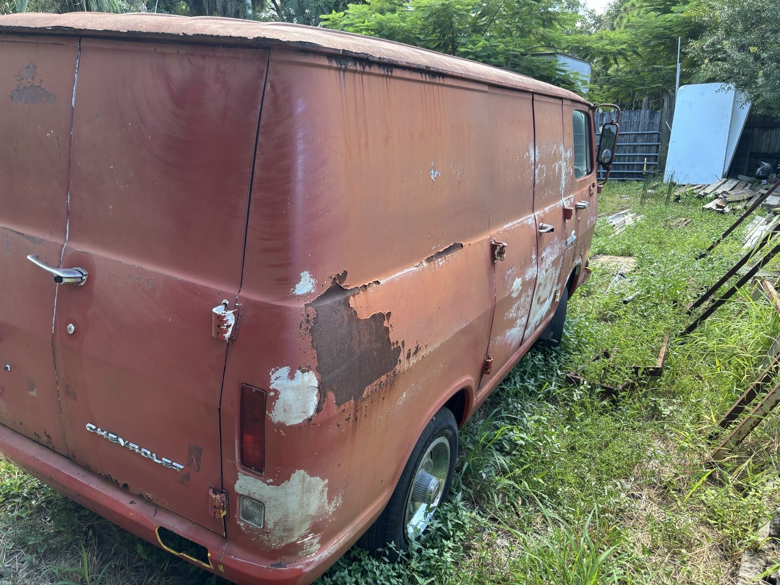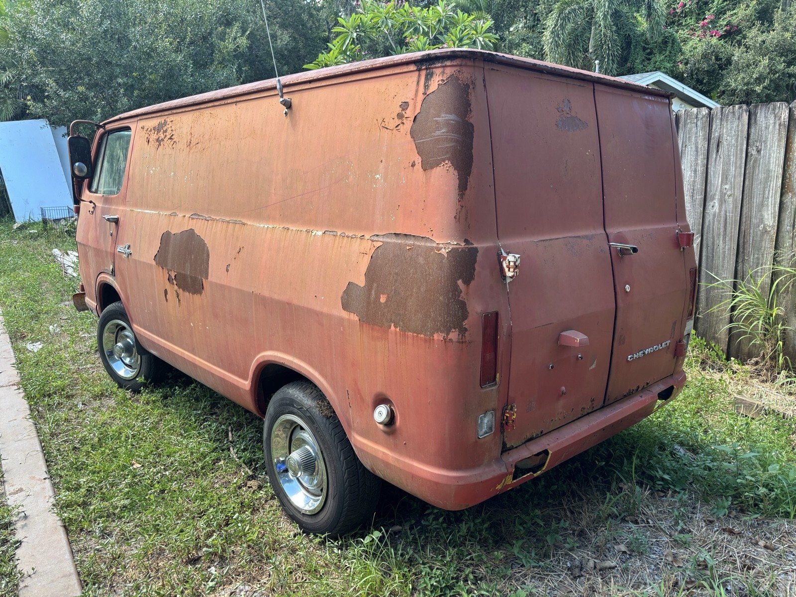 1967 Chevrolet Chevy Van 90 panel delivery. Doghouse set up for V8 but engine is not included. original manual transmission and Bell housing is included three on the tree. Lots of extra parts. Doors open and close and and latch. Typical rust on bottom of doors and fenders, but rockers are virtually rust-free. Same owner 48 years. 1977 clean Florida title. Great candidate for restoration Vehicle Details Please see pictures and if there is an area that I missed that you want to see, just ask. |