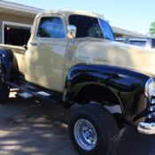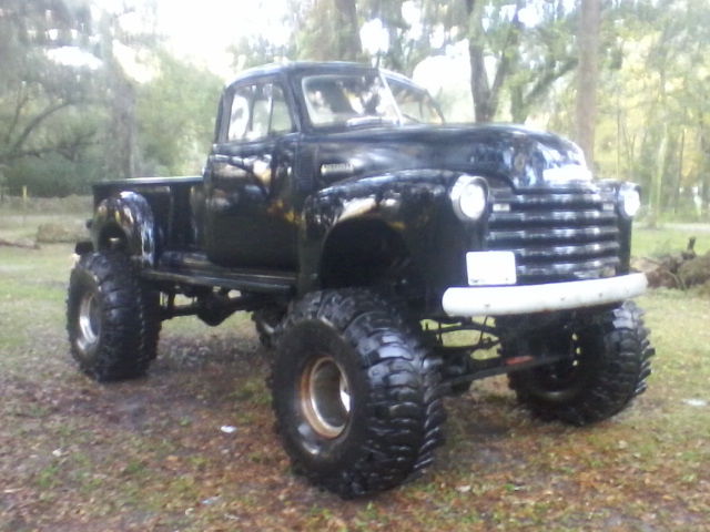 | 1952 Chevrolet with a big block 454 Last registered and driven on the road in 2010 sits on 44* inch superswampers and is approx 8ft tall owner befrore me used it as a daily driver to go back in forth to work i bought it when i didnt even have a drivers license thought it was cool also bought a 1968 gto to run down the track in defiance i guess . shes been sitting in my daughters back yard for a couple of years i start it once a month gas tank is located in the back of the truck and some water got in the tank ive drained the tank put put on o holley 650 she runs fine now bands in the tranny were a little dry i put some lucas non slip in and now she catches enough to spin the tires bed was soft so i took it out. frame i believe is a k5 blazer maybe a k7 and all undercoated cab is all original inside theres a little rust under the rear window of the cab and on the inside bottom of the door i have the new trim for the door areas and there not all that bad. Theres alot of truck here and a real head turner ive tried to give an honest description of the truck she will start up and drive down the road right now but it will need a little care lights all work but you really have to stand on the brakes to get her to stop. open to all offers sold my boat to put a kitchen in for the wife might take a boat and some cash. |