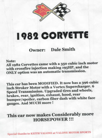 | CUSTOM Corvette. Very fast. over $65. 00 invested. 4 Bolt Main 350 block bored . 060 over. 10-1 forged pistons. stroked to 396 cu. in. 625 lift-262 duration hydraulic roller camshaftEagle forged Crank and 4340 H-Beam RodsAll Pro aluminum cyl heads. 2. 05 intake valves. 1. 06 exhaust valves. double springs. Scorpion 1. 6 roller rockersElderbrock intake. 850 cfm quick fuel blow thru carbM. S. D. Distributer. coil. 6AL box. Boost timing controller. plugs. wiresMoroso oil pan. Breather tank and 1way valve cover fittingAeromotive fuel pump and filterVortex Super Charger with custom brackets and pulley set up. Running 7 lbs boostMcLeod pressure plate. disk and flywheelLakewood bellhousing custom welded to accept a ZF6 Corvette 6sp trans1970 complete cast iron rear assembly. cross member. haft shafts and drive shaft. 3. 73 gears with Eaton posi. With all poly mounting bushings. narrower rear fiberglass leaf spring to make room for the widened 10 in rear. 8 in in front Gragar SS wheels and bigger tires. adjustable rear strut rods. Chrome Hooker side exhaust headersWhite face Autometer gauges custom installed in REAL Carbon Fiber panelsCustom 4 in Cowl HoodCustom rear Daytona bumper and tail lightsComplete front suspension with poly bushingsStainless sleeved brake calipersFeatured in CORVETTE WEB MAGAZINE www. corvetteweb. com/dale. htmlsee video at https://www. youtube. com/watch?v=HYBvy4AUWH4&feature=player_detailpage For questions or more information please call Dale@ 239-671-2378 |
