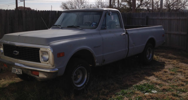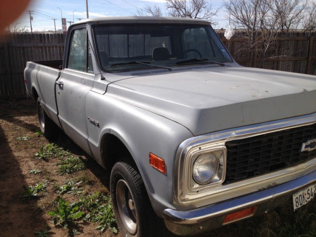 1972 C10 Chevy pickup, or parts or restoration have clean TX title, needs 350 engine repaired, will not rotate but did run very well just stopped cold, possible broken timing chain). Automatic transmission, good tires. I planned to restore it but because of health problems I am not abled to do now. Wife wants it gone & could be good deal for you. Body has some work to be done but is complete, long bed. I just have not done anything since I got it, except move it arond it was stored inside several years. Its jacked up off the ground as to not rot the tires.FREE, ES FREE West Texas dust & dirt included with sale!! $250.00 nonrefundable deposit to be made within 24 hours after end of auction through PayPal. Balance due within 7 days (PayPal, cash in person, or cashier's check). If you have any questions or need to see more pictures please email me I will try to respond as quick as I can. Vehicle needs picked up within 14 days unless other arrangements have been made vehicle is being stored outside.