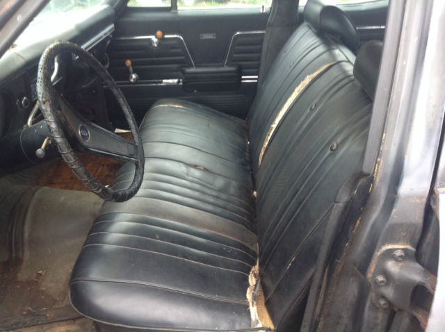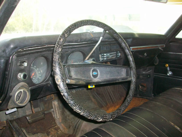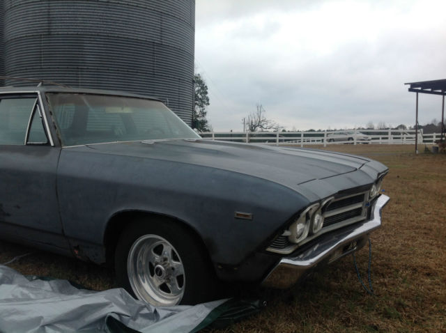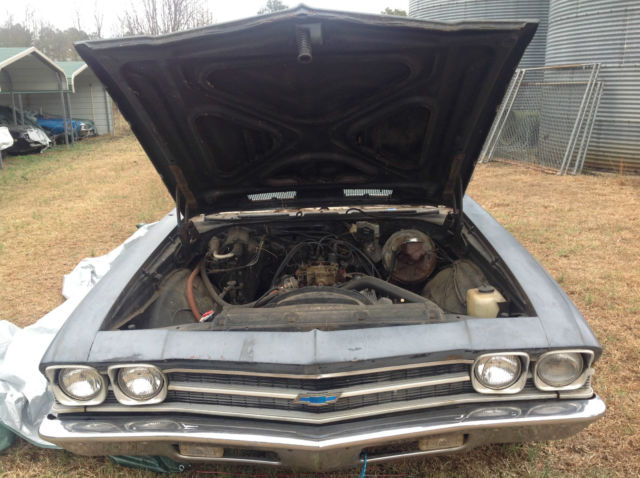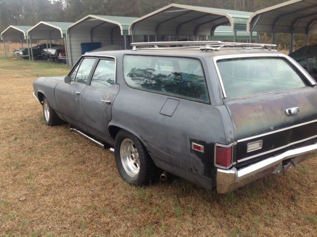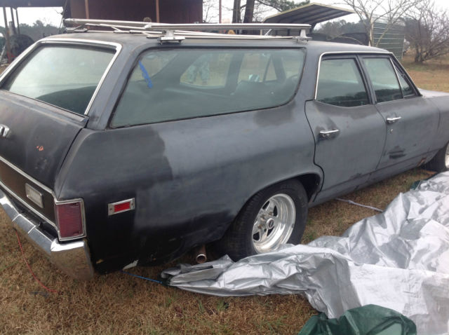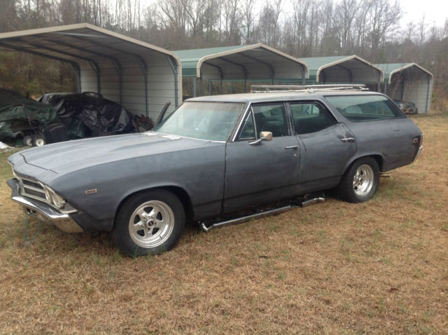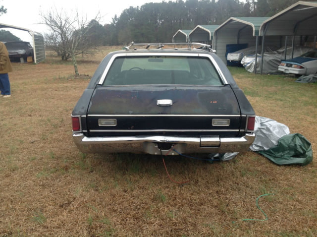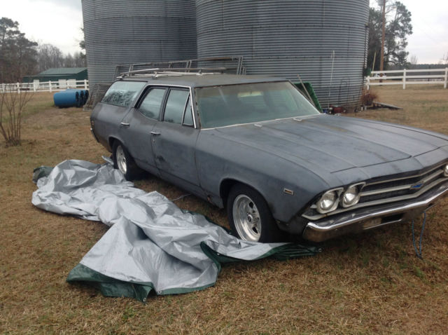 Excellent project platform to build a hot rod/ rat rod wagon! It is a 1969 Chevelle CONCOURS wagon, 6 passenger. 350 V8 engine with powerglide transmission, 10 bolt rearend and dual exhaust. North Carolina title and car...Body is overall decent with rust or repaired areas limited to the common areas ( lower front fenders, lower quarters, around rear side glass) Floor pans, frame look nice. The floor in the rear storage area has holes near the drains ( see photos) The gas tank needs repair or replacement for the engine to run and the brakes need work. I have owned the car several years and driven around the yard and neighborhood in the past but I let it sit in storage and the gas tank started leaking and the brakes need work. My plans were to put disk on it but never did.I installed a new radiator and water pump prior to storage. I can start the car so you can hear it run but it will have to be towed onto a trailer. Has a SS hood, original black interior, no carpet or headliner ( headliner bows still intact) dash pad cracked, was a factory A/C car but no longer hooked up, Power brakes. Rear bumper is dented but a very nice replacement comes with the car. It is missing some window trim pieces ( I pictured the pieces that I have and the extra parts I have for it) Comes with the roof rack but has not been installed, dual hinged tailgate with manual rear glass. Wheels/Tires are included with the buy it now price otherwise it will have rollers for transport. Pick up only, Payment due within 48 hours of auction end. please email me if you have any questions.