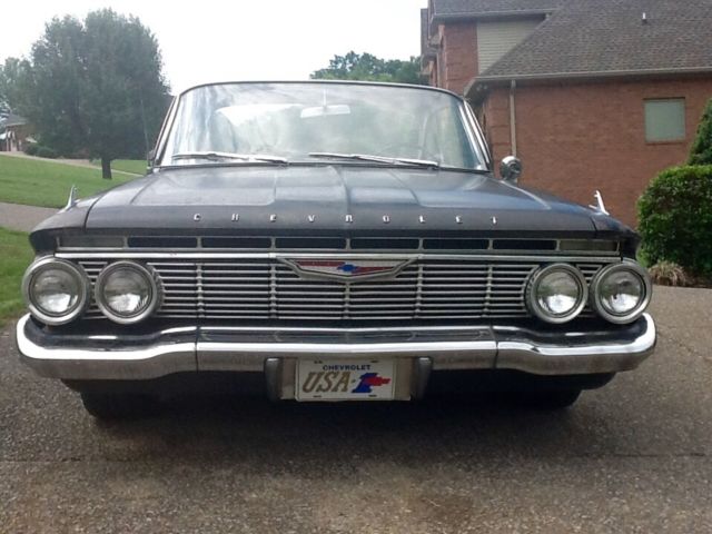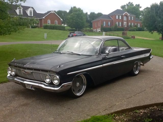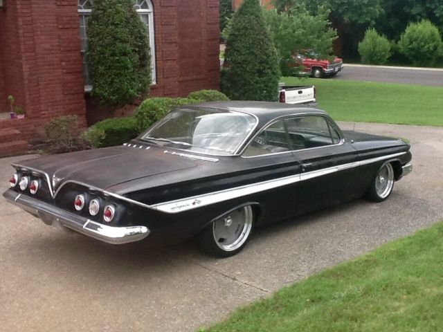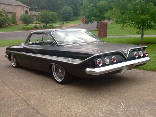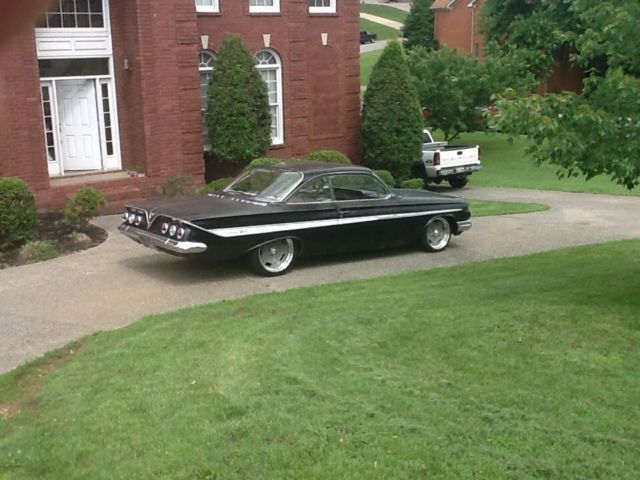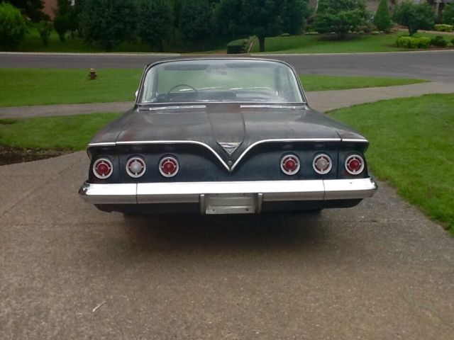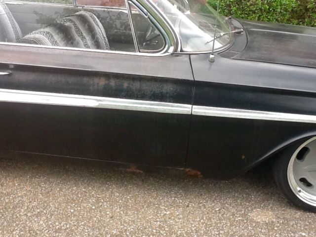 | 1961 Impala matching numbers 235 6cyl 3 speed on the column 74k mile all original and 100% complete car. Black with gray interior. The body only appears to have only had paint work on the lower half and some work on the lower quarters does not appear to ever been hit and is as straight arrow down the side with no dents anywhere on the body. Does have some rust in the passenger rocker panel and the bottoms of both fenders floor pans could use some patching trunk pan is real nice as is the doors hood and trunk lid. All the stainless trim is in great shape the glass is all good and windows roll up and down as they should and the grill is perfect. The interior is all original the seat cloth is coming apart carpet is showing its age and the headliner is in great shape I have thrown some gray mexican blankets over the seats which look pretty cool.The dash and all components are in place and in great shape and EVERYTHING works even the interior light still comes on when you open the doors. The trunk has a new NOS mat in it along with the spare jackbase and lug wrench.This car had been stored for about 25 years when I purchased it I went thru the brakes put in a new fuel tank and sending unit rebuilt the carb new hoses changed all the fluids and installed new exhaust.Rolling on brand new American Racing Salt Flats 20x9.5 on the rear and 18x8 up front skinned with new tires 275/35/20 on the rear and 225/40/18 up front. I do have the original wheels and hubcaps that can on the car when new.This ole car runs drives stops and hits the road nicely and gets more attention than a $50000 frame off resto does andwith the look and stance it carries its just simply BAD ASS!No Emails PleaseCall or text 6158-289-8756Thanks |