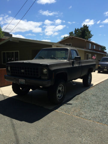 | 1976 Chevrolet 3/4 ton four wheel drive truck Registered till 10/2015 Smog done (have receipt) complete drive train rebuilt motor 350 trans automatic locking hubs 4" lift with shocks new tires and rims remote control winch hoist new stereo and speakers The dash pad and panels were removed and a rubber cover placed on the dash frame with openings to expose the gauges I have the original dash parts that come with the truck. This truck drives and performs perfect ready for off road hunting carry anything ! Give me a call if interested (925) 446-0110 Thanks |